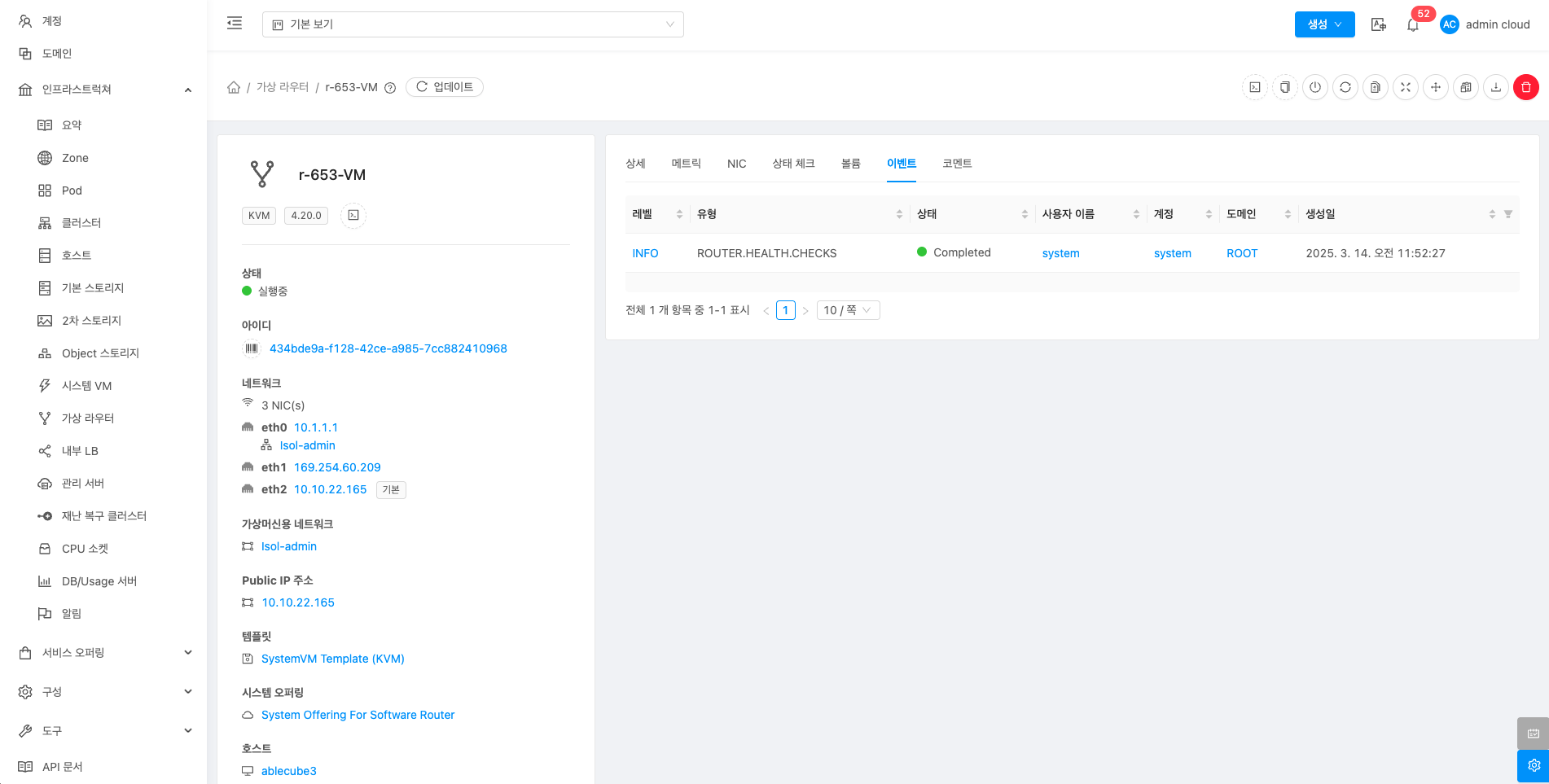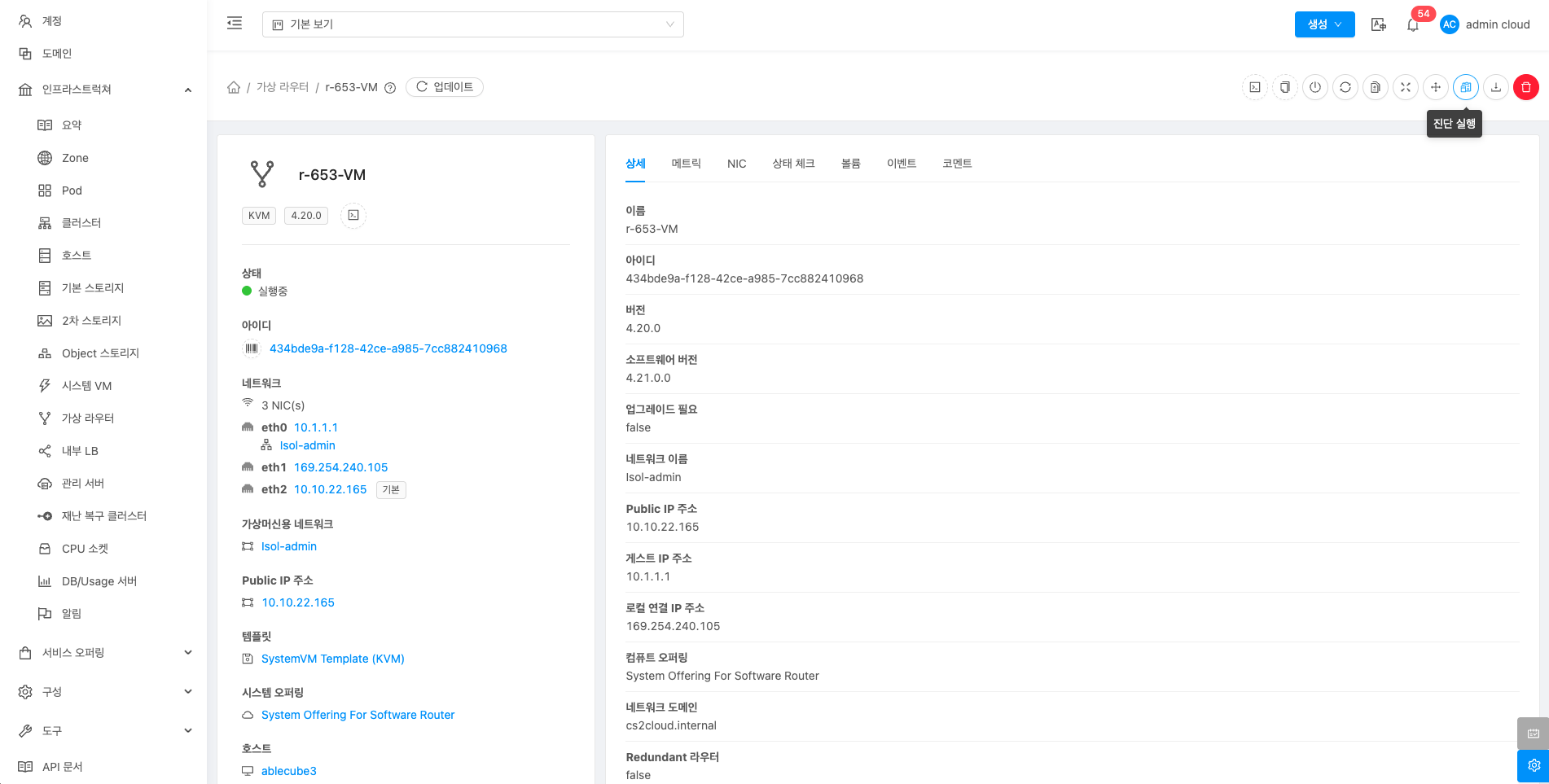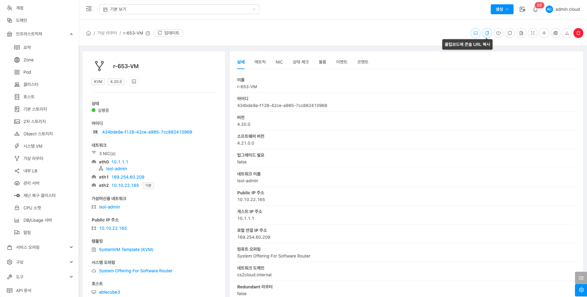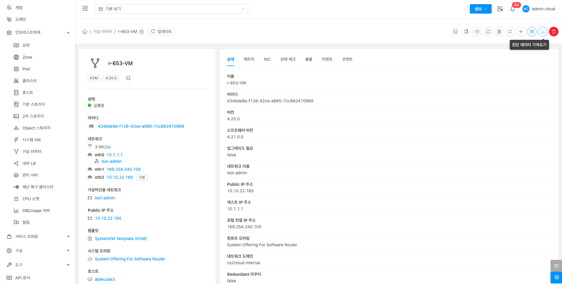 가상 라우터에 대한 상세정보를 조회하는 화면입니다. 해당 가상 라우터의 이름, 아이디, 버전, 소프트웨어 버전, 업그레이드 필요, 네트워크 이름, Public IP 주소, 게스트 IP 주소, 로컬 연결 IP 주소, 컴퓨트 오퍼링, 네트워크 도메인, Redundant 라우터, Redundant 상태, 호스트, 계정, Zone, 생성일, 제어 영역 상태 등의 정보를 확인할 수 있습니다.