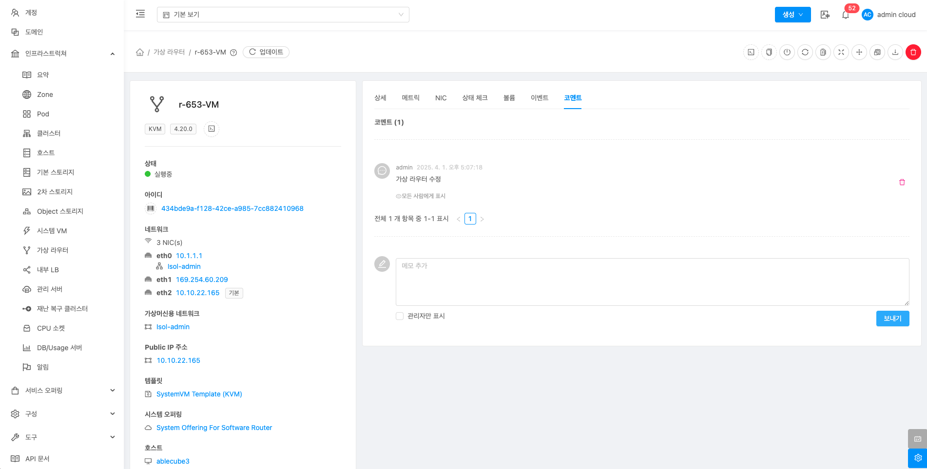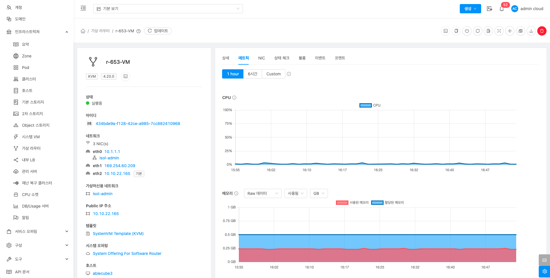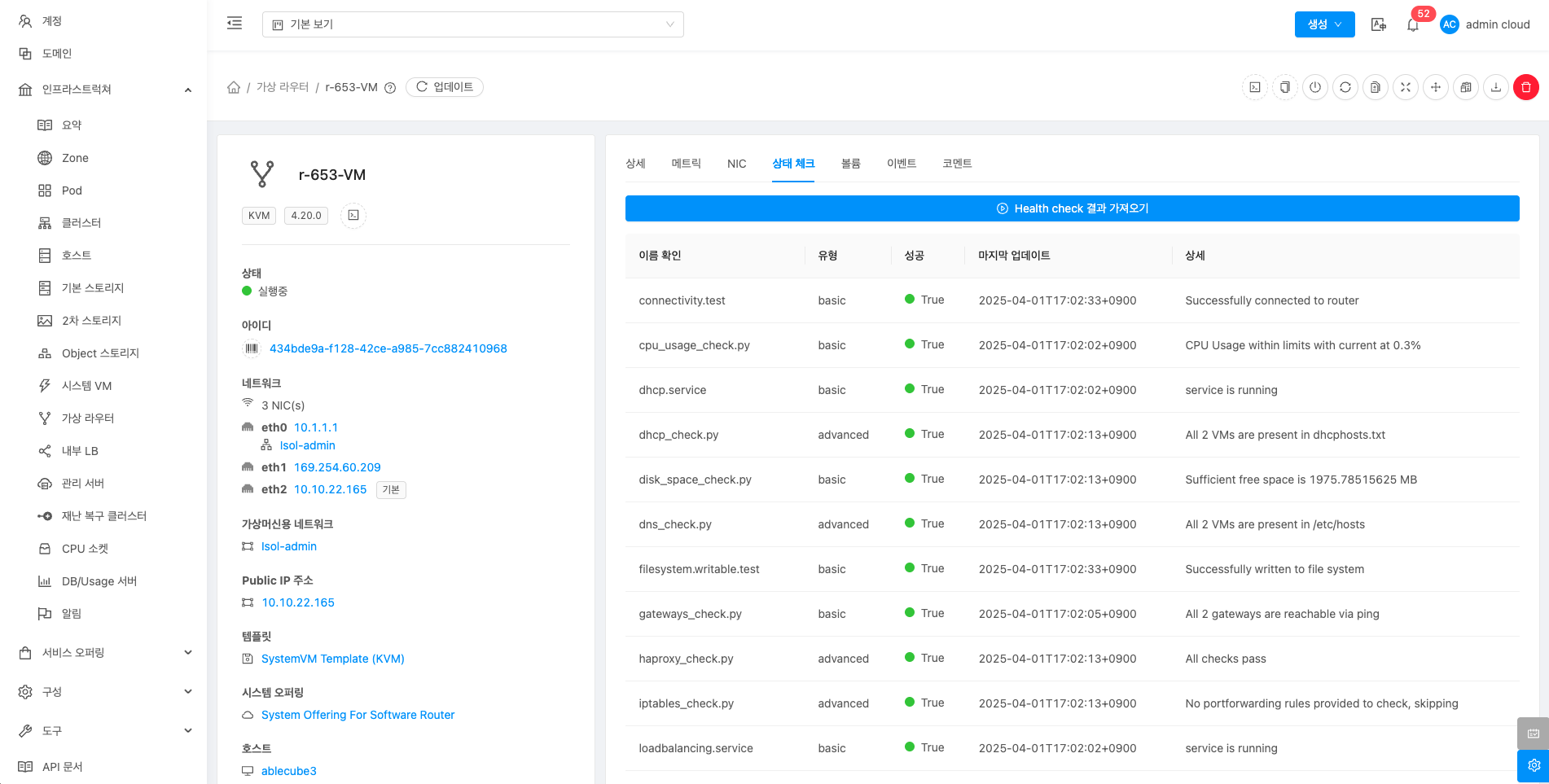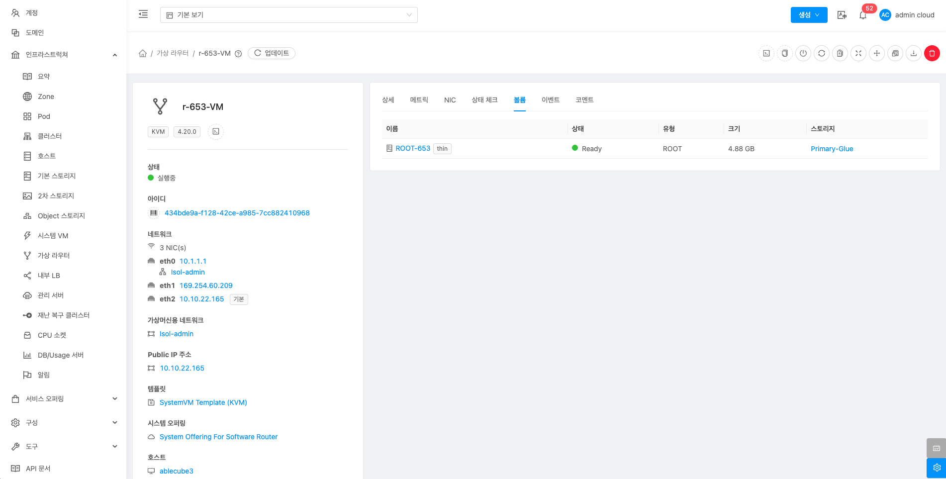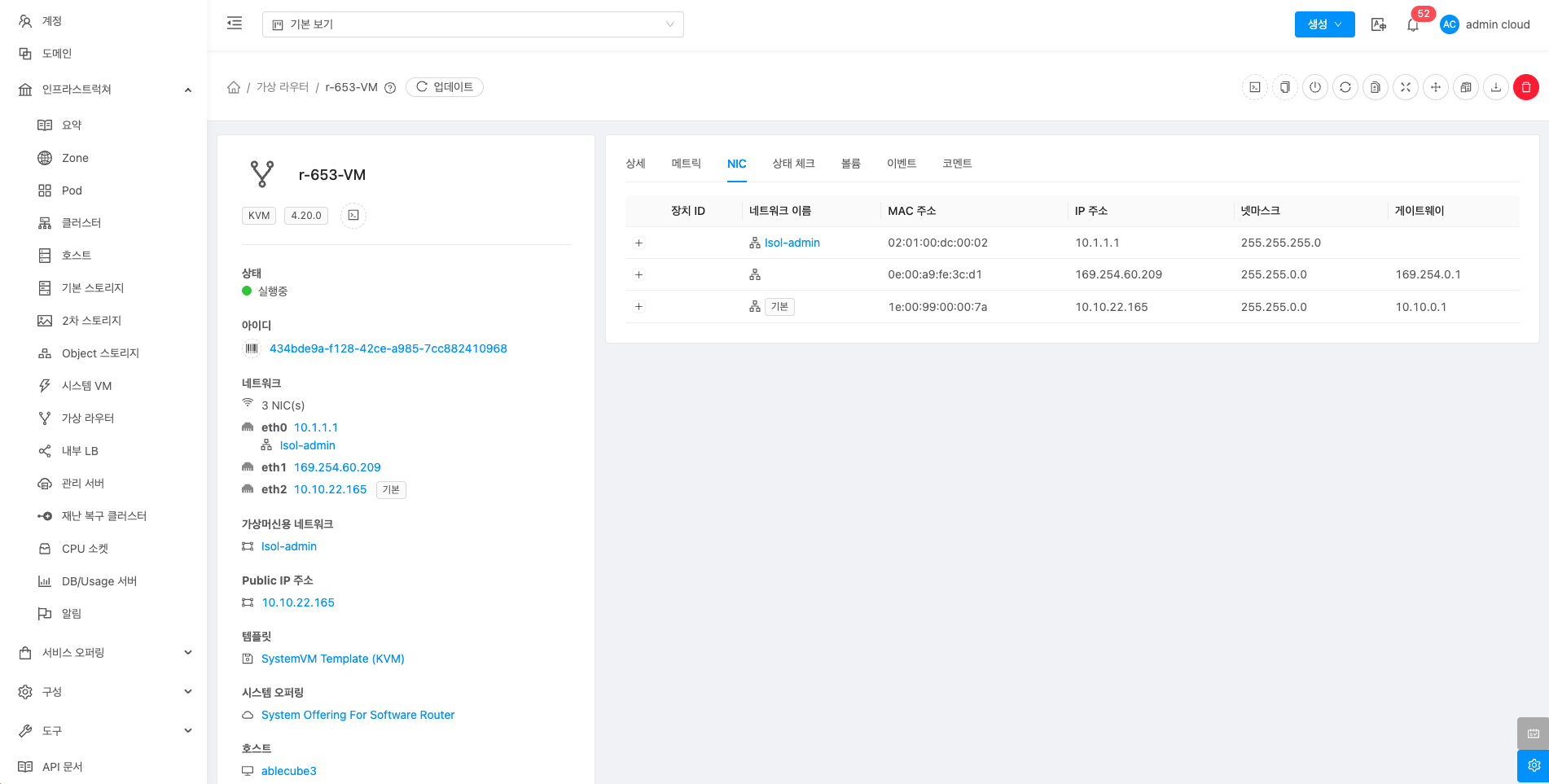 가상 라우터에 대한 상세정보를 조회하는 화면입니다. 해당 가상 라우터의 이름, 아이디, 버전, 소프트웨어 버전, 업그레이드 필요, 네트워크 이름, Public IP 주소, 게스트 IP 주소, 로컬 연결 IP 주소, 컴퓨트 오퍼링, 네트워크 도메인, Redundant 라우터, Redundant 상태, 호스트, 계정, Zone, 생성일, 제어 영역 상태 등의 정보를 확인할 수 있습니다.