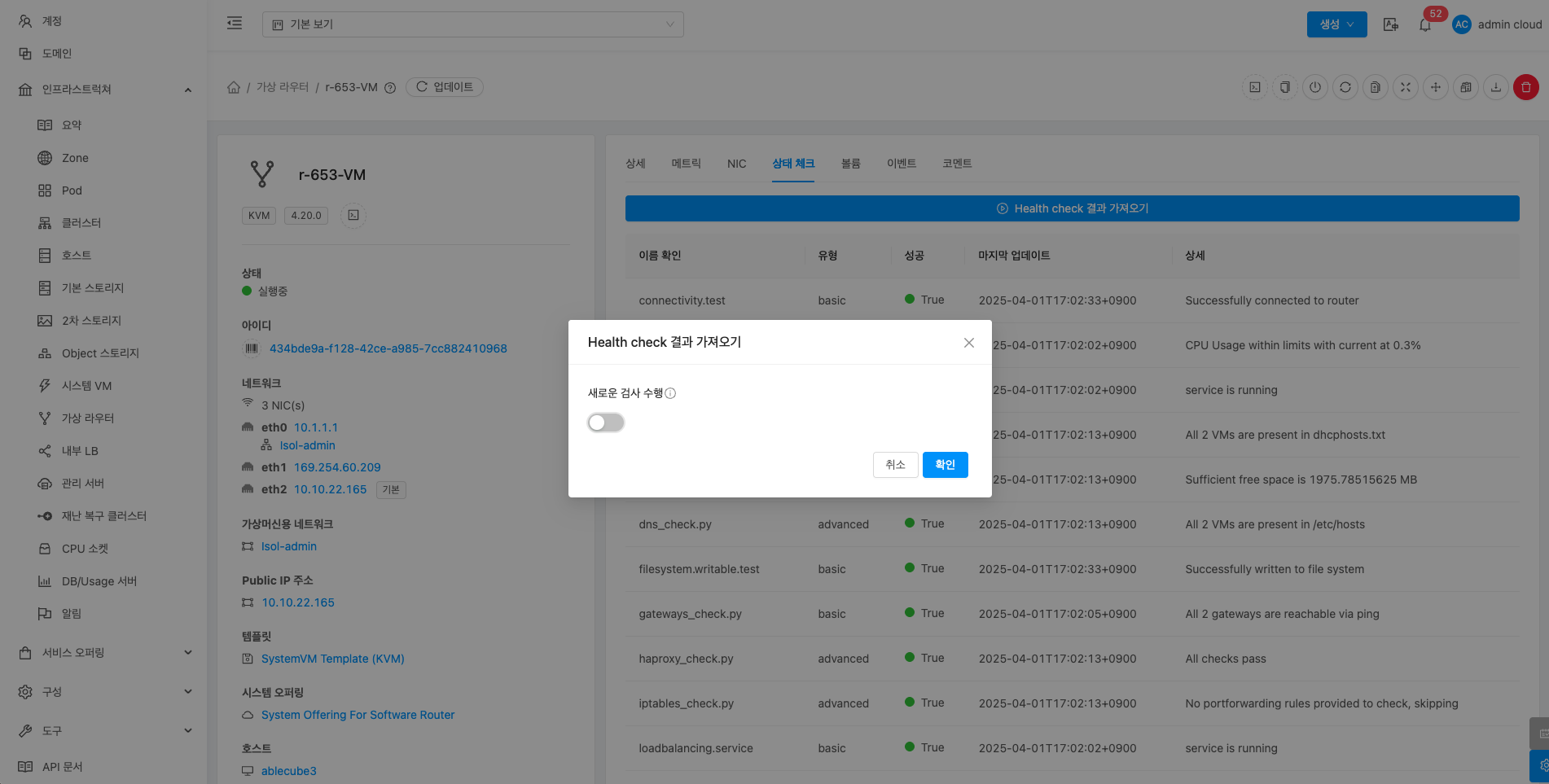 - 확인 버튼을 클릭하여 Health check 결과를 가져옵니다.