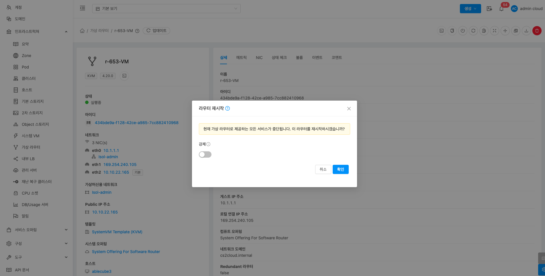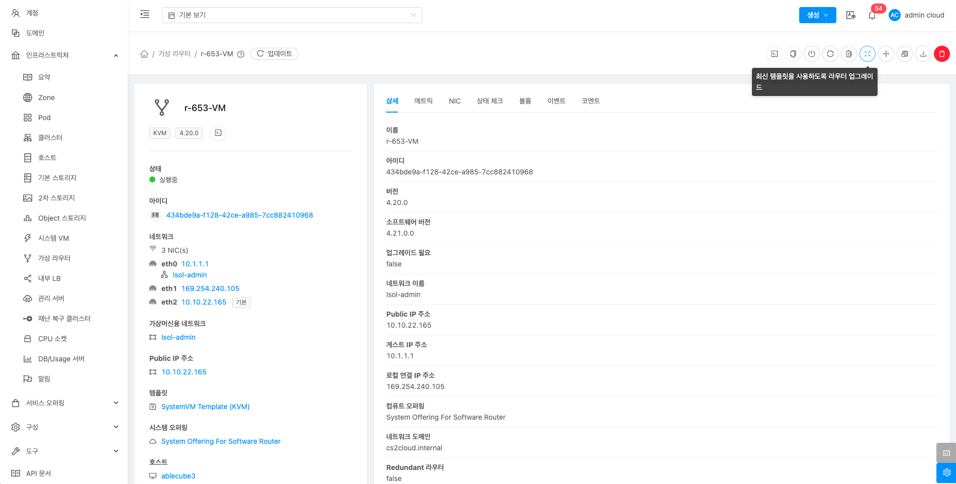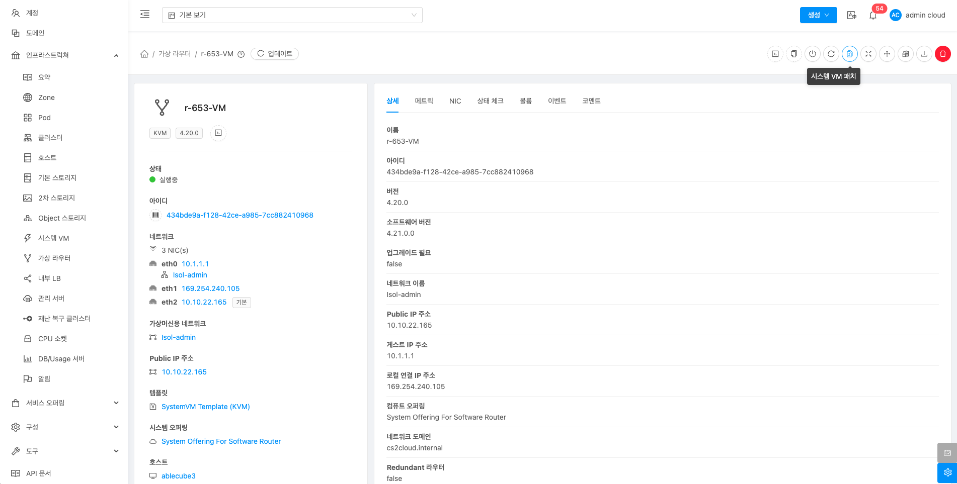 시스템 VM을 패치하여 가상 라우터의 버전을 변경할 수 있습니다.