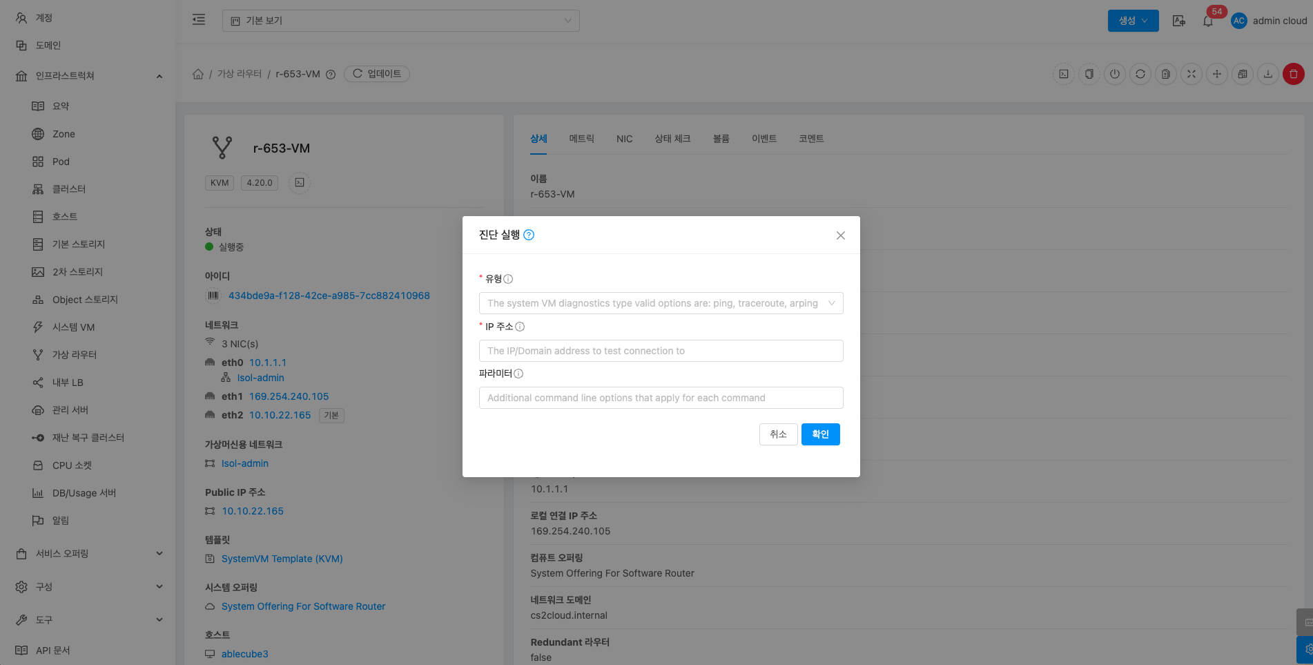 가상 라우터에서 ping, traceroute, arping 등 진단을 실행할 수 있습니다.