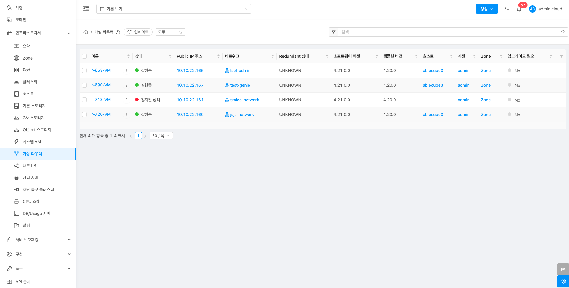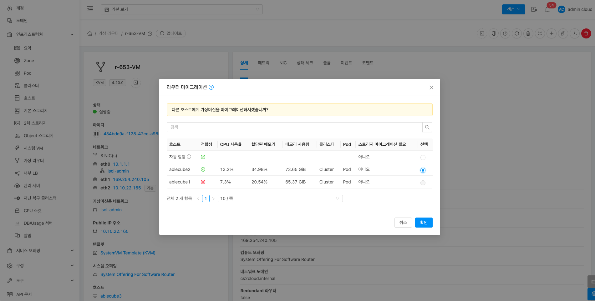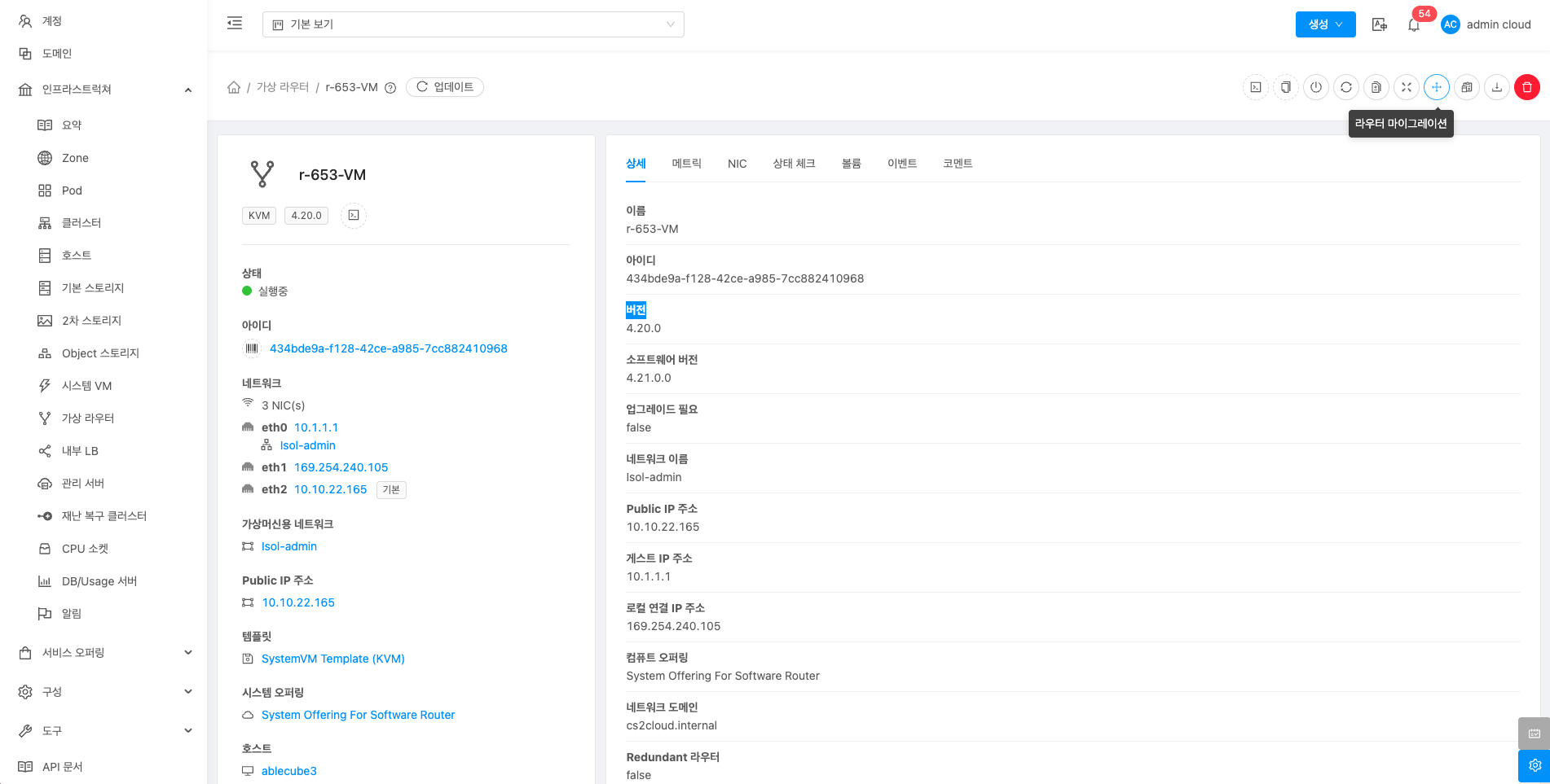 - 가상 라우터 마이그레이션 버튼을 클릭하여 가상 라우터 마이그레이션 화면을 호출합니다.