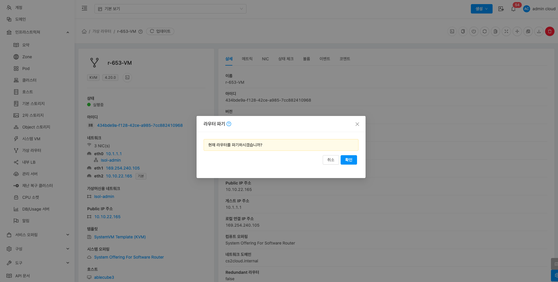 가상 라우터를 삭제하더라도 해당 네트워크가 활성화 되어있으면 다시 생성됩니다.
