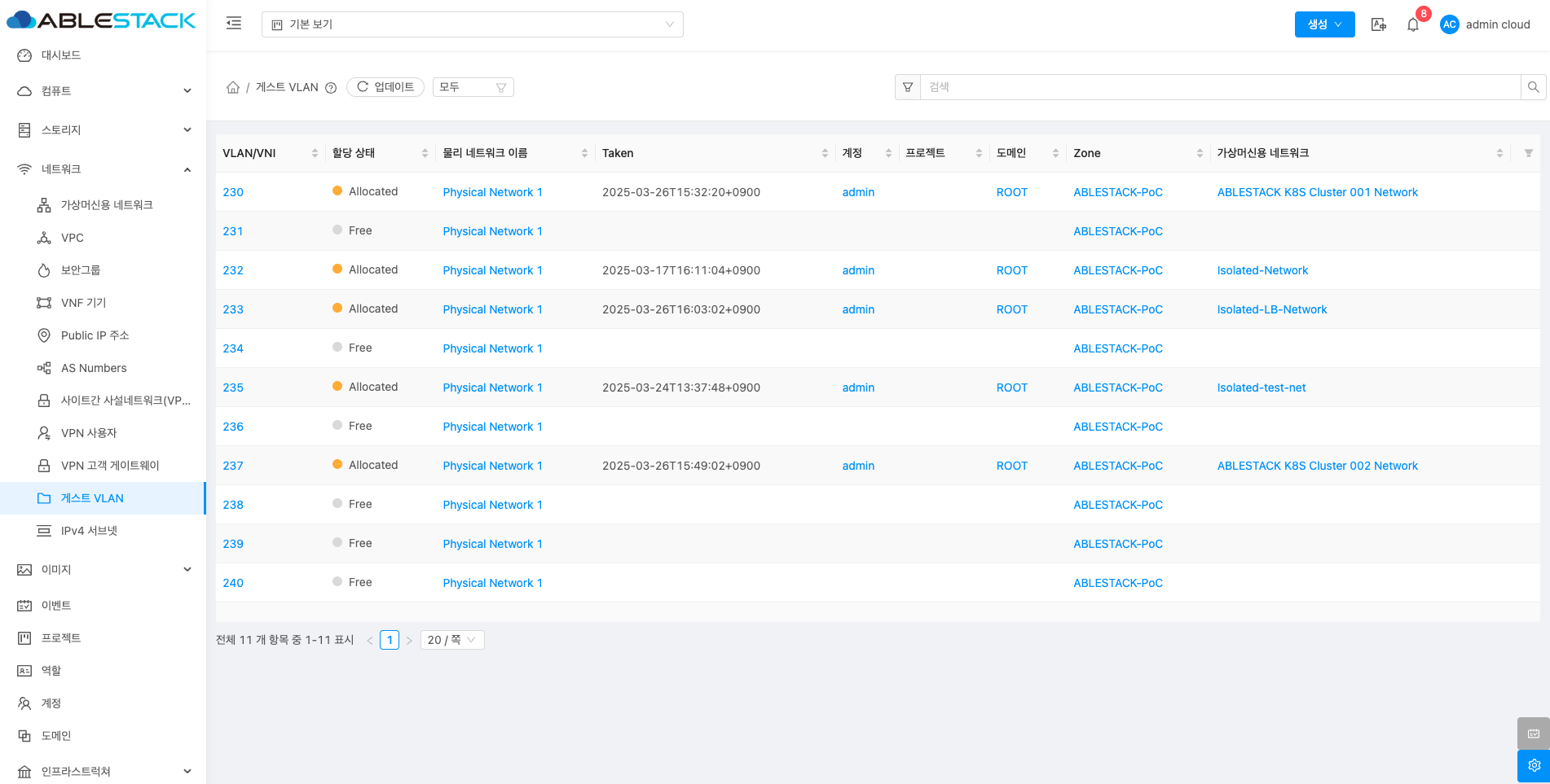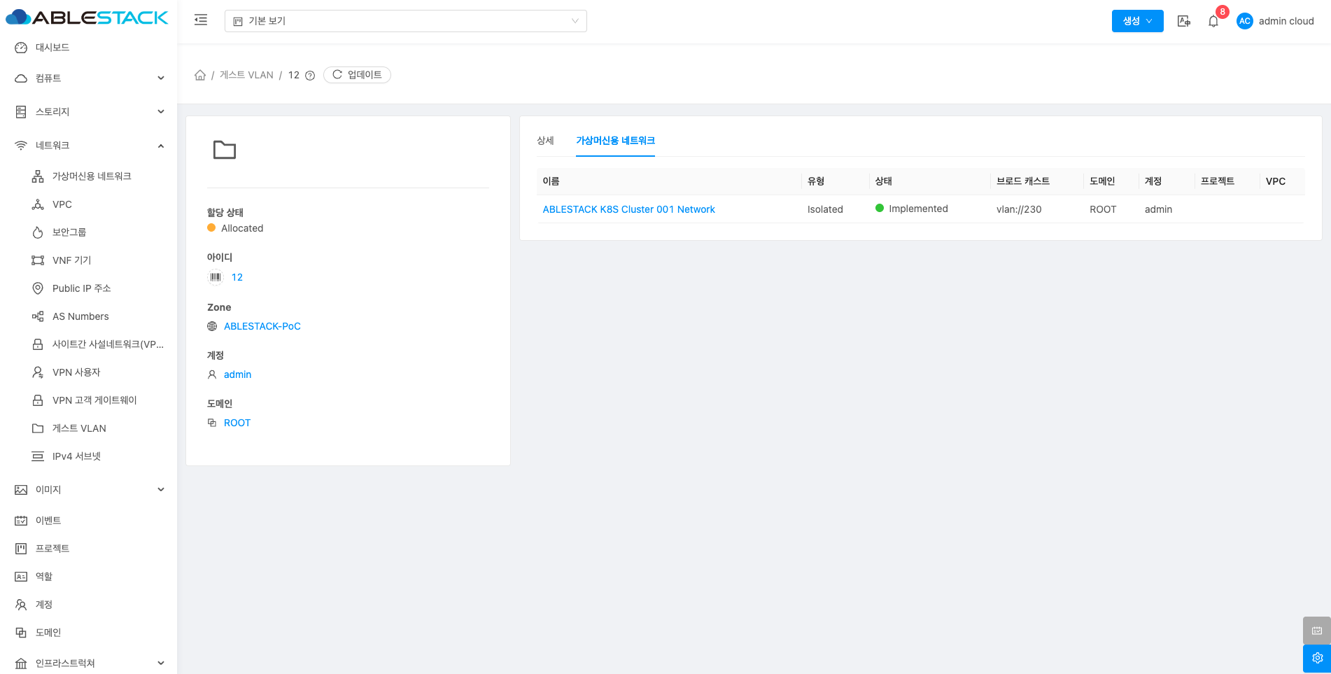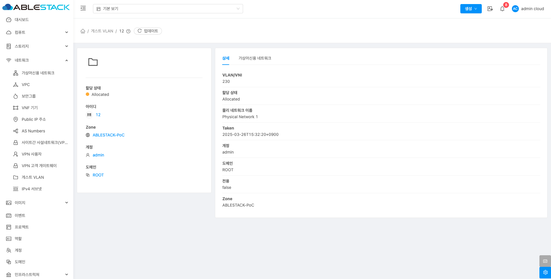 게스트 VLAN에 대한 상세정보를 조회하는 화면입니다. 해당 게스트 VLAN의 VLAN/VNI, 할당, 상태, 물리 네트워크 이름, Taken, 계정, 도메인, 전용, Zone 등의 정보를 확인할 수 있습니다.