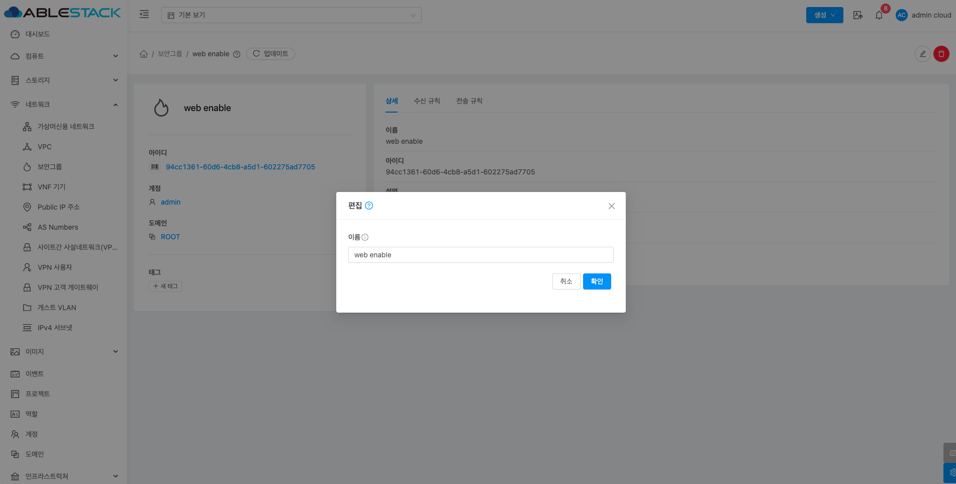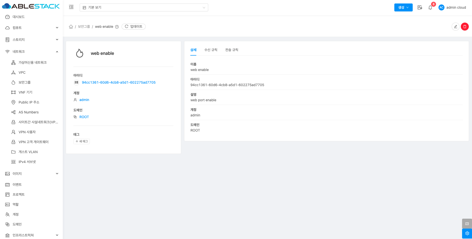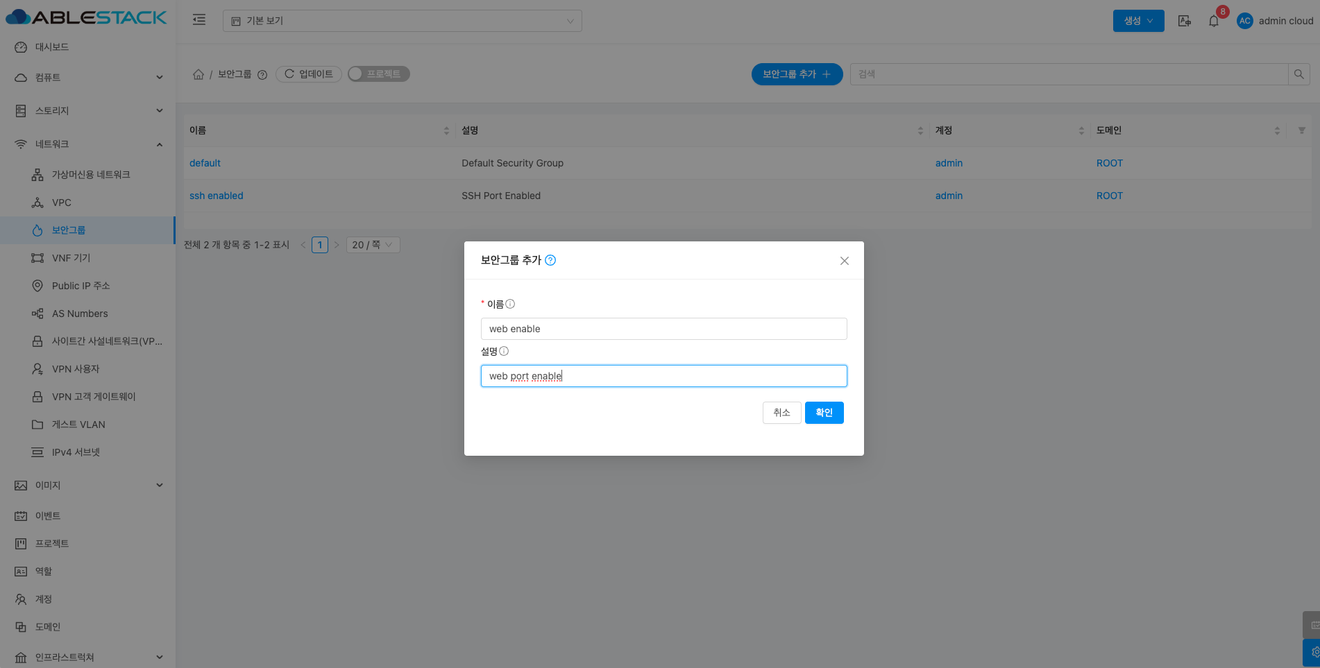 - 확인 버튼을 클릭하여 보안그룹을 생성합니다.