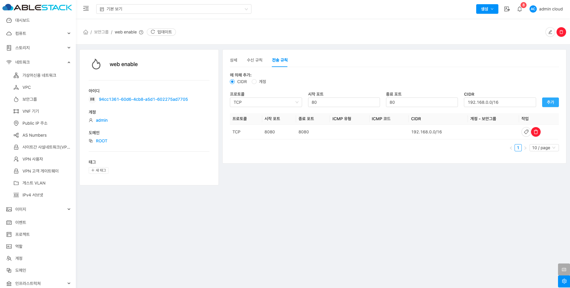 보안 그룹에 대한 전송 규칙을 조회 및 관리하는 화면입니다. 해당 보안 그룹의 프로토콜, 시작 포트, 종료 포트, ICMP 유형, ICMP 코드, CIDR 등의 정보를 확인할 수 있습니다.