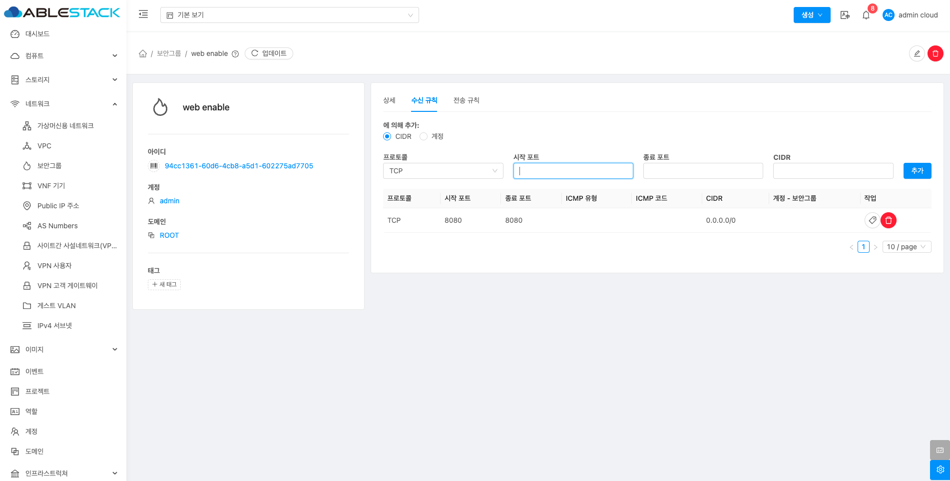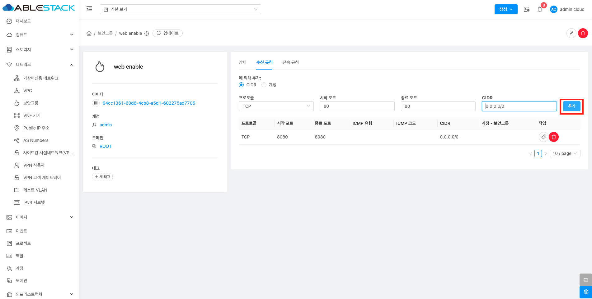 - CIDR: CIDR를 입력합니다.