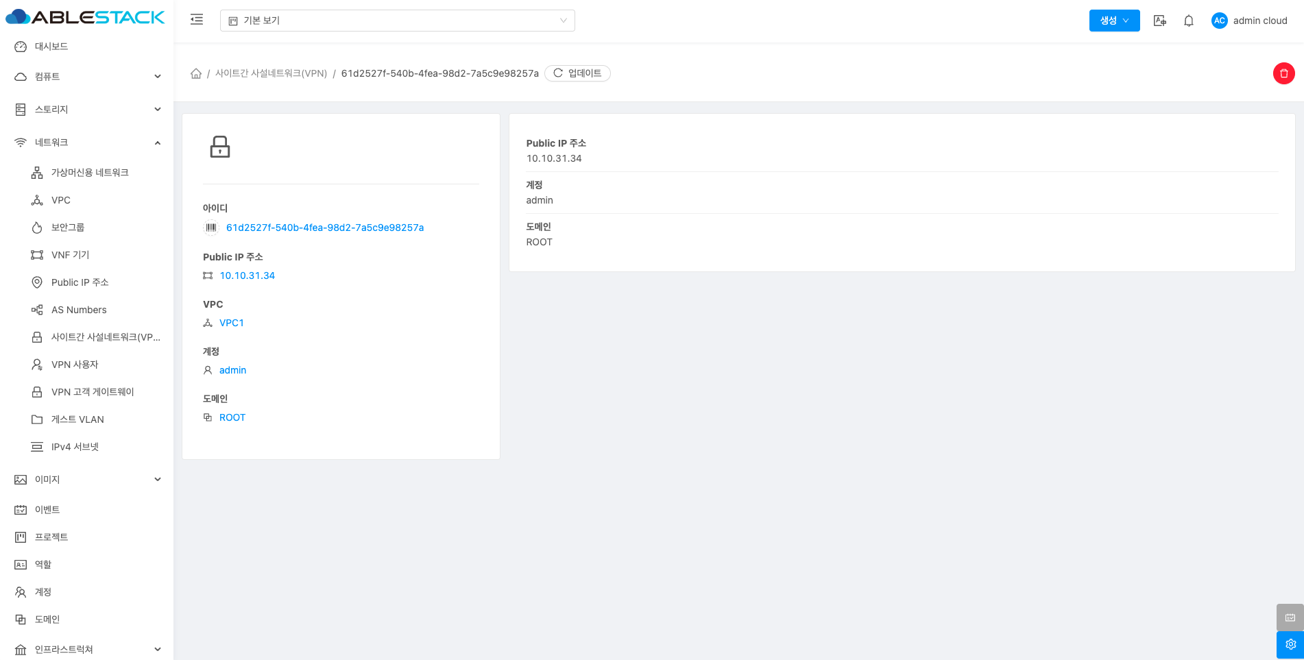 Site-to-site VPN은 고객의 데이터 센터와 ABLESTACK 클라우드 인프라 간에 안전한 연결을 만들어 줍니다. 이를 통해 데이터 센터의 장치에서 VPN을 이용해 ABLESTACK 클라우드의 가상 라우터와 연결하고 그 안의 가상머신에 접근할 수 있습니다. 또한 두 개의 VPC나 고가용성 영역 간에 안전한 연결을 설정할 수 있어 개별 VM에 직접 연결할 필요가 없습니다. 원격 VPN과의 차이점은 Site-to-site VPN이 전체 네트워크를 연결한다는 점이며, 각 호스트는 VPN 클라이언트 없이 VPN 게이트웨이를 통해 데이터를 주고받습니다.