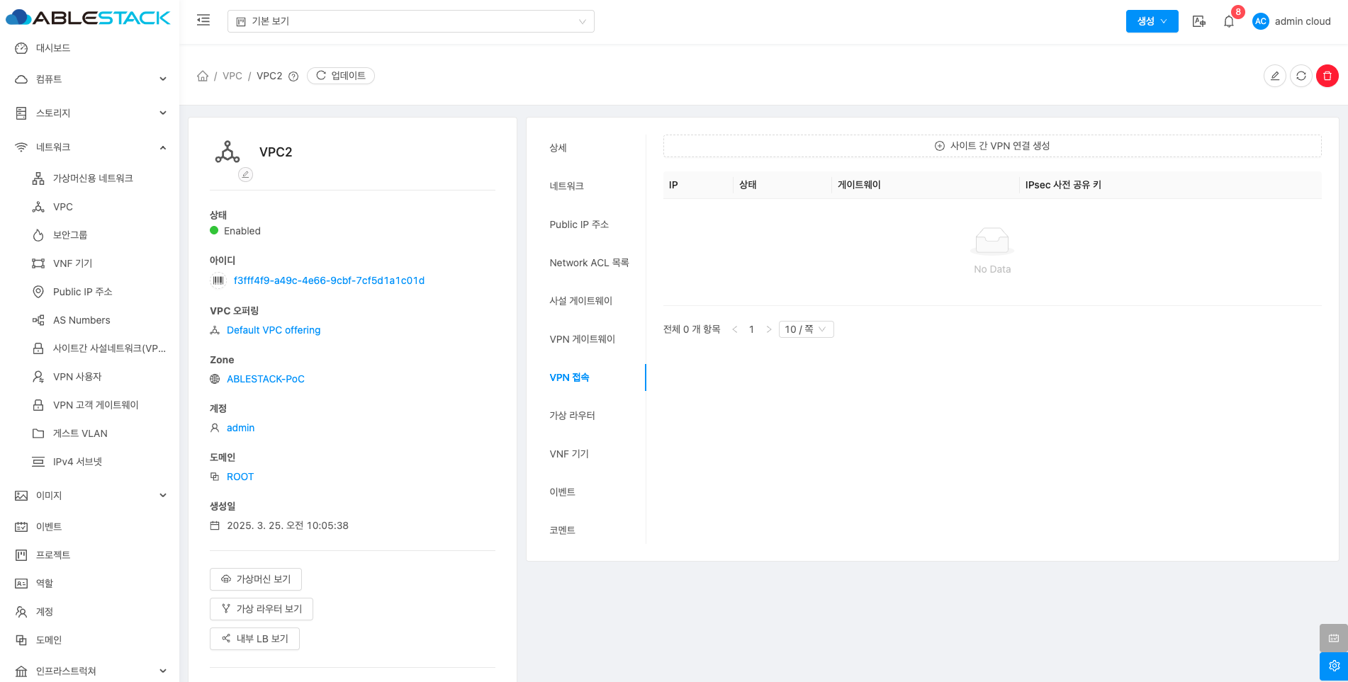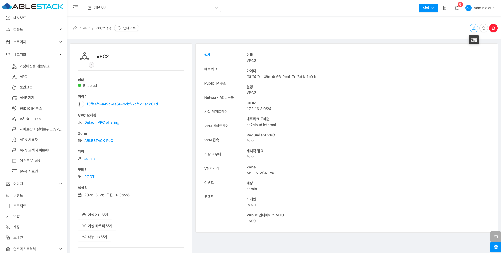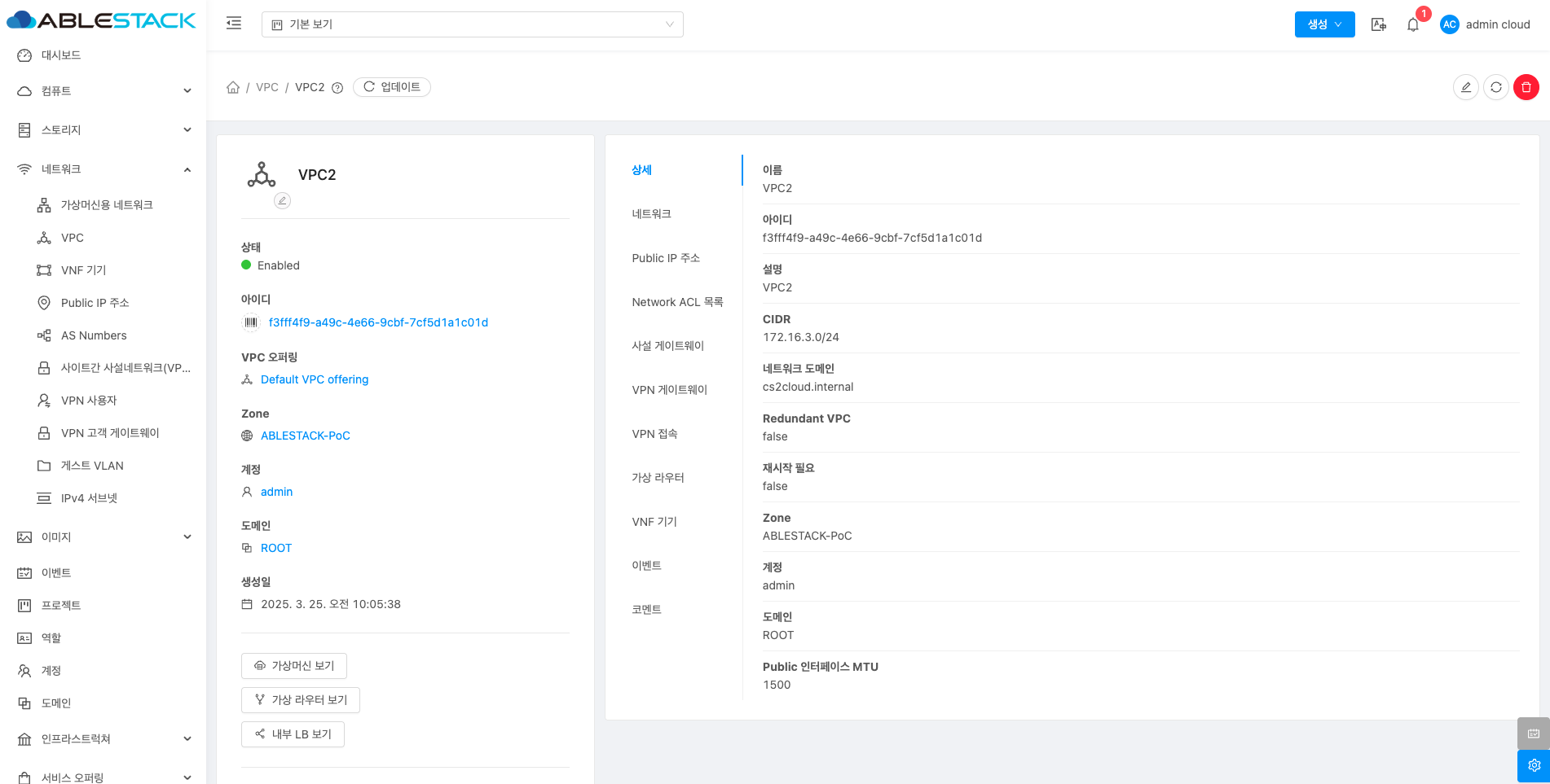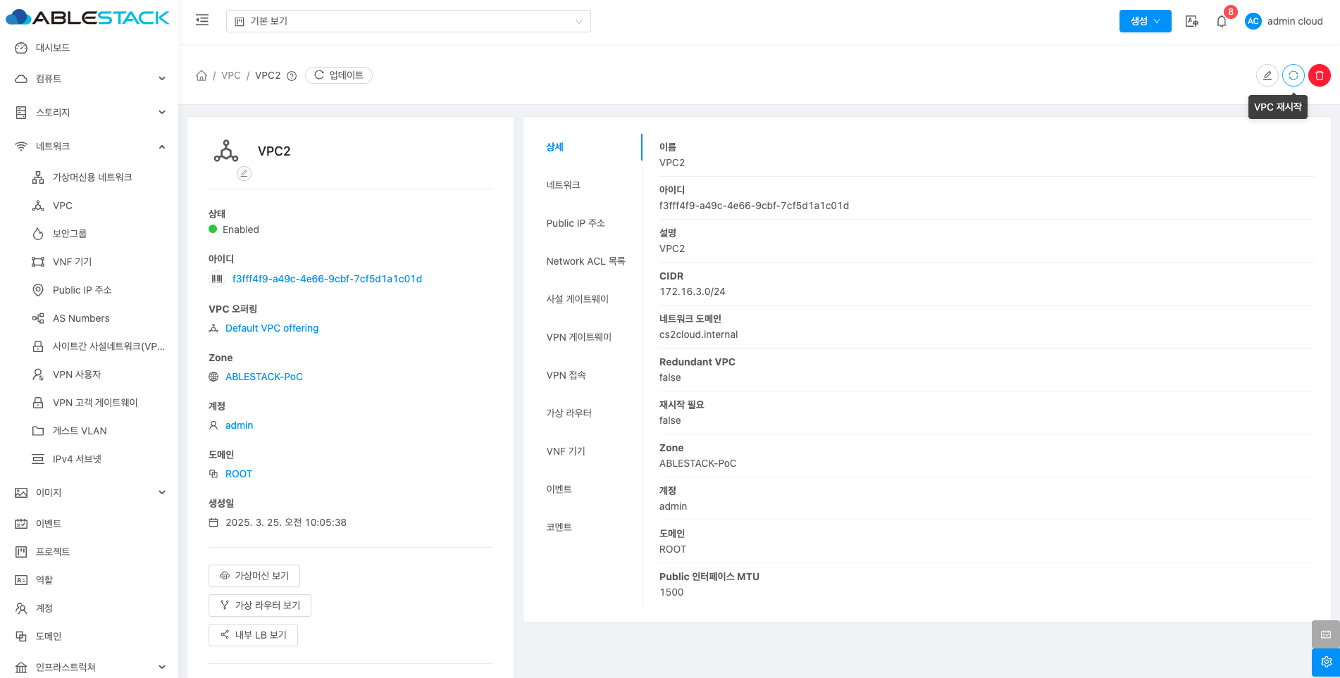 VPC에 대한 상세정보를 조회하는 화면입니다. 해당 VPC의 이름, 아이디, 설명, CIDR, 네트워크 도메인, Redundant VPC, 재시작 필요, Zone, 계정, 도메인, Public 인터페이스 MTU 등의 정보를 확인할 수 있습니다.