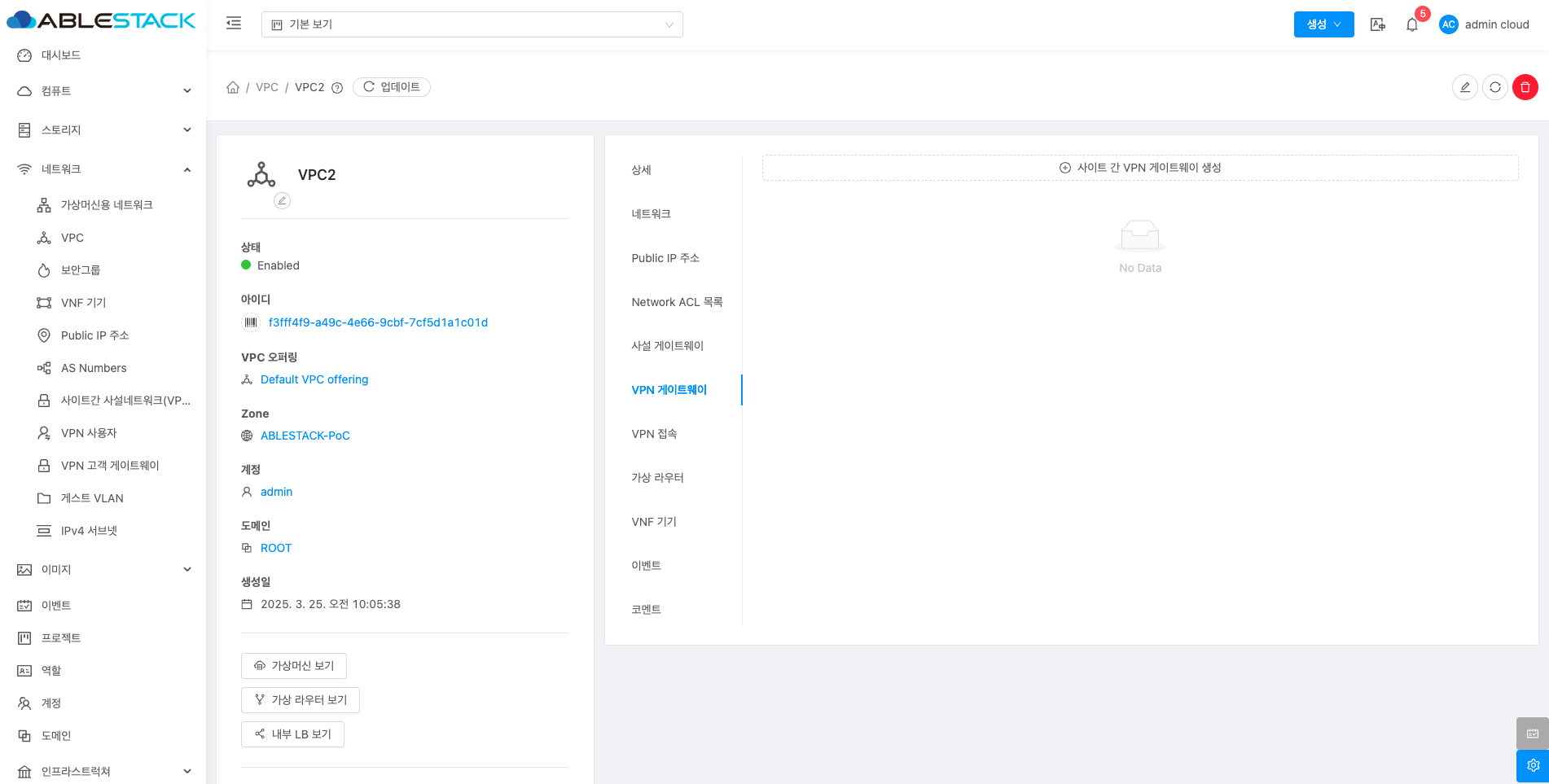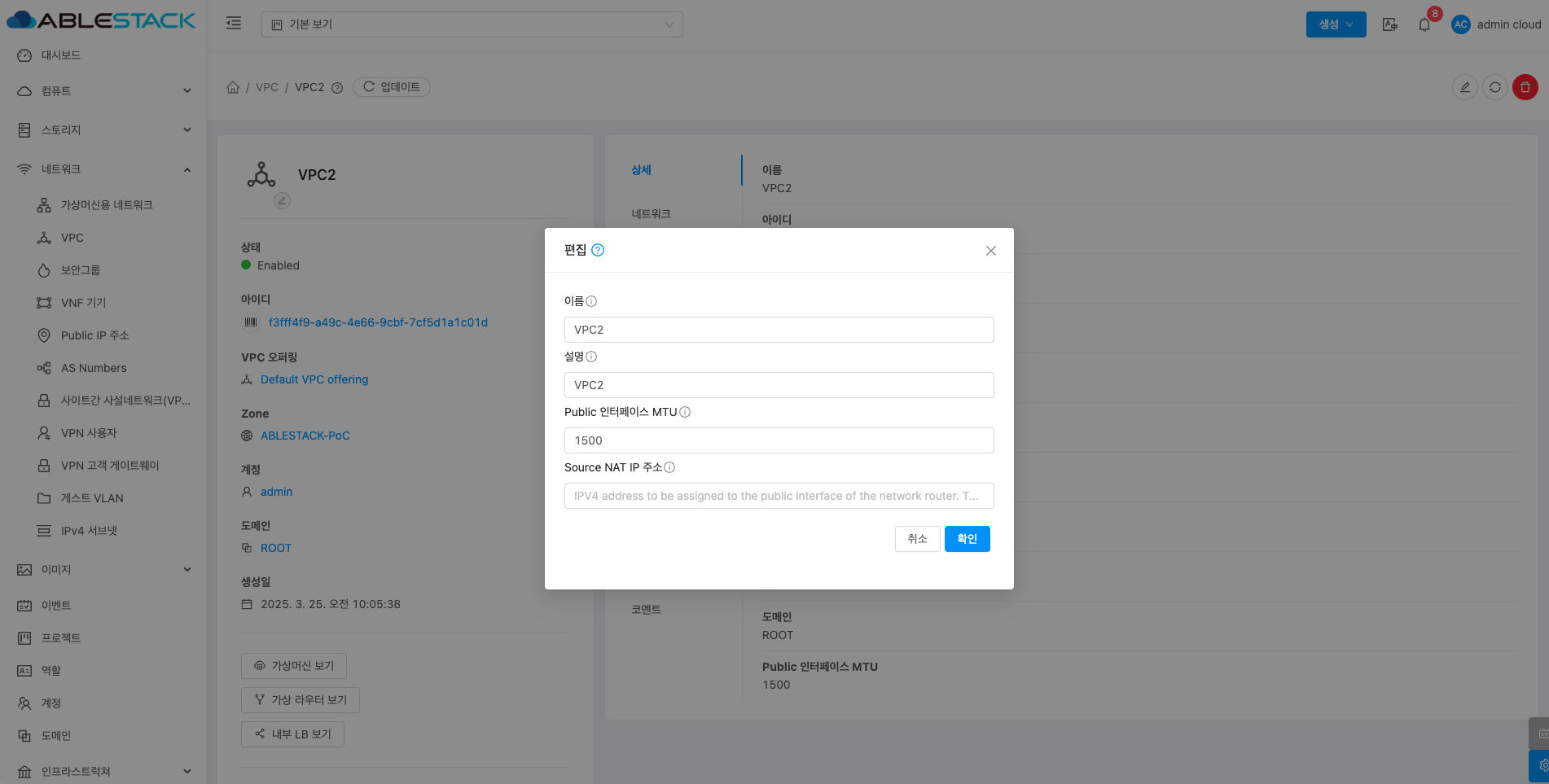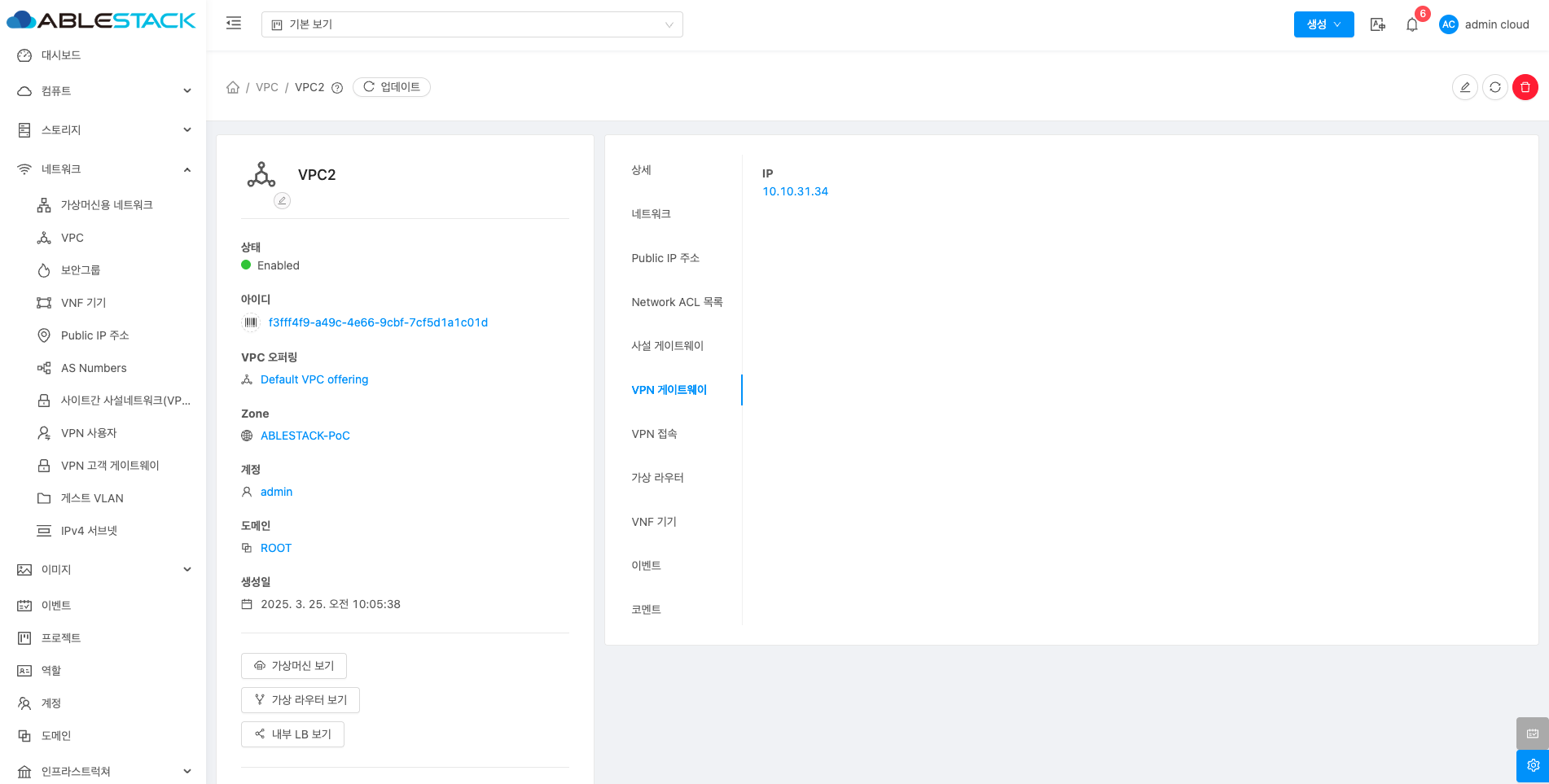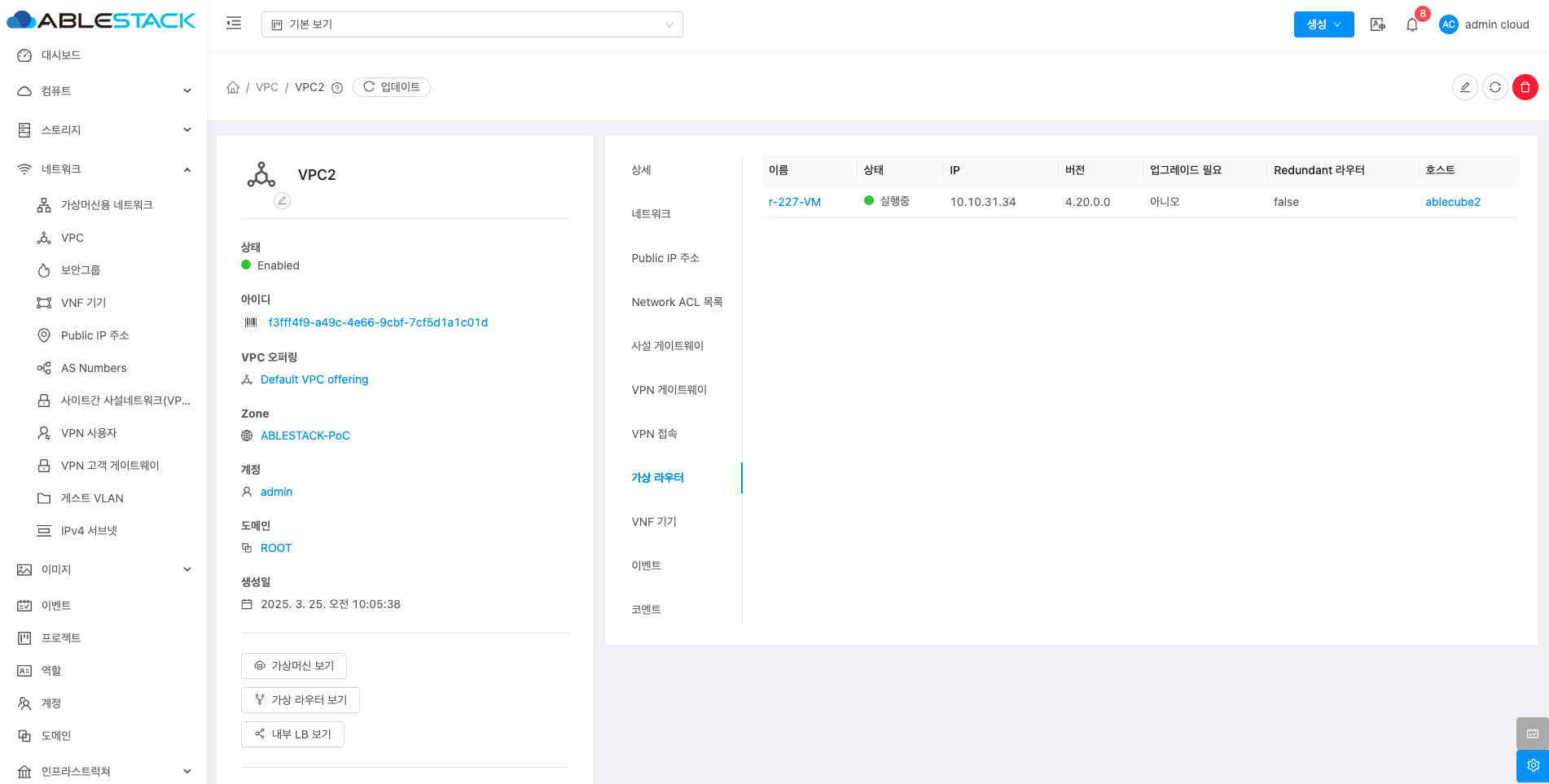 VPC에 대한 상세정보를 조회하는 화면입니다. 해당 VPC의 이름, 아이디, 설명, CIDR, 네트워크 도메인, Redundant VPC, 재시작 필요, Zone, 계정, 도메인, Public 인터페이스 MTU 등의 정보를 확인할 수 있습니다.