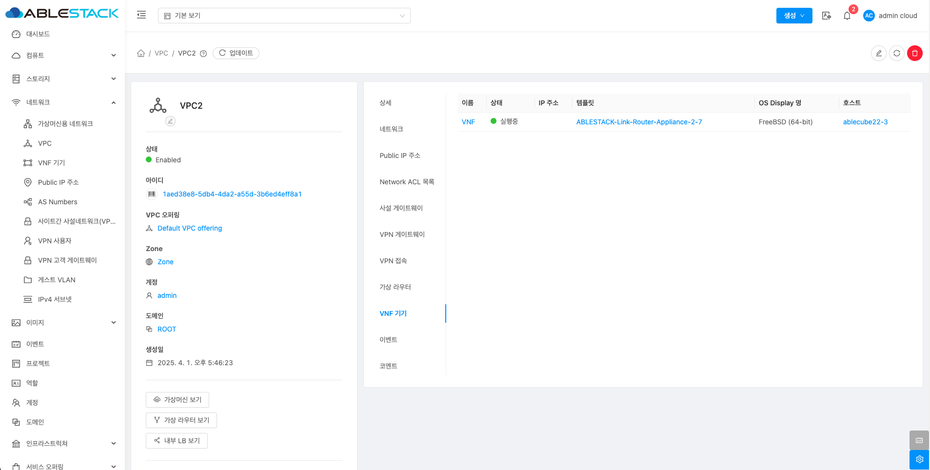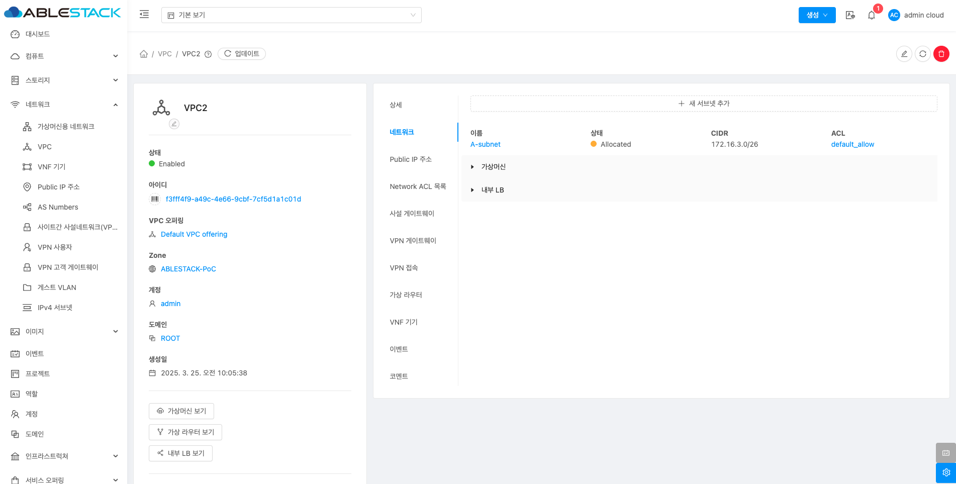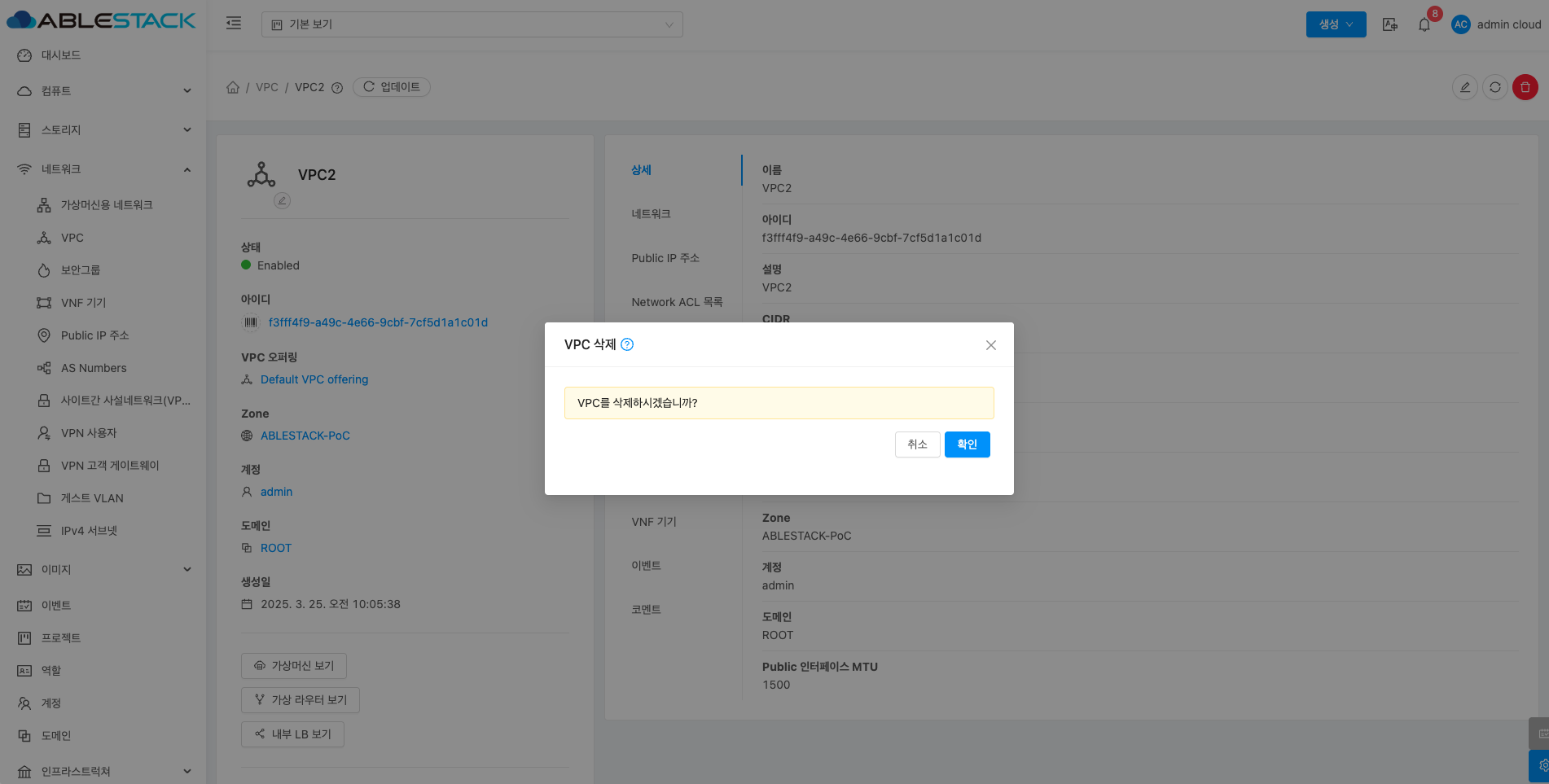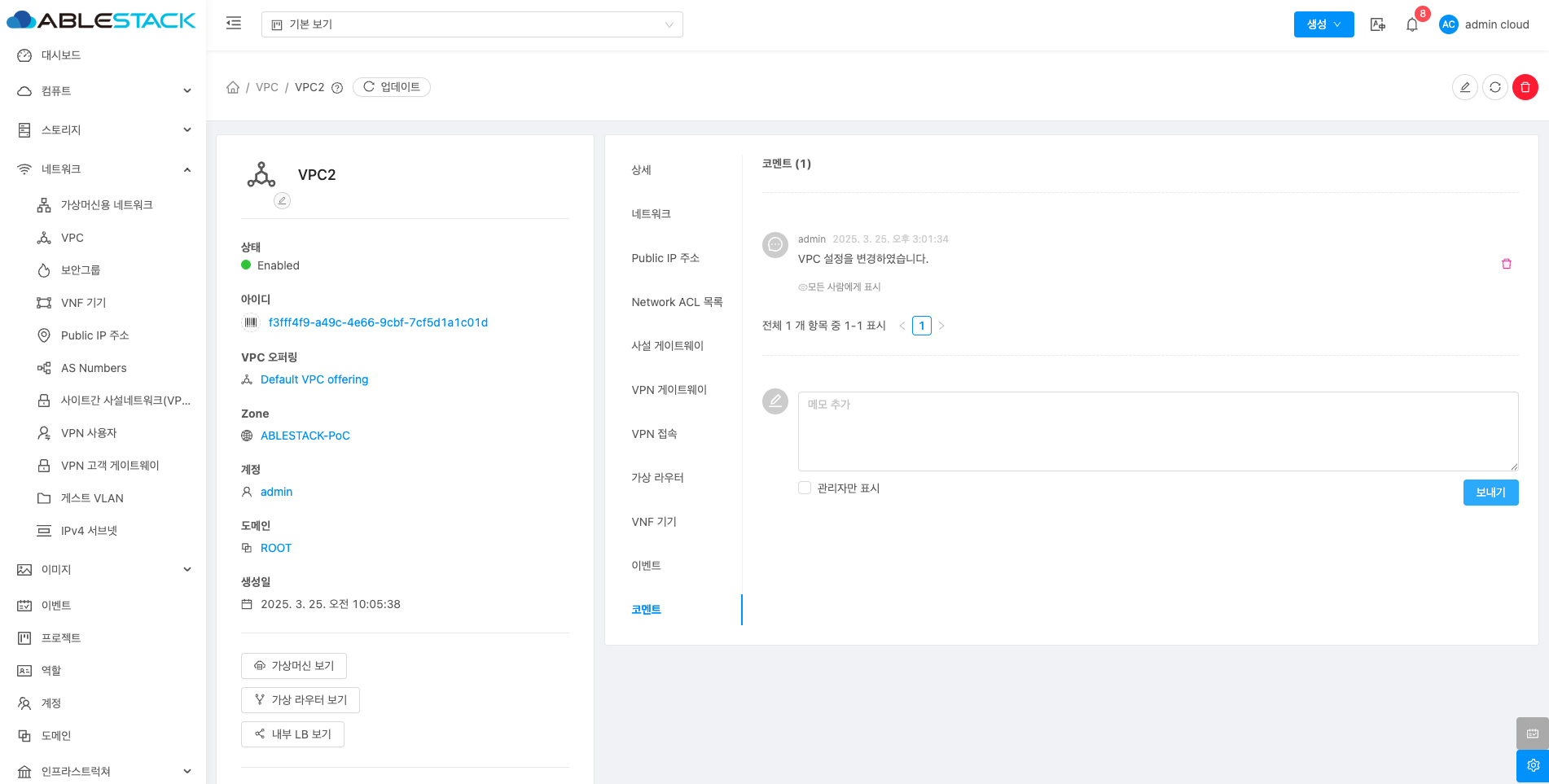 VPC에 대한 상세정보를 조회하는 화면입니다. 해당 VPC의 이름, 아이디, 설명, CIDR, 네트워크 도메인, Redundant VPC, 재시작 필요, Zone, 계정, 도메인, Public 인터페이스 MTU 등의 정보를 확인할 수 있습니다.