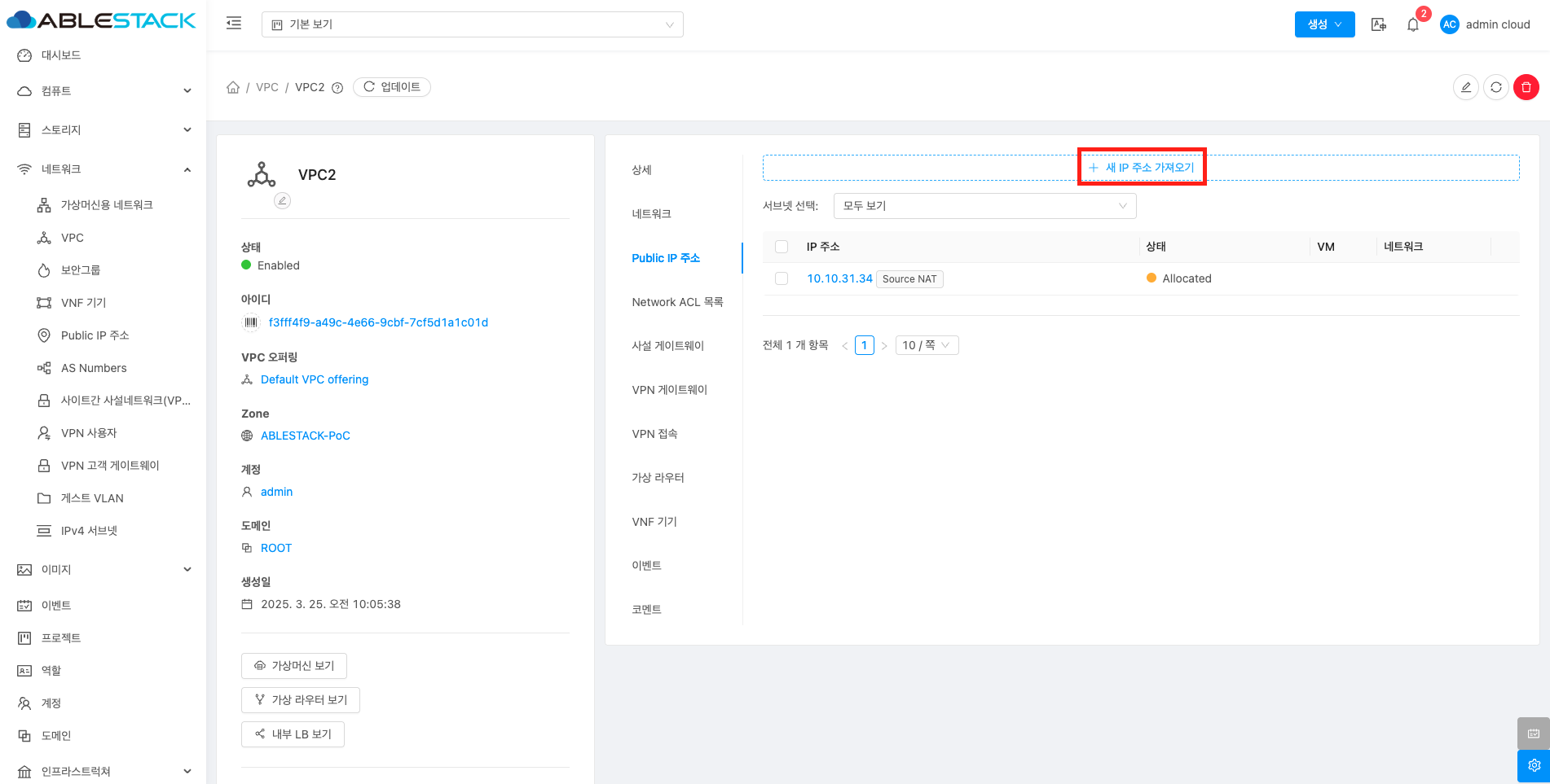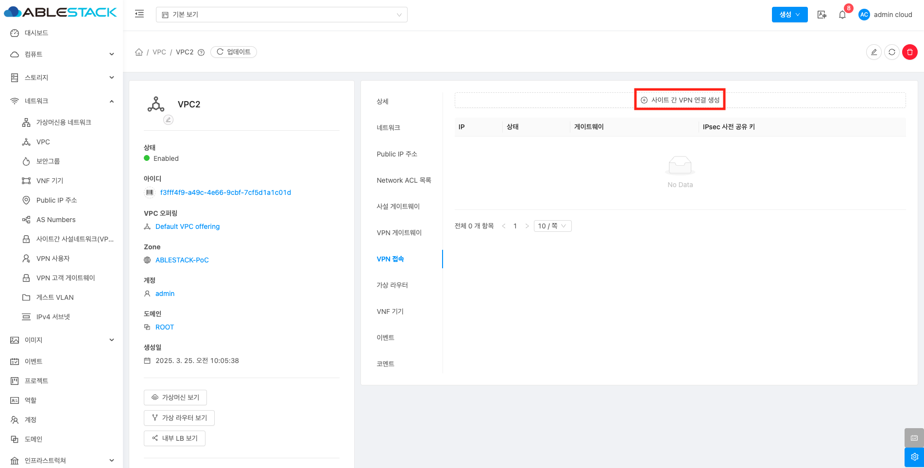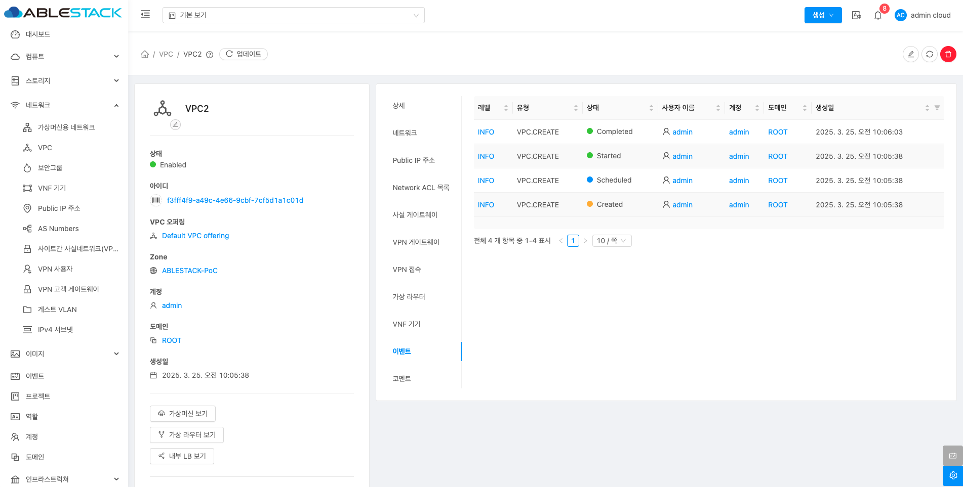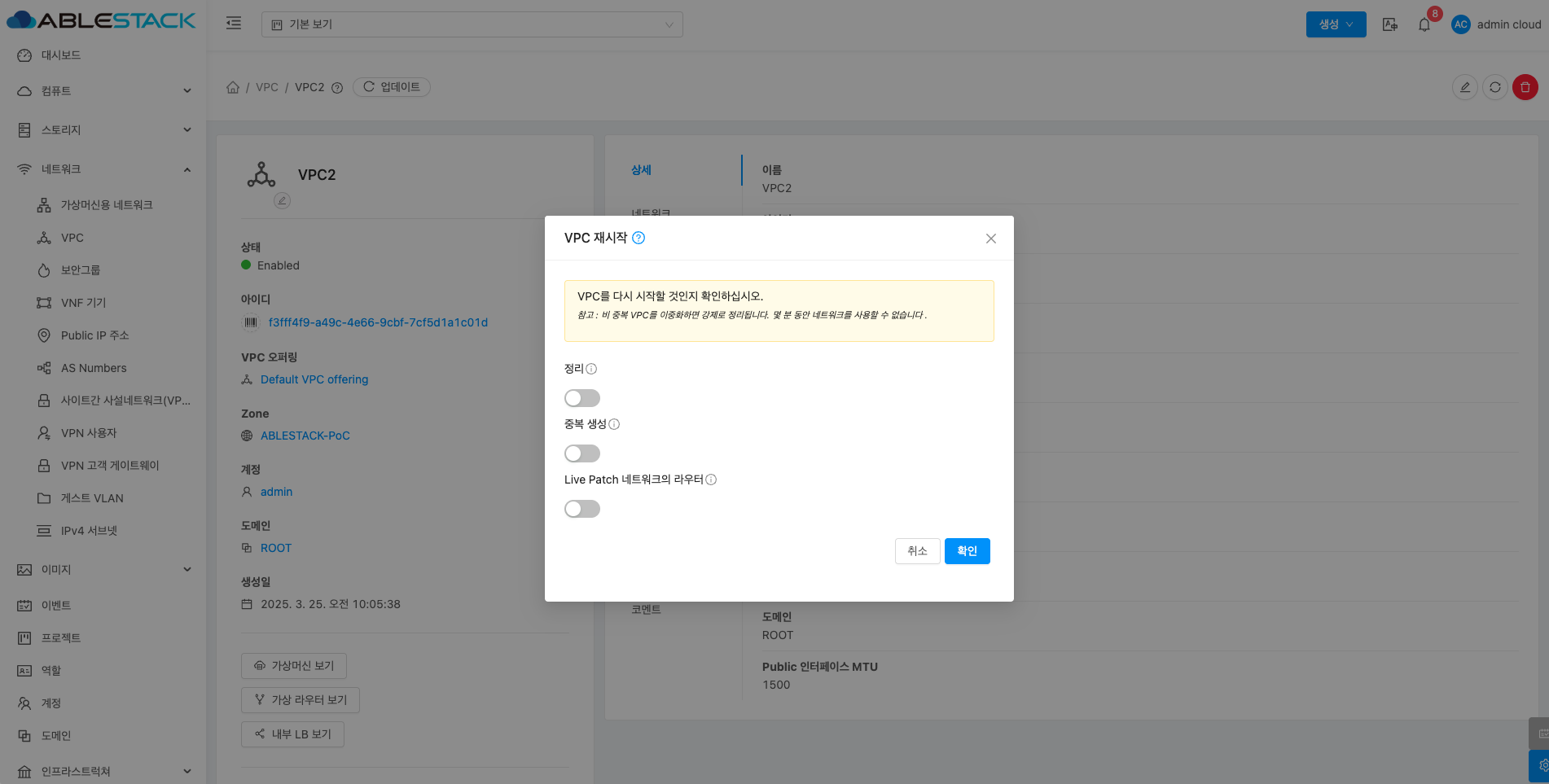 VPC에 대한 상세정보를 조회하는 화면입니다. 해당 VPC의 이름, 아이디, 설명, CIDR, 네트워크 도메인, Redundant VPC, 재시작 필요, Zone, 계정, 도메인, Public 인터페이스 MTU 등의 정보를 확인할 수 있습니다.
