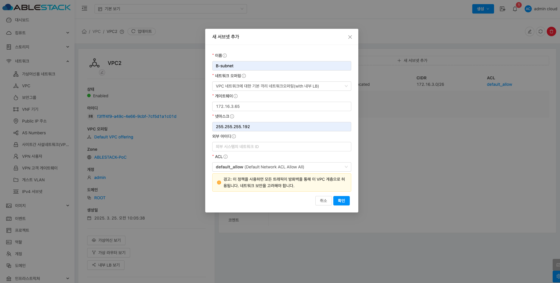 - 확인 버튼을 클릭하여 새 서브넷을 추가합니다.