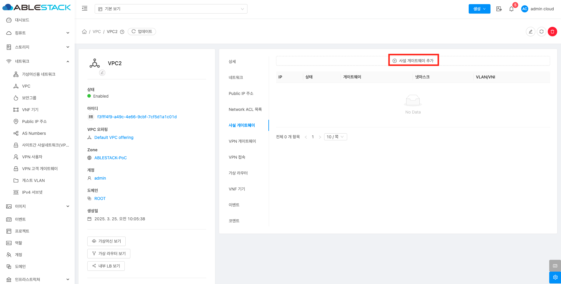 사설 게이트웨이 추가 버튼을 클릭하여 사설 게이트웨이 추가하기 화면으로 이동