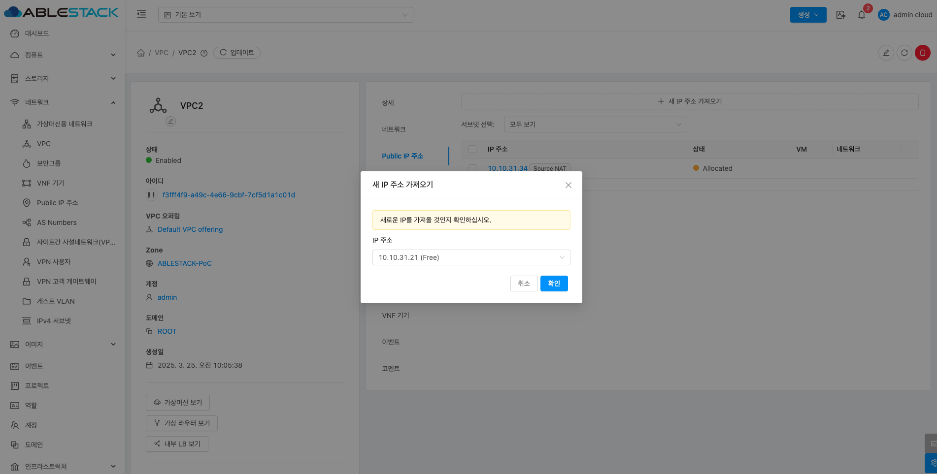 - 확인 버튼을 클릭하여 새 IP 주소 가져오기로 Public IP를 추가합니다.