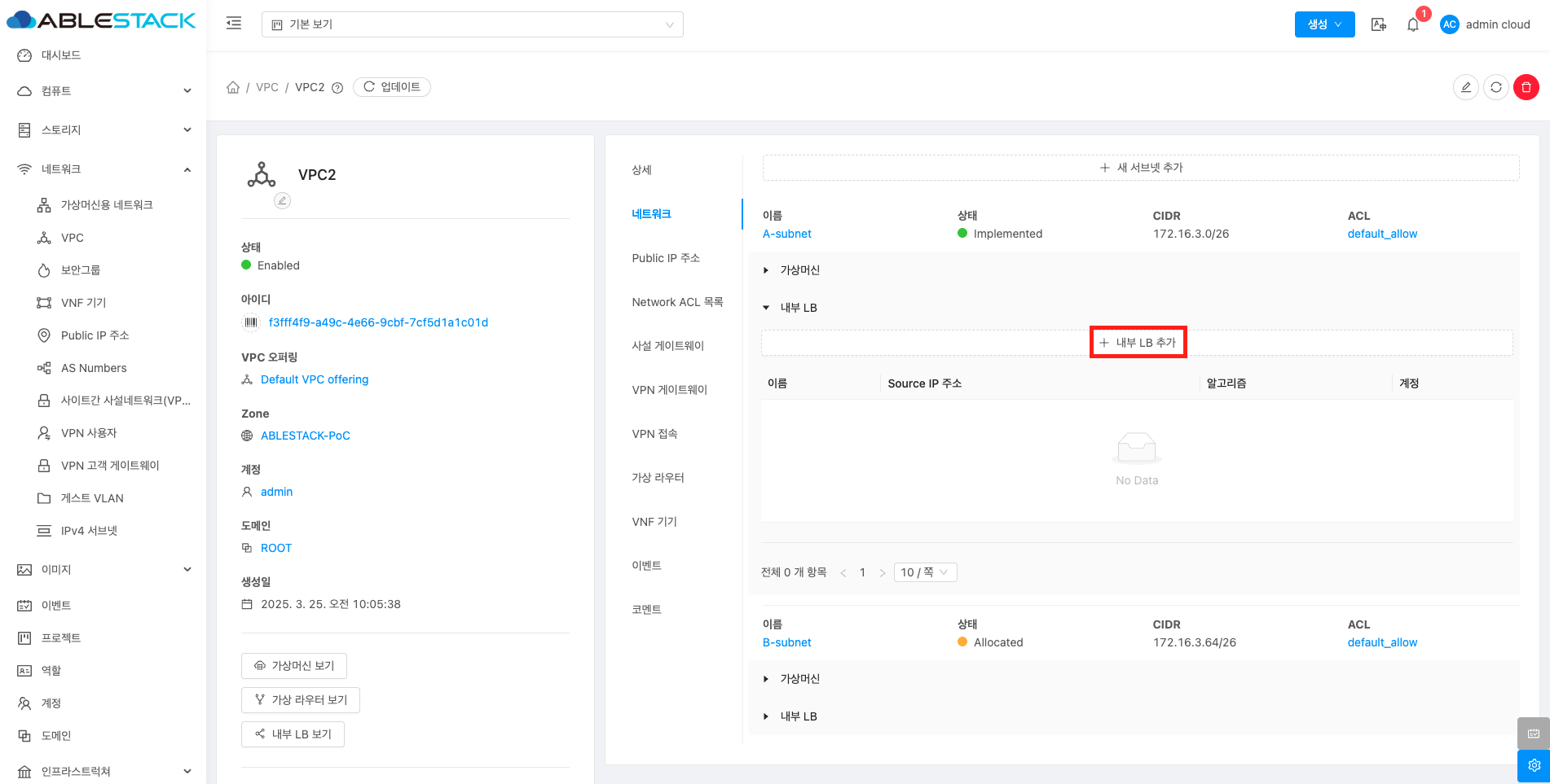 VPC의 새 서브넷에 내부 LB 추가 버튼을 클릭하여 내부 LB 추가 화면을 호출합니다.