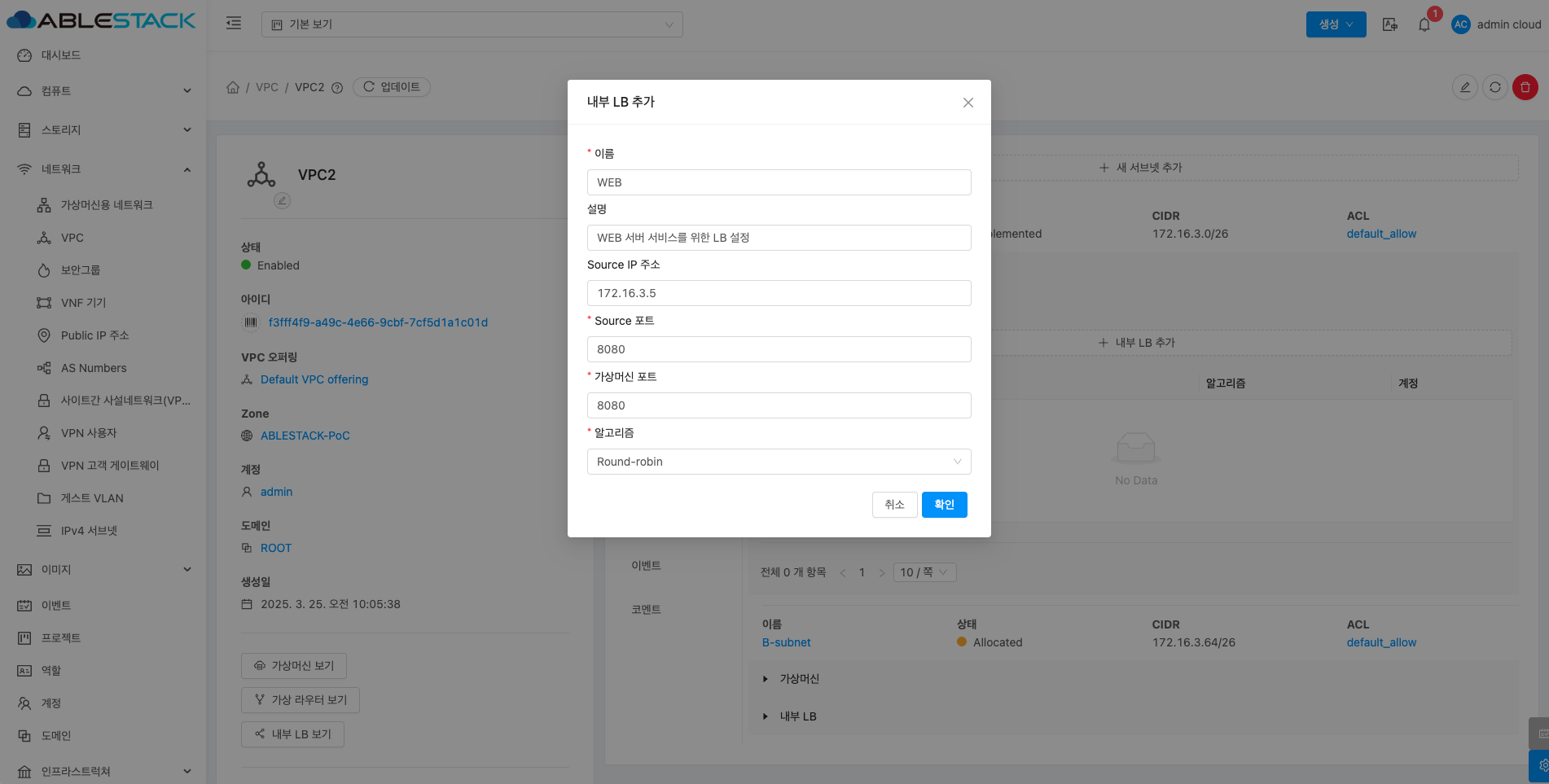 - 확인 버튼을 클릭하여 내부 LB 추가합니다.