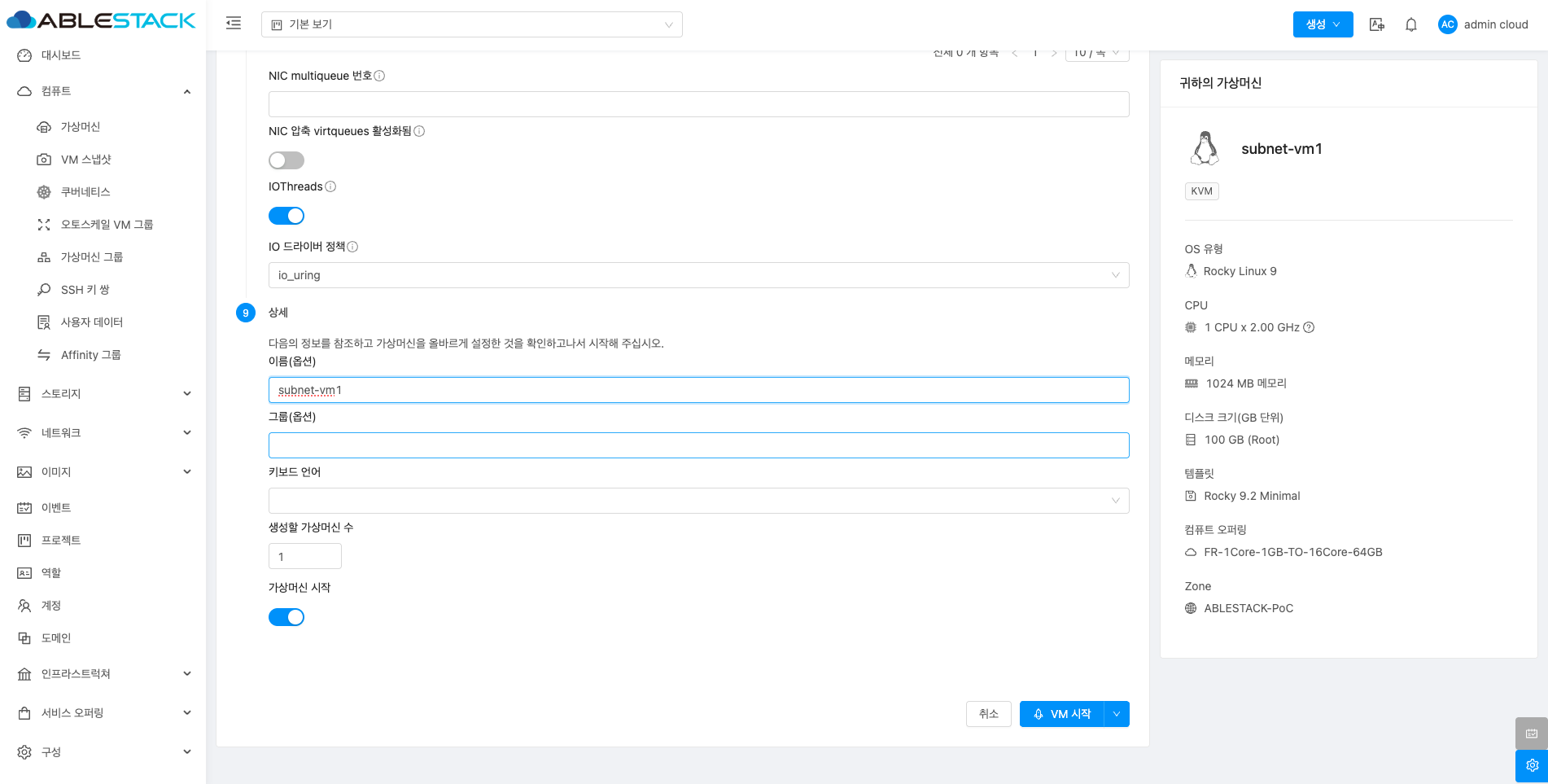 - VM 시작 버튼을 클릭하여 새 서브넷에 가상머신을 추가합니다.