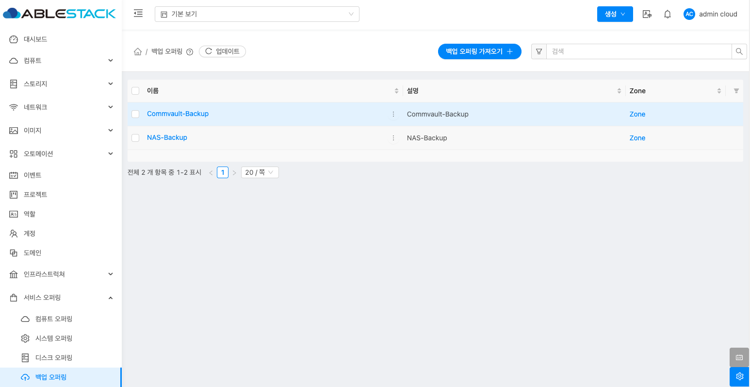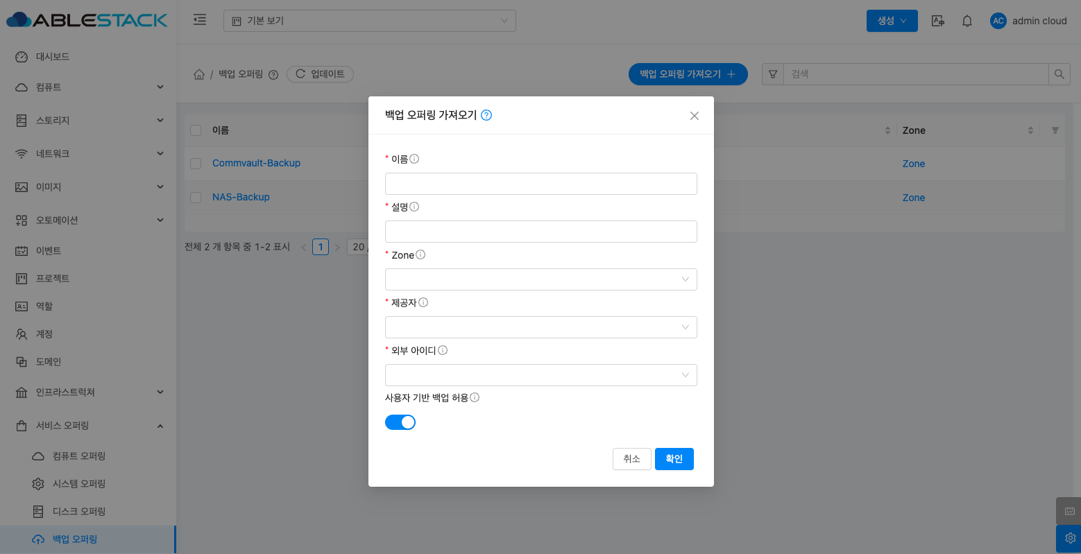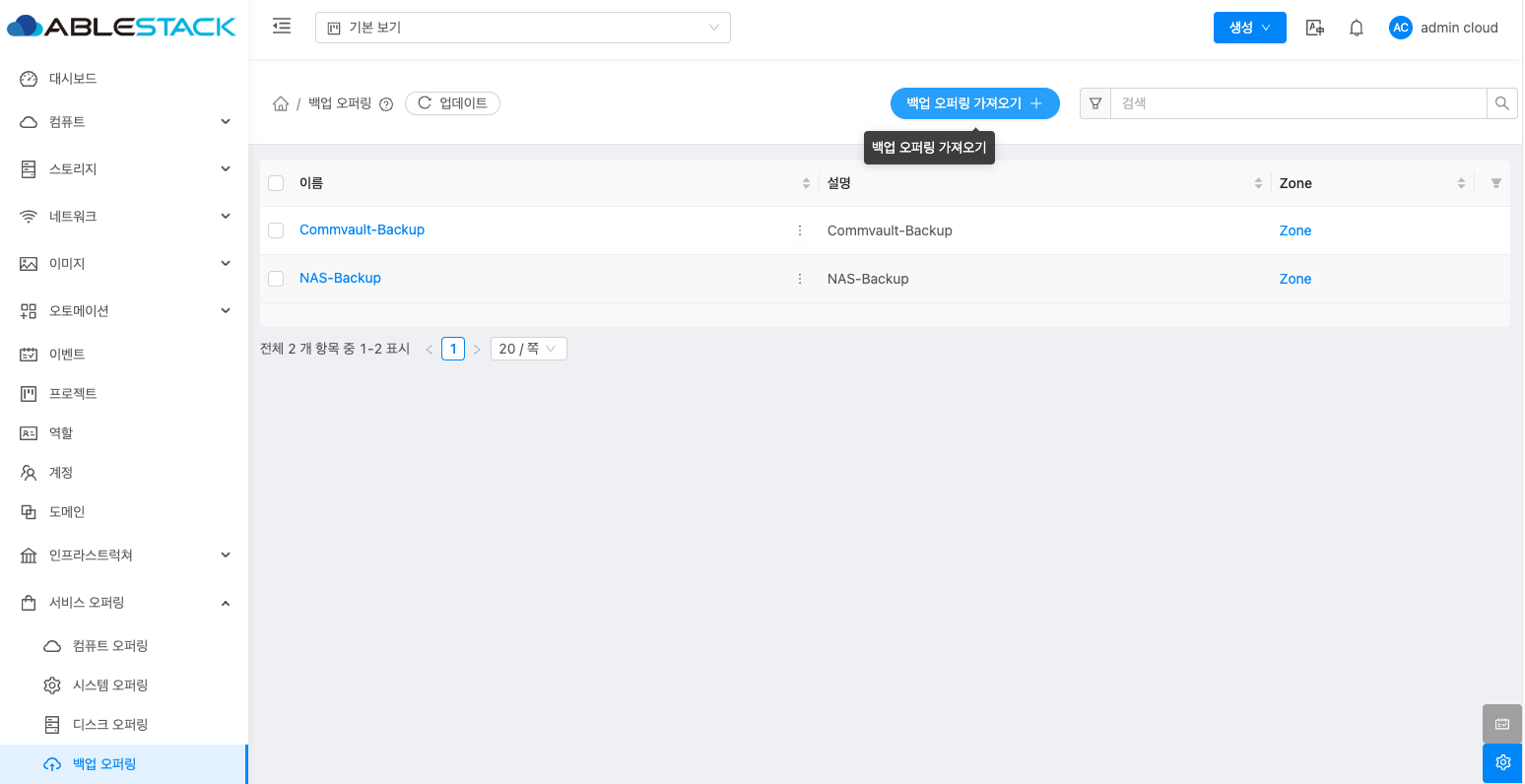 - 서비스 오퍼링의 백업 오퍼링에서 상단의 백업 오퍼링 가져오기 버튼을 클릭합니다.