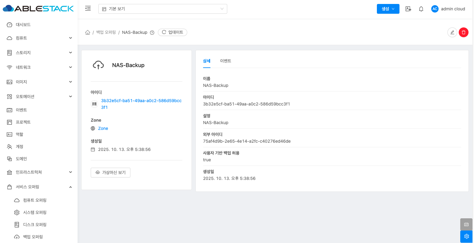 - 백업 오퍼링 목록 조회에서 확인하고 싶은 백업 오퍼링 목록을 조회합니다. 백업 오퍼링 대한 상세 정보를 확인하는 화면입니다. 해당 백업 오퍼링에 대한 이름, 아이디 등 상세 정보를 확인할 수 있습니다.