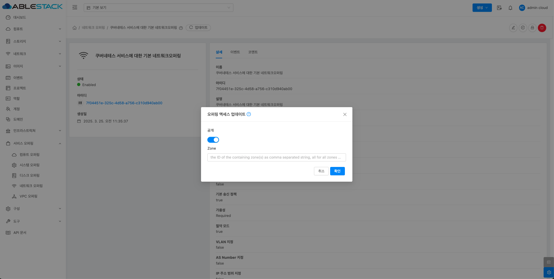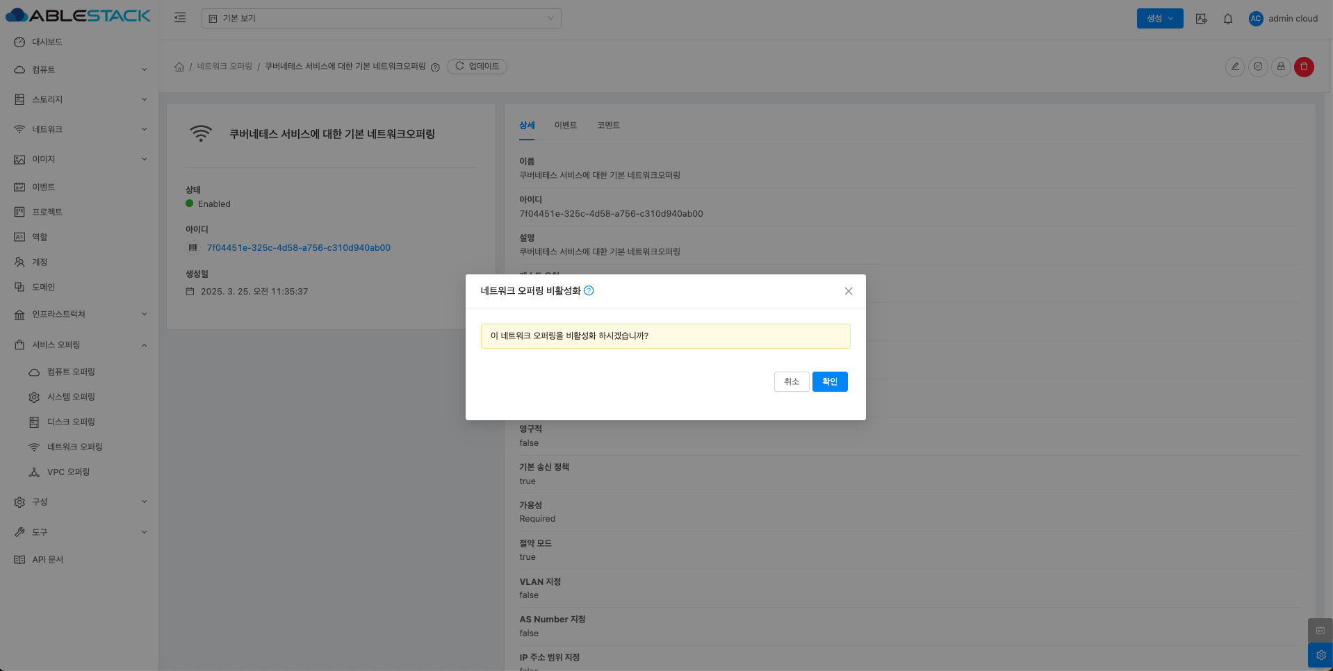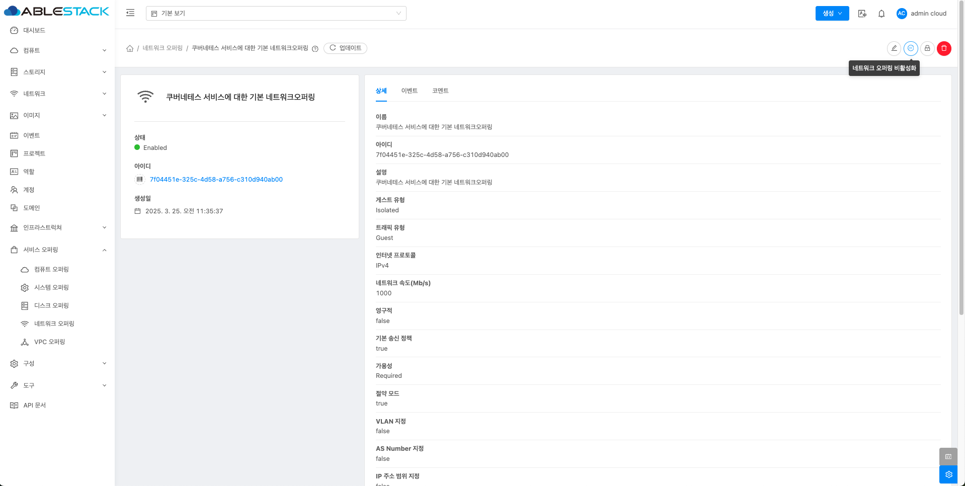 - 네트워크 오퍼링 활성화: 네트워크 오퍼링을 활성화 및 비활성화합니다.
