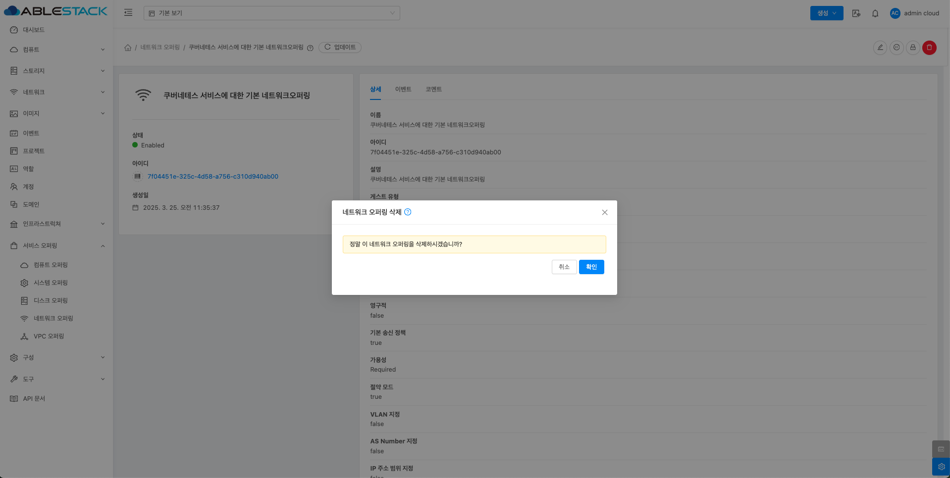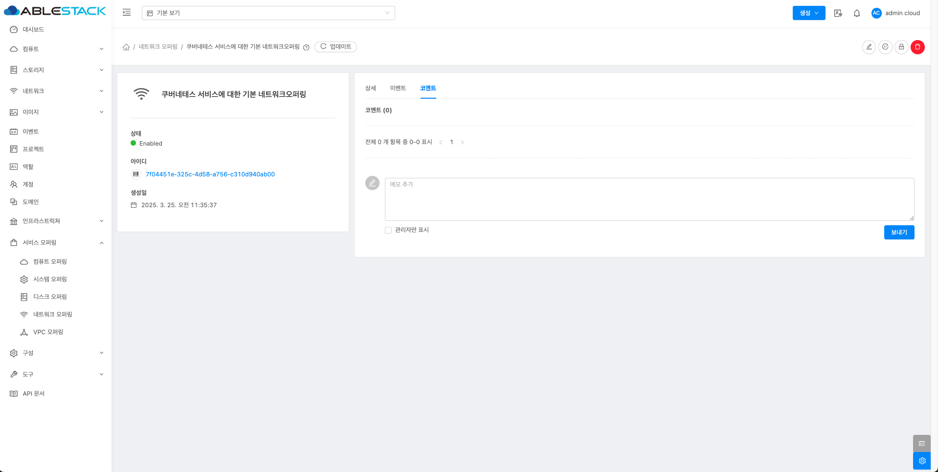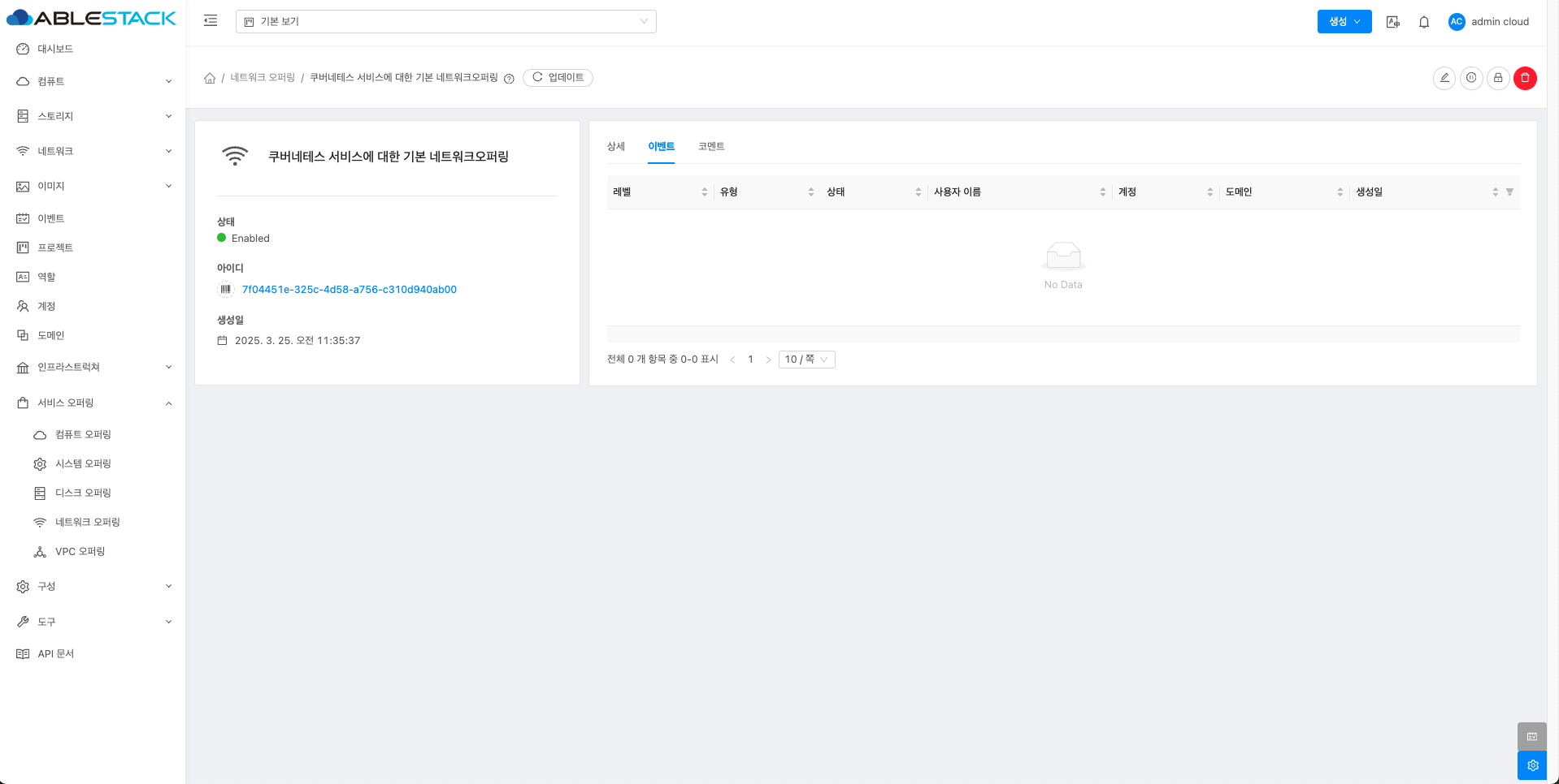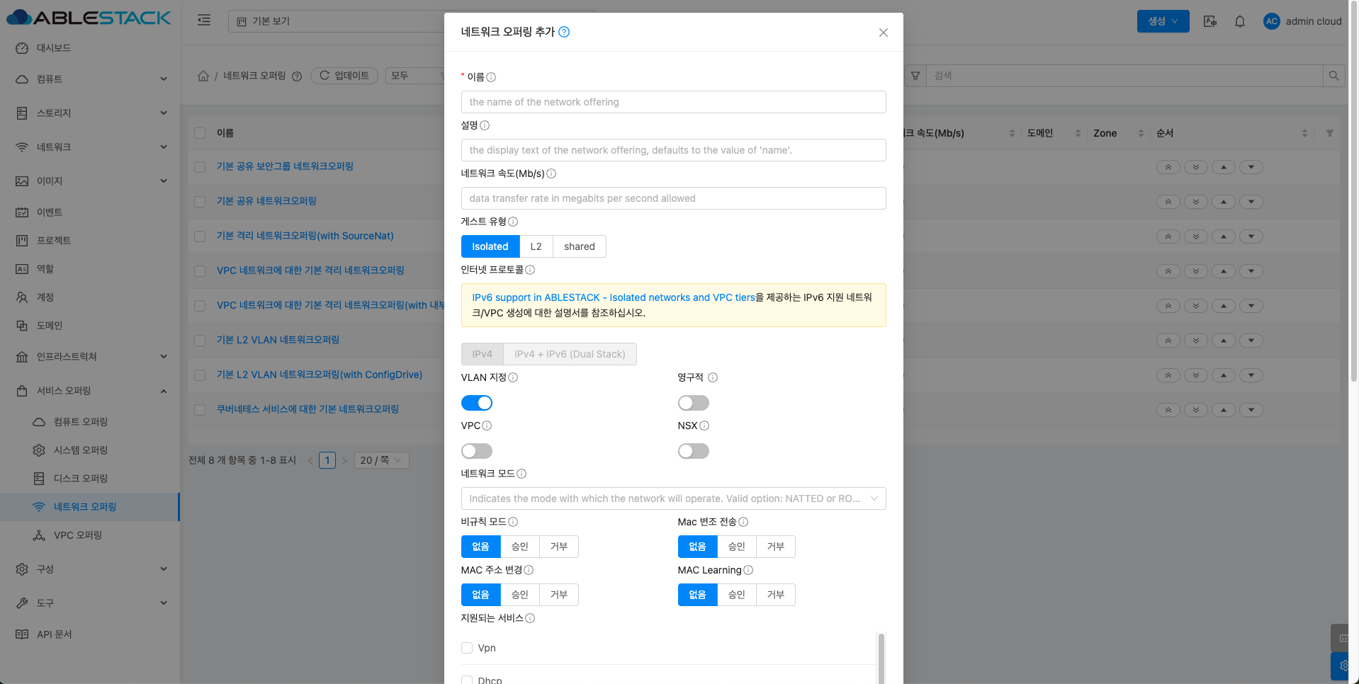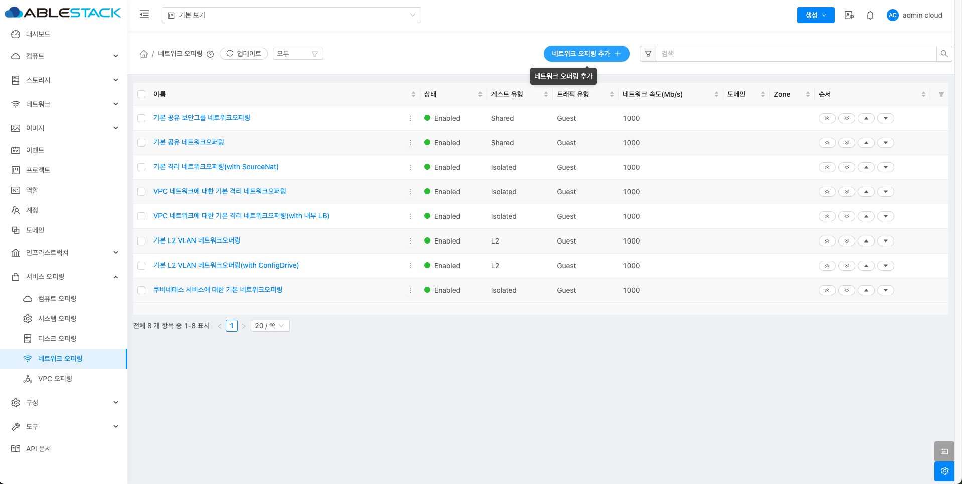 - 서비스 오퍼링의 네트워크 오퍼링에서 상단의 네트워크 오퍼링 추가 버튼을 클릭합니다.