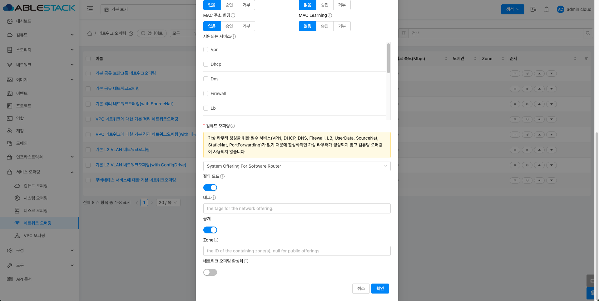 | SourceNat | 클라우드에 구성된 가상 라우터나 다른 소스 NAT 공급자를 선택할 수 있습니다. | |