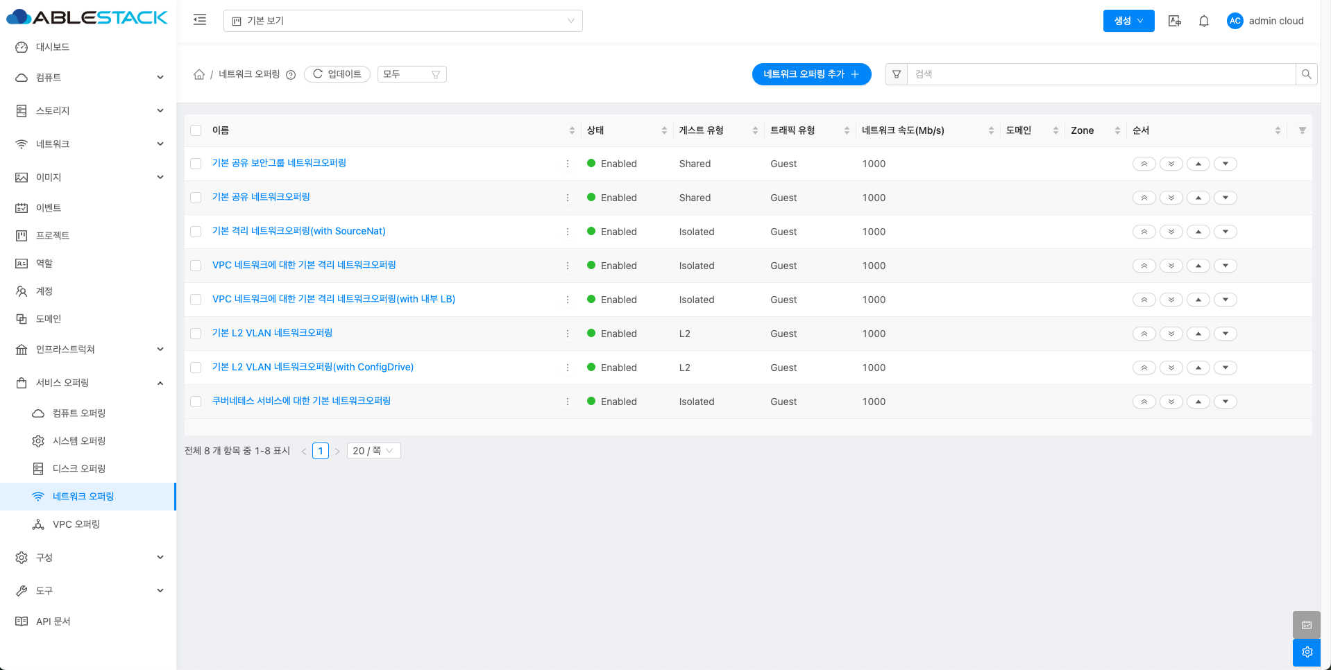 해당 목록은 기본적으로 제공되는 네트워크 오퍼링 목록입니다.