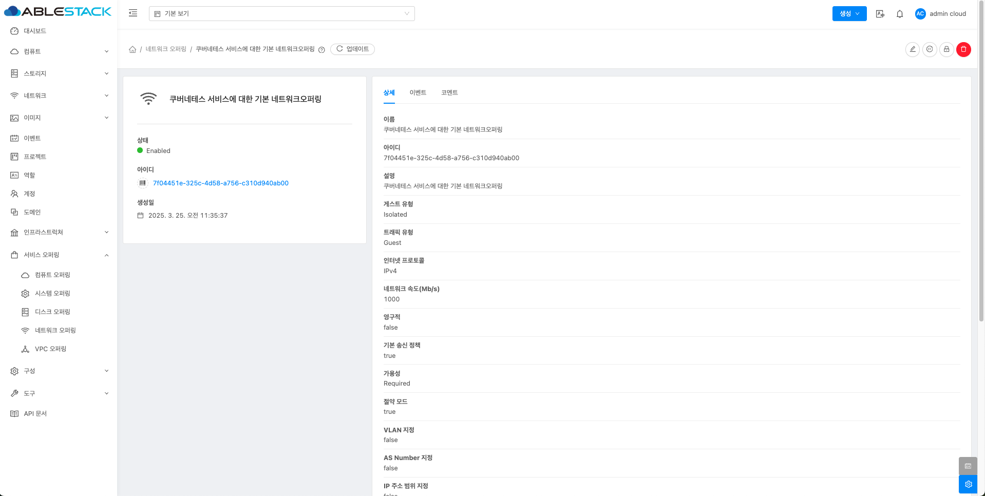 | 네트워크 모드 | NATTED | 네트워크가 작동하는 모드를 나타냅니다. 이는 격리된 네트워크의 기본 네트워크 모드입니다. 격리된 네트워크와 VPC의 VR은 소스 NAT 서비스와 네트워크 제공이 지원하는 경우 정적 NAT, 로드밸런서, 포트 포워딩, VPN을 제공합니다. |