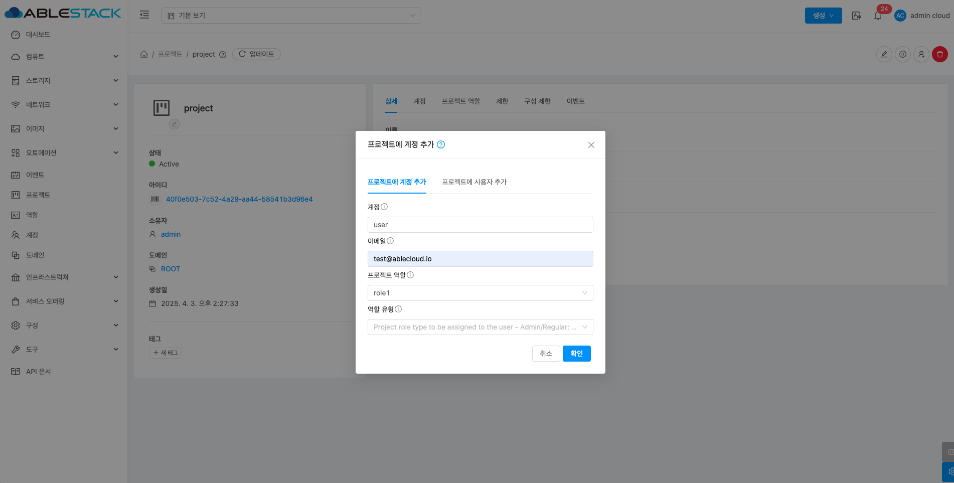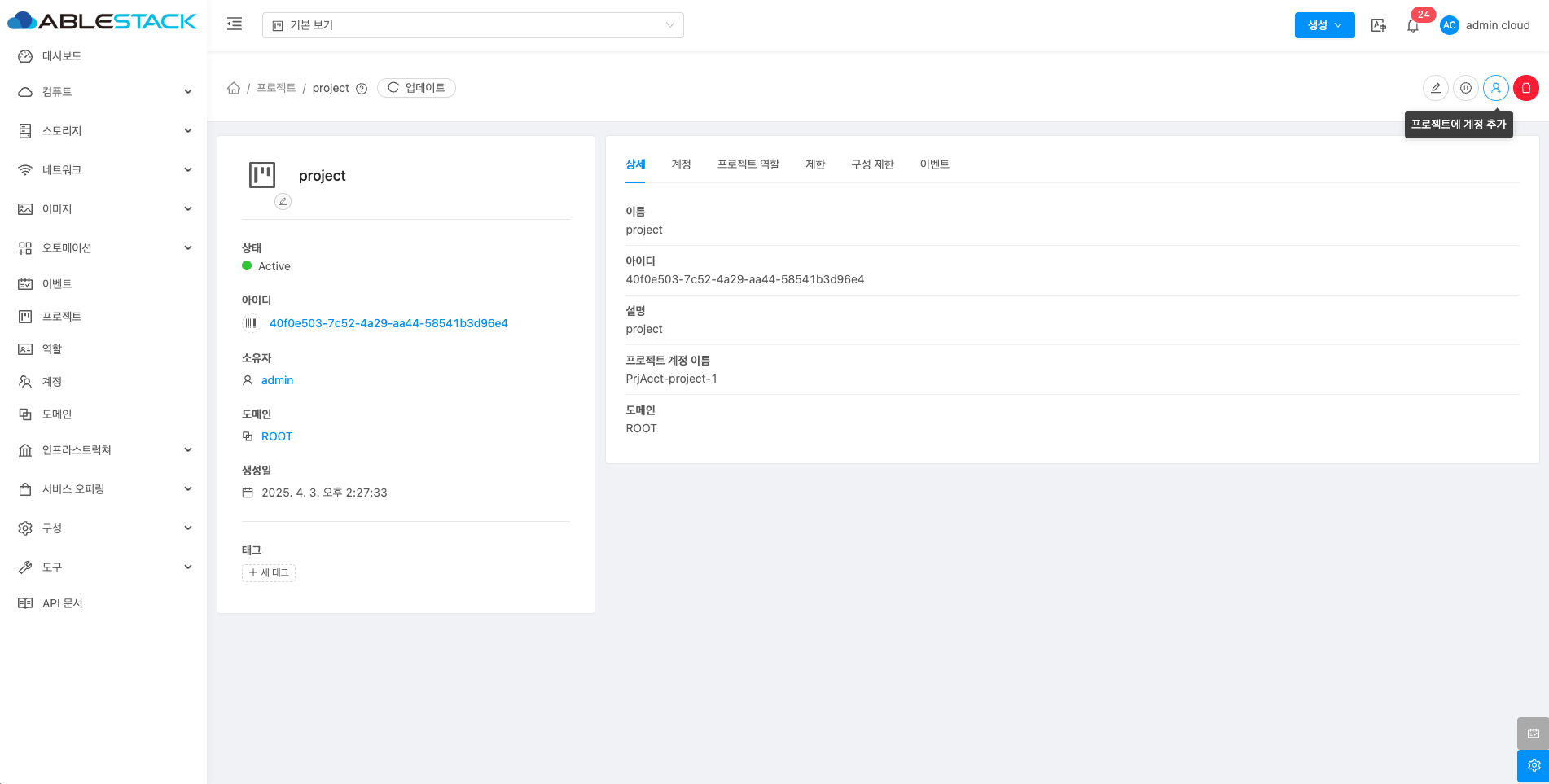 - 프로젝트에 계정 추가 버튼을 클릭하여 프로젝트에 계정 추가 화면을 호출합니다.