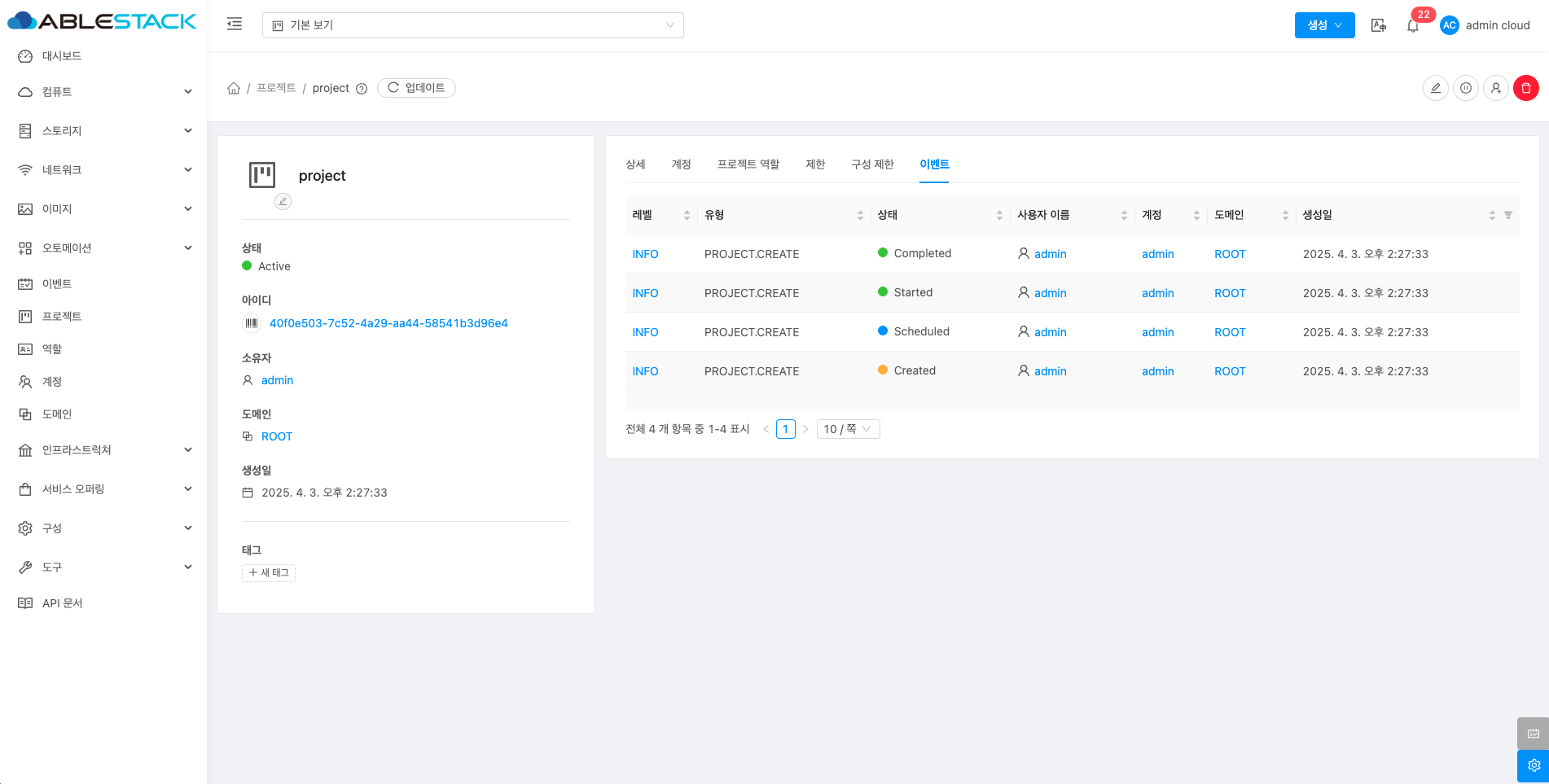 프로젝트는 여러 사용자가 리소스를 공유하고 협력할 수 있도록 하는 단위입니다. 프로젝트 내의 사용자들은 가상 머신, 스토리지 등의 리소스를 함께 사용할 수 있으며 프로젝트 간에는 리소스가 격리됩니다. 관리자는 사용자 권한을 설정하고 프로젝트별로 정책을 적용할 수 있습니다.프로젝트는 팀 단위 협업과 보안 관리, 리소스 공유에 유용하게 활용됩니다.