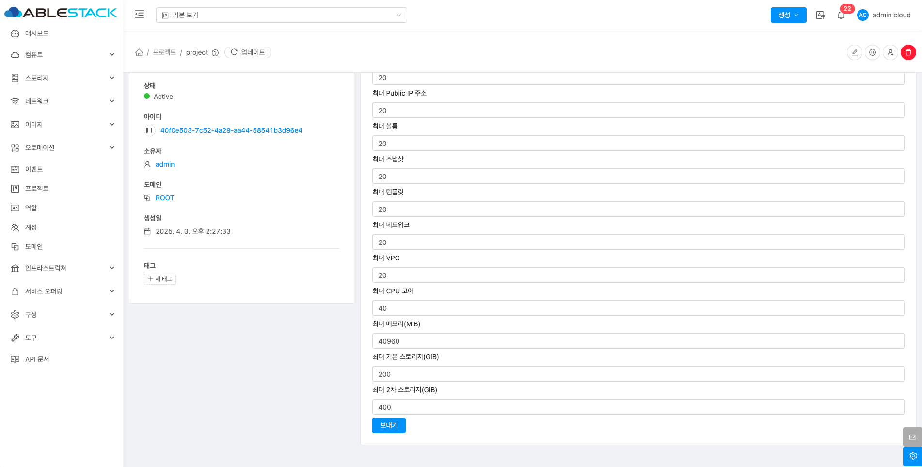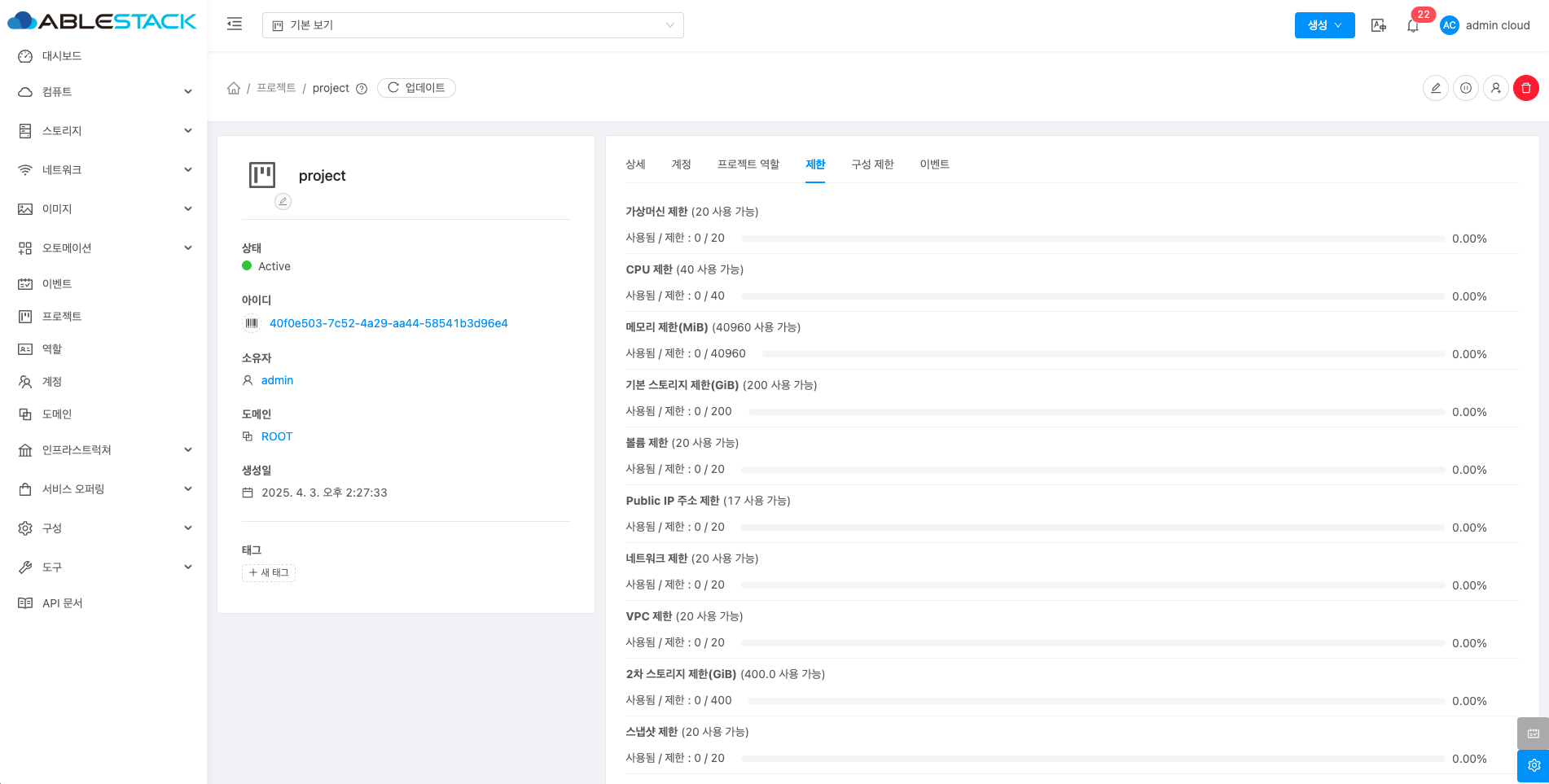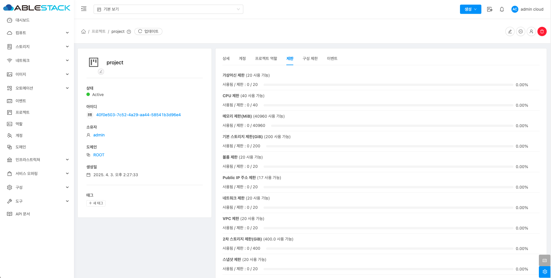해당 프로젝트에 리소스를 할당하는 기능입니다. 해당 기능을 통해 프로젝트에서 사용 가능한 자원의 최대값을 설정할 수 있습니다.