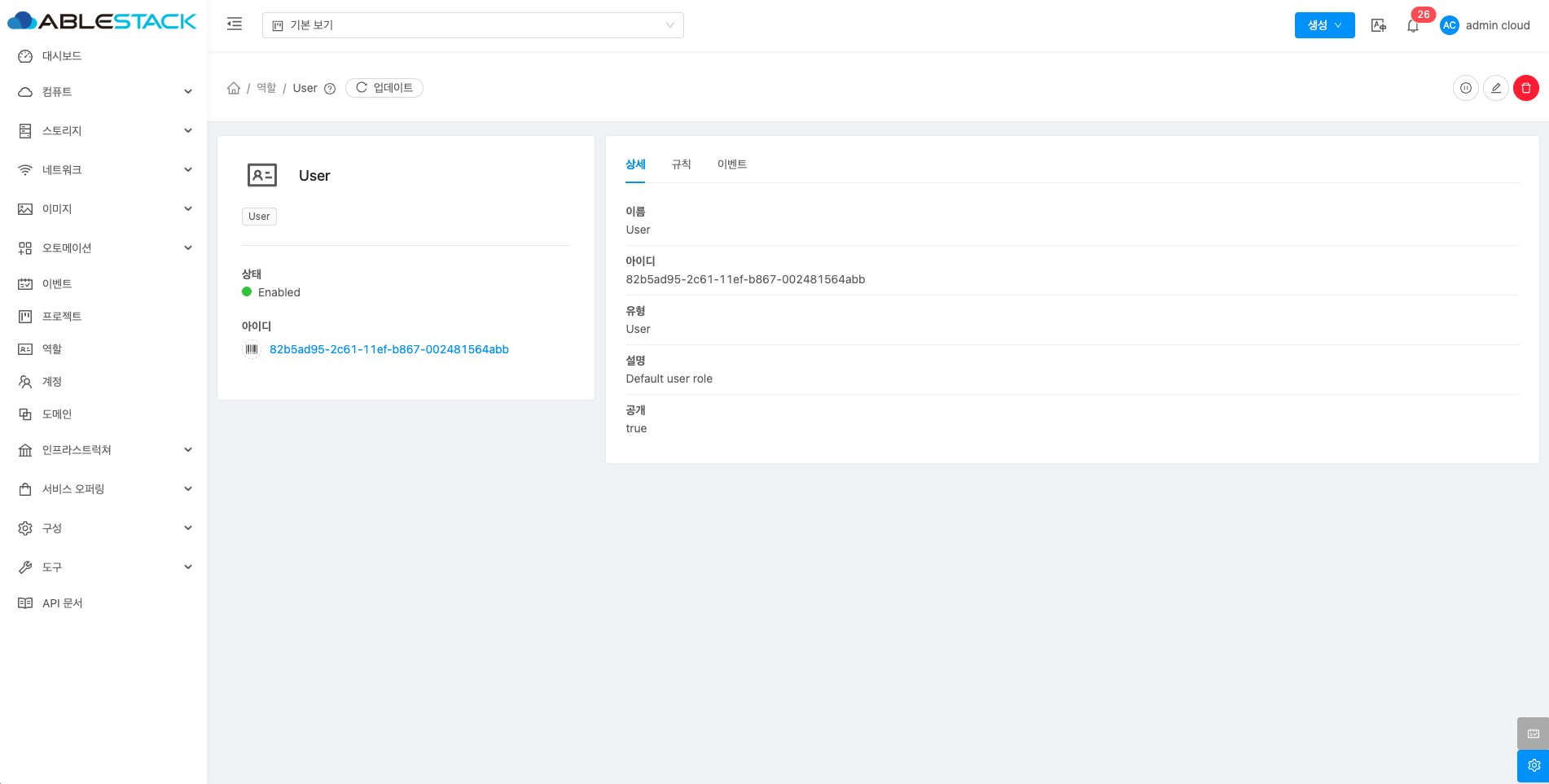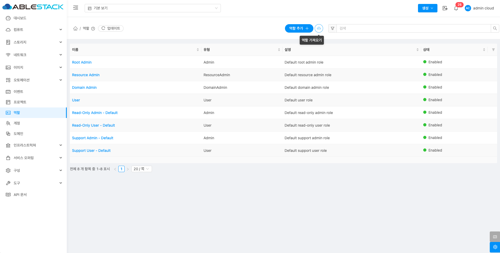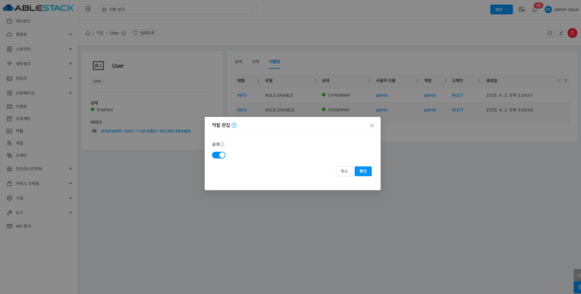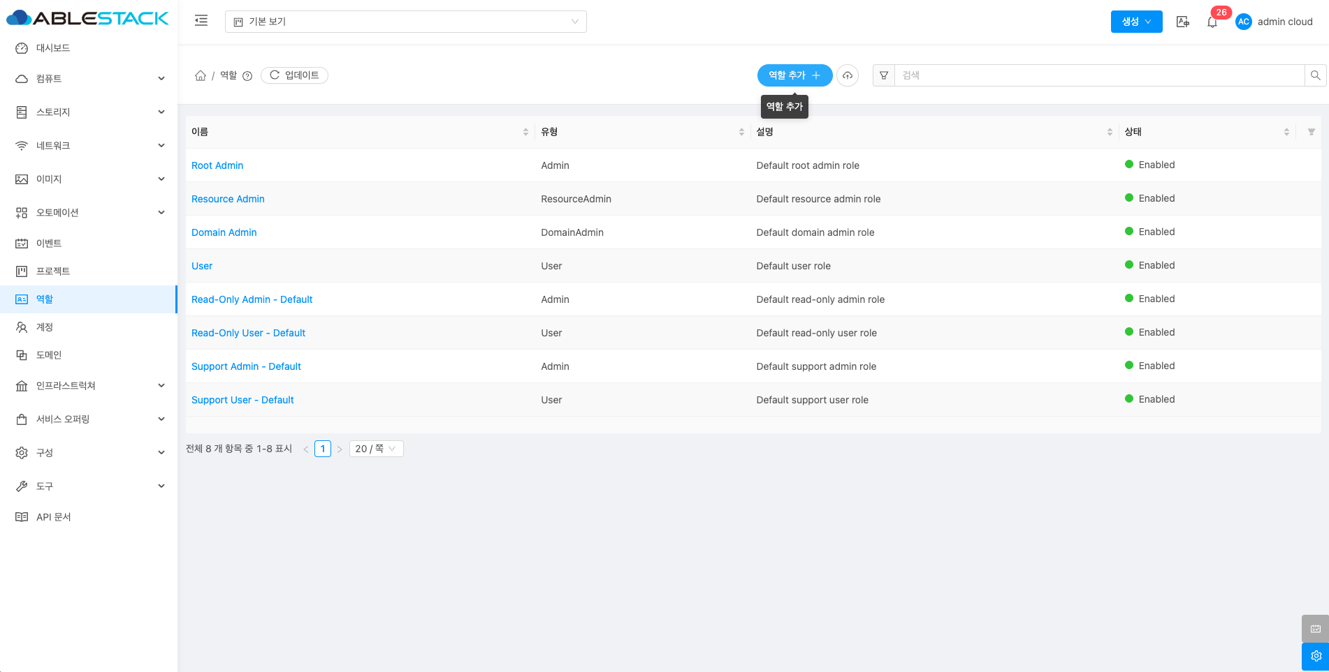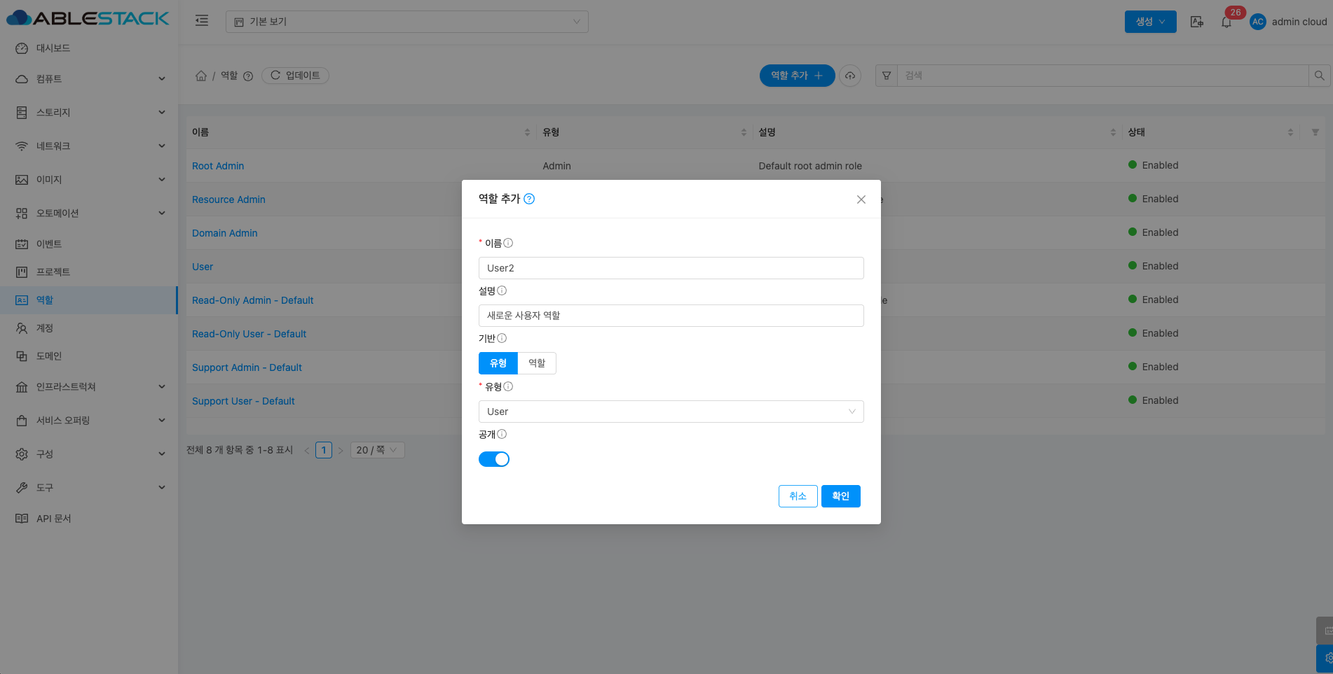 역할은 사용자의 권한을 관리하는 기능으로, 관리자가 역할별로 접근 권한을 설정할 수 있습니다. 이를 통해 각 사용자가 수행할 수 있는 작업을 세부적으로 제어할 수 있습니다. 예를 들어 관리자는 모든 리소스를 관리할 수 있는 권한을, 일반 사용자는 제한된 작업만 할 수 있도록 설정할 수 있습니다. 이를 통해 ABLESTACK 클라우드 리소스를 안전하고 효율적으로 관리할 수 있으며 각 역할에 맞는 적절한 권한을 부여하여 보안을 강화할 수 있습니다.