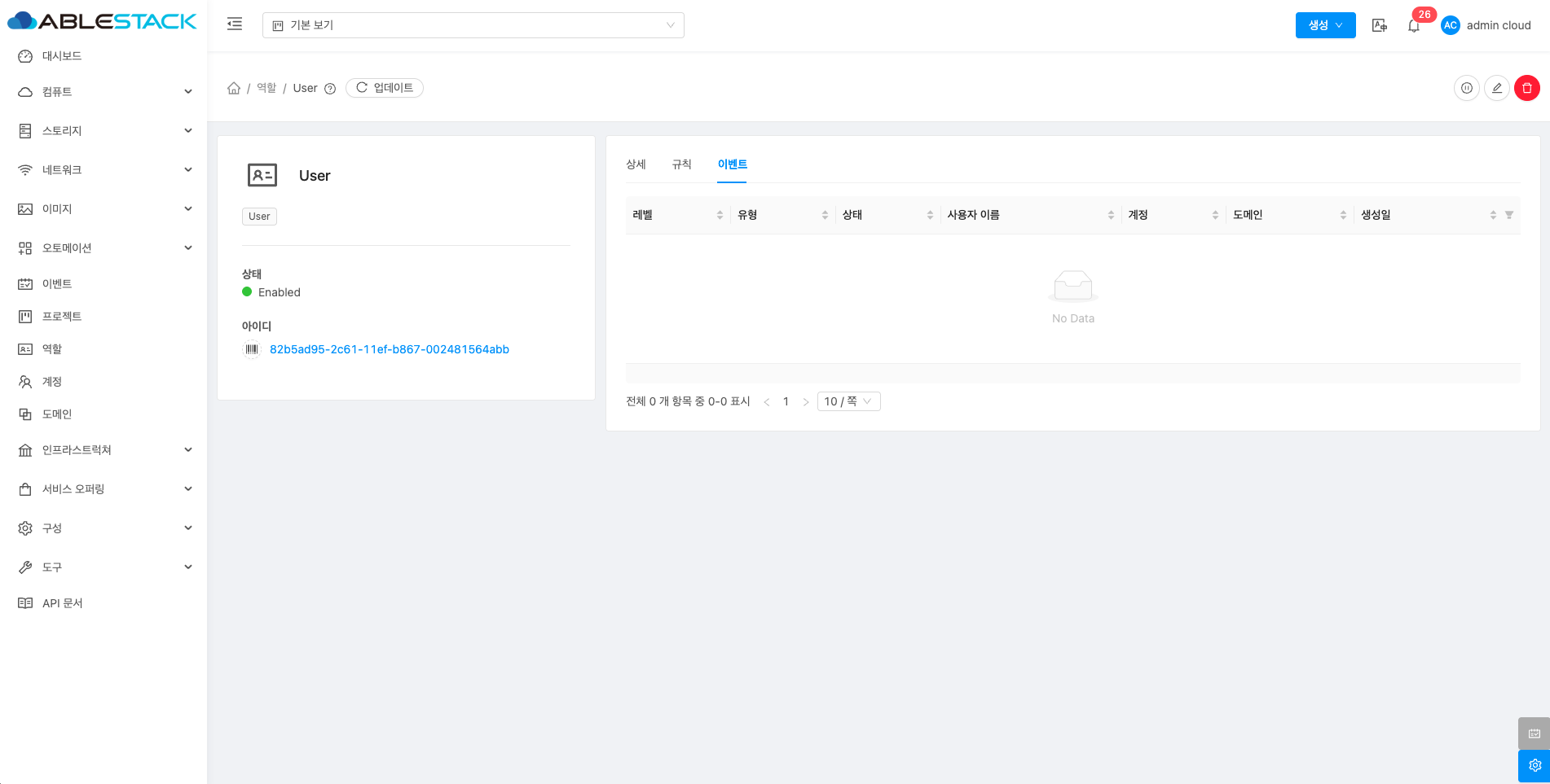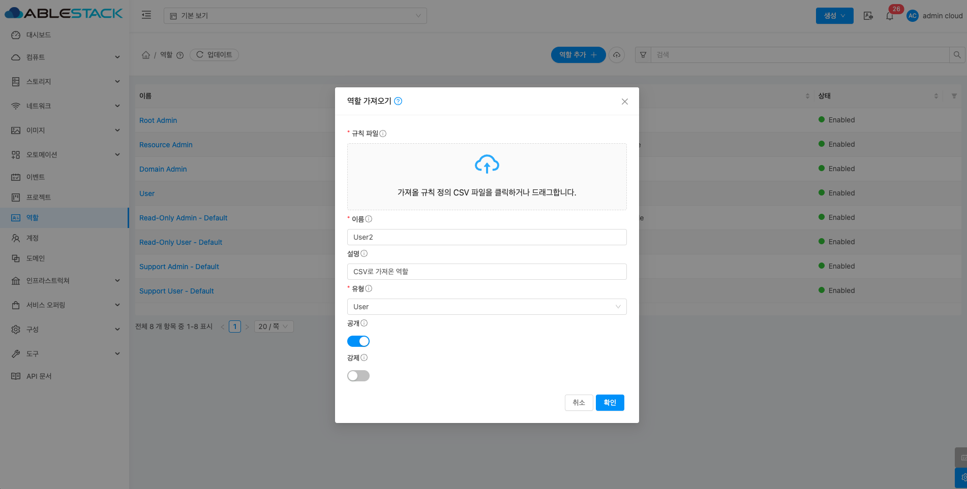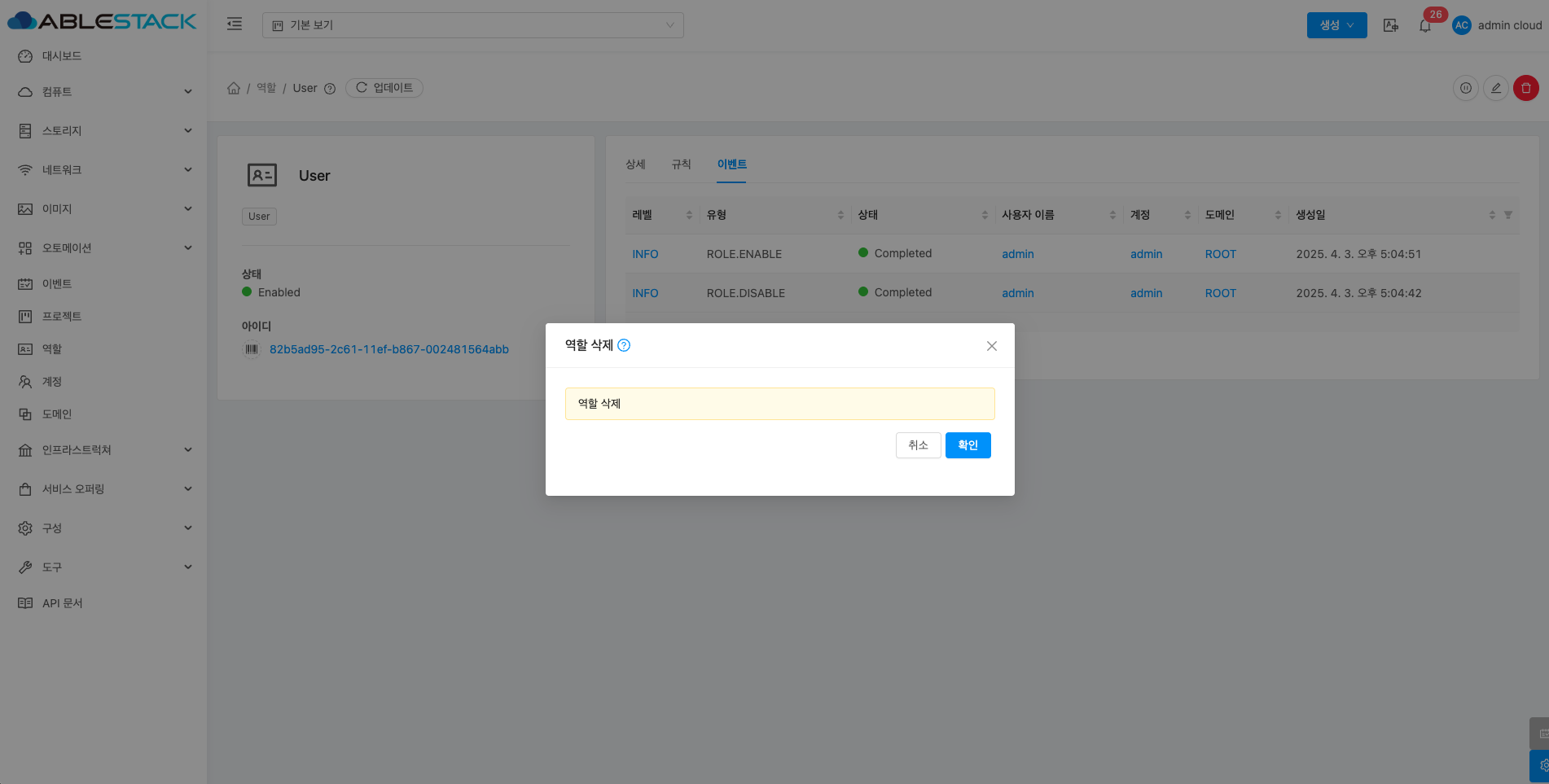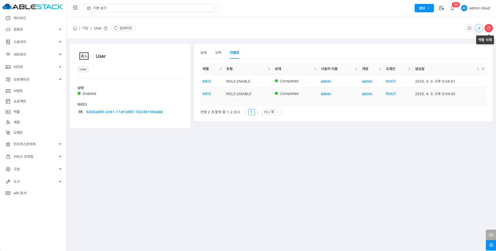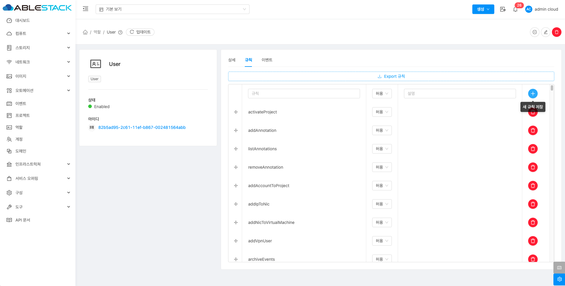 역할은 사용자의 권한을 관리하는 기능으로, 관리자가 역할별로 접근 권한을 설정할 수 있습니다. 이를 통해 각 사용자가 수행할 수 있는 작업을 세부적으로 제어할 수 있습니다. 예를 들어 관리자는 모든 리소스를 관리할 수 있는 권한을, 일반 사용자는 제한된 작업만 할 수 있도록 설정할 수 있습니다. 이를 통해 ABLESTACK 클라우드 리소스를 안전하고 효율적으로 관리할 수 있으며 각 역할에 맞는 적절한 권한을 부여하여 보안을 강화할 수 있습니다.