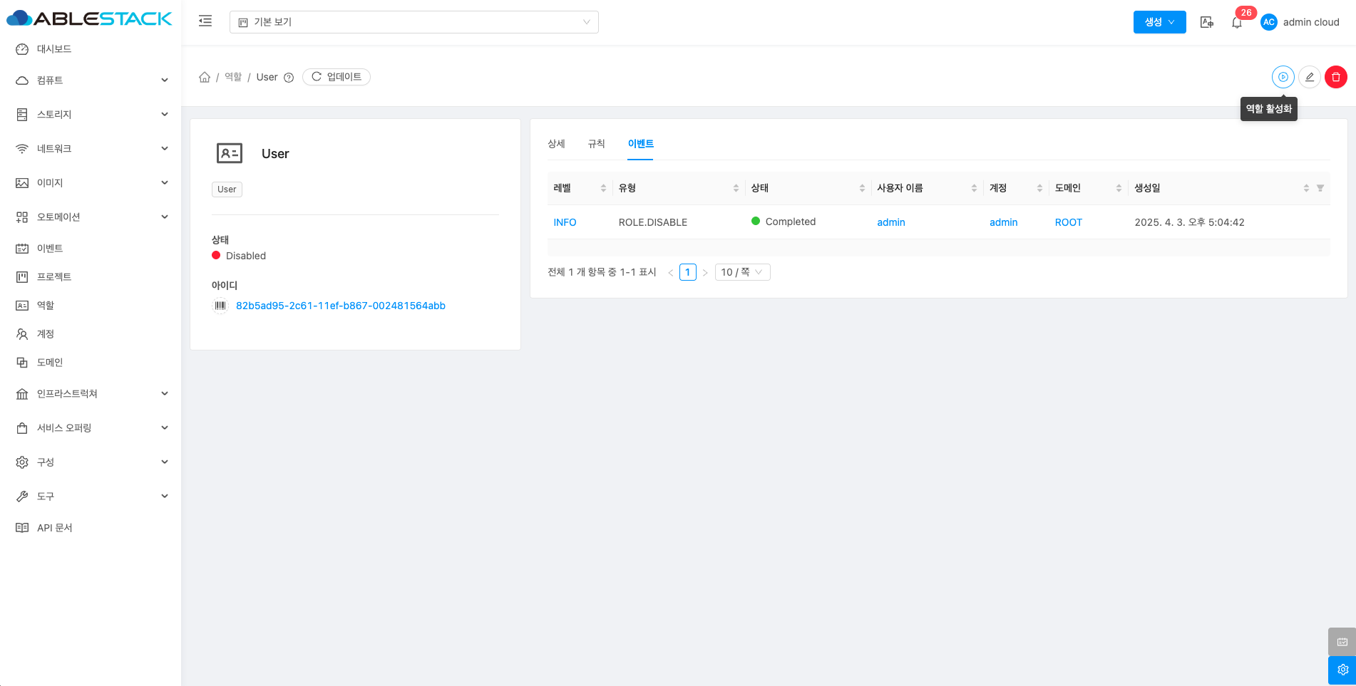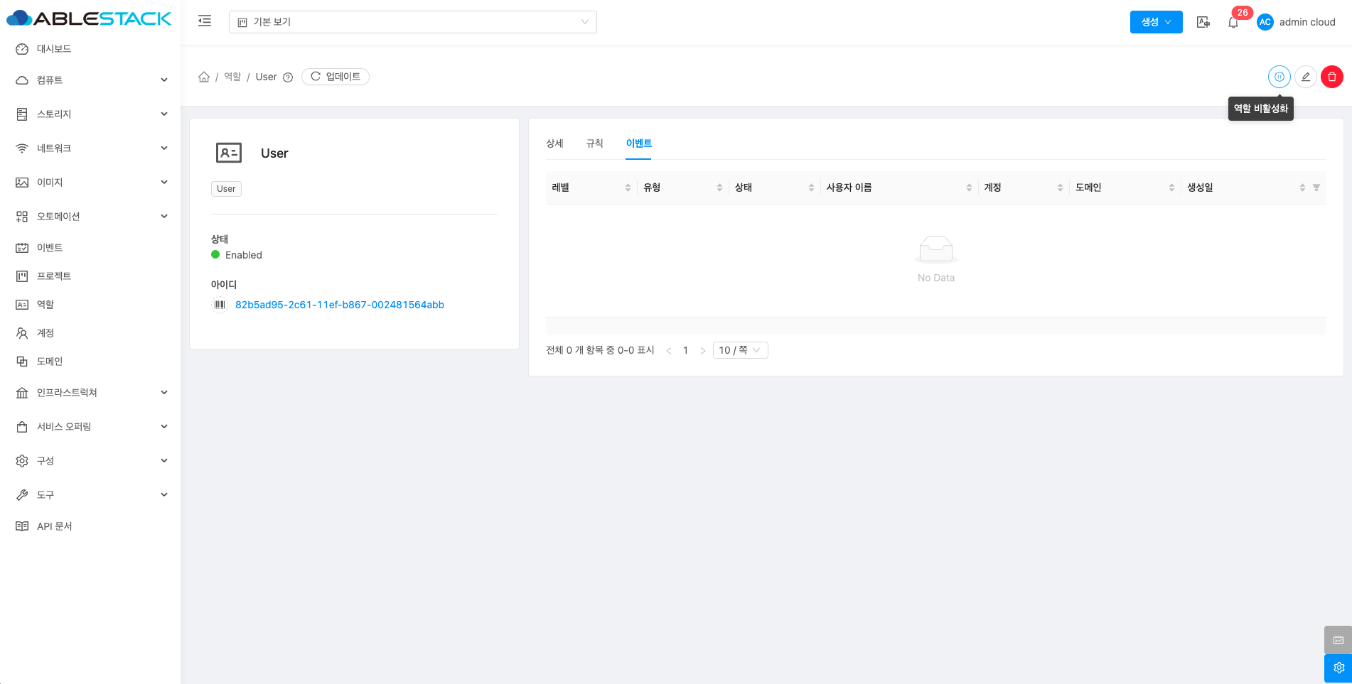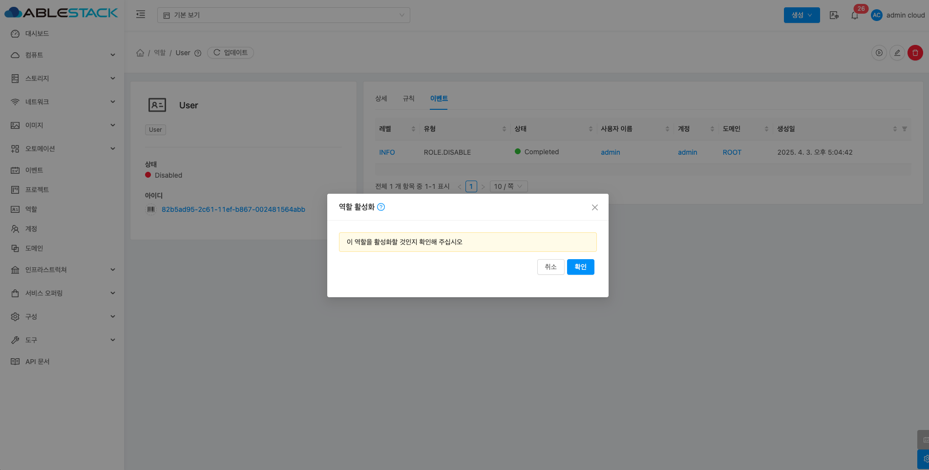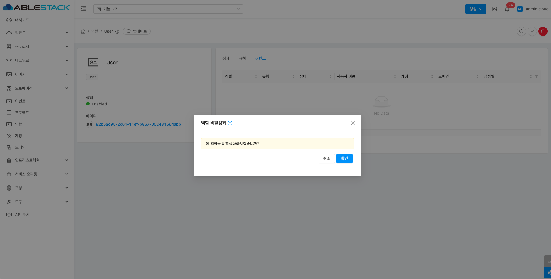 역할 비활성화 버튼을 클릭하여 역할 비활성화 화면을 호출합니다.