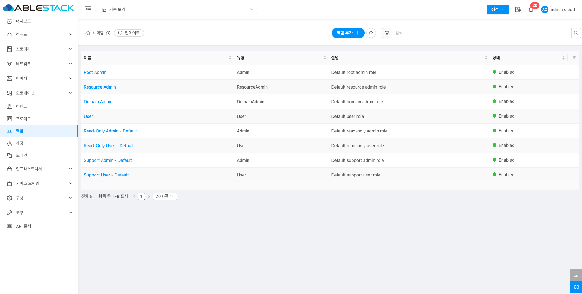 역할 목록을 확인하는 화면입니다.