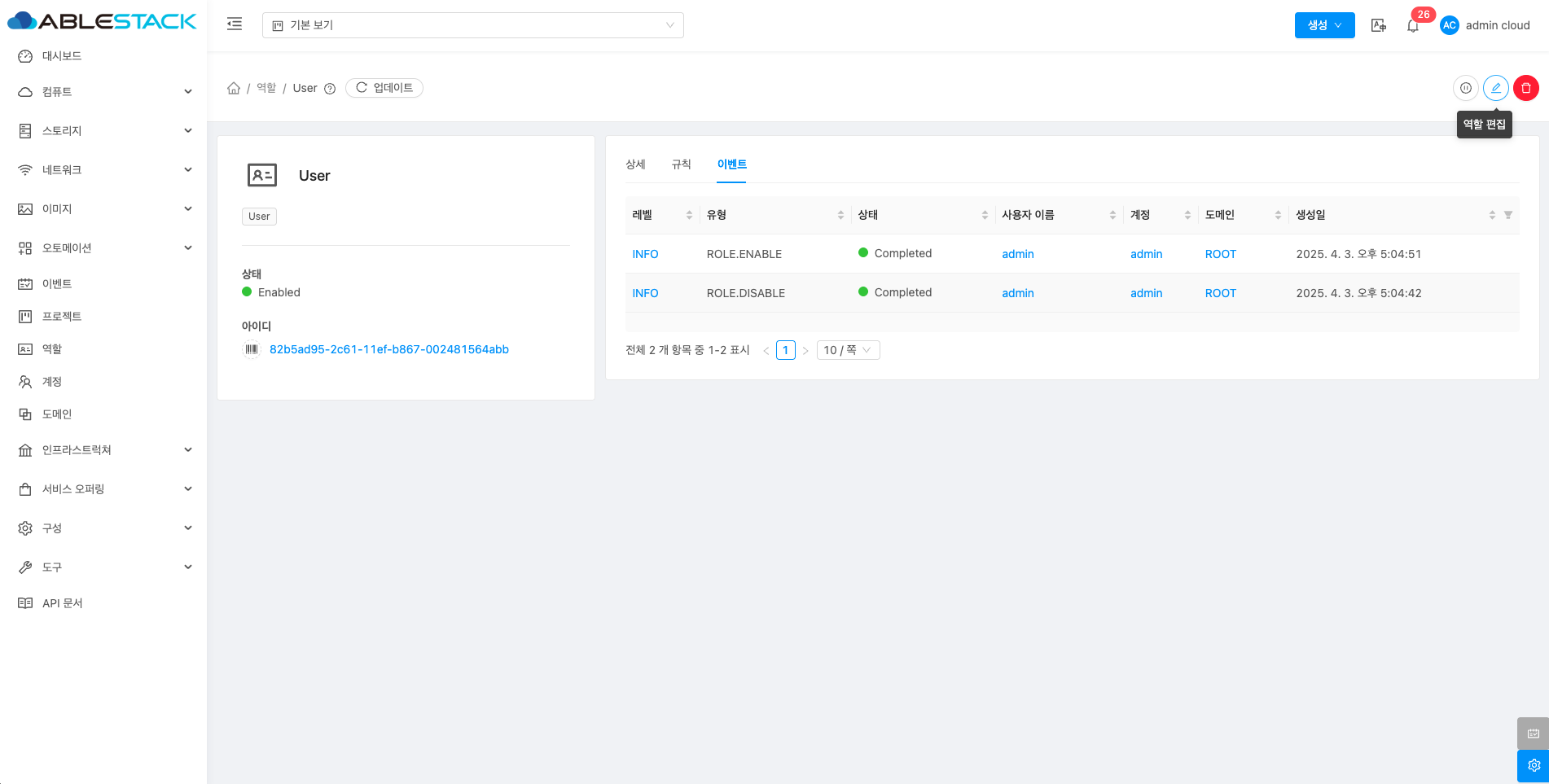 역할에 관련된 이벤트 정보를 확인할 수 있는 화면입니다. 역할에서 발생한 다양한 액션과 변경 사항을 쉽게 파악할 수 있습니다.