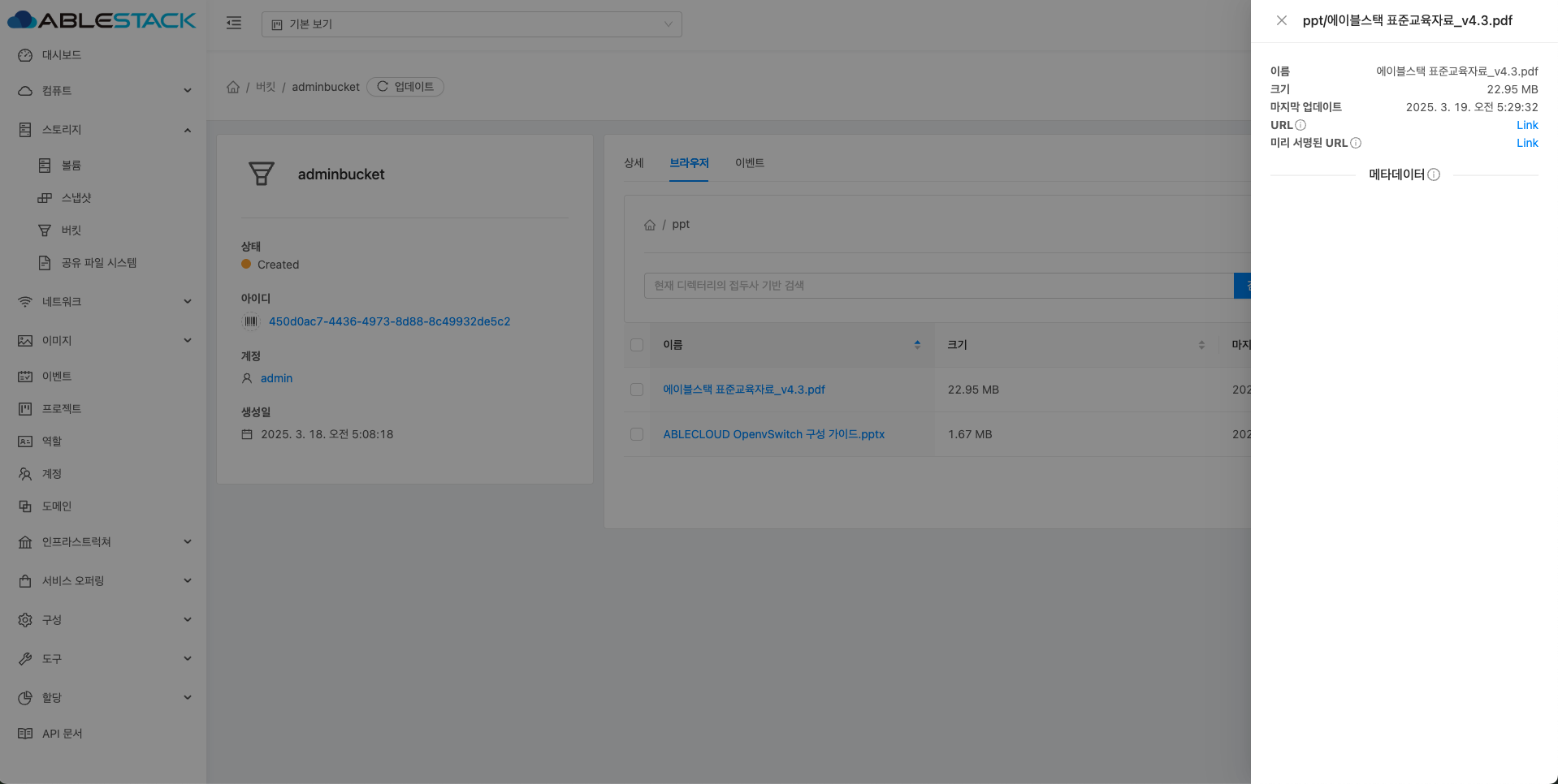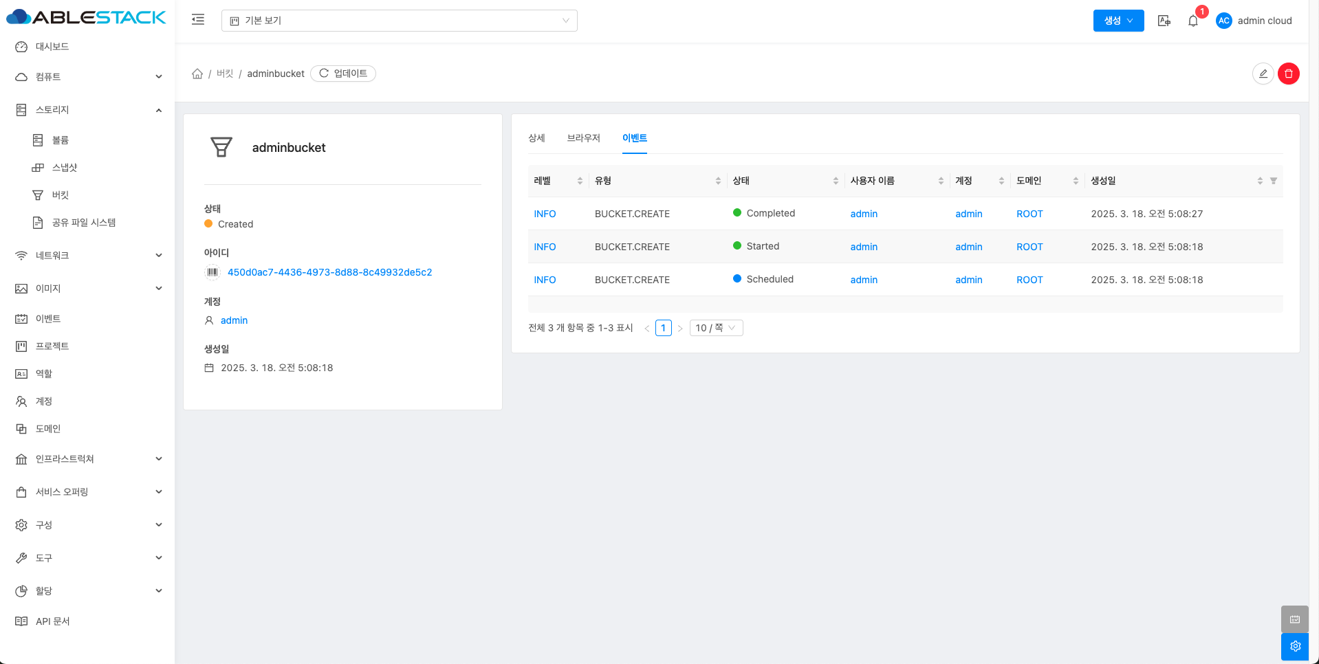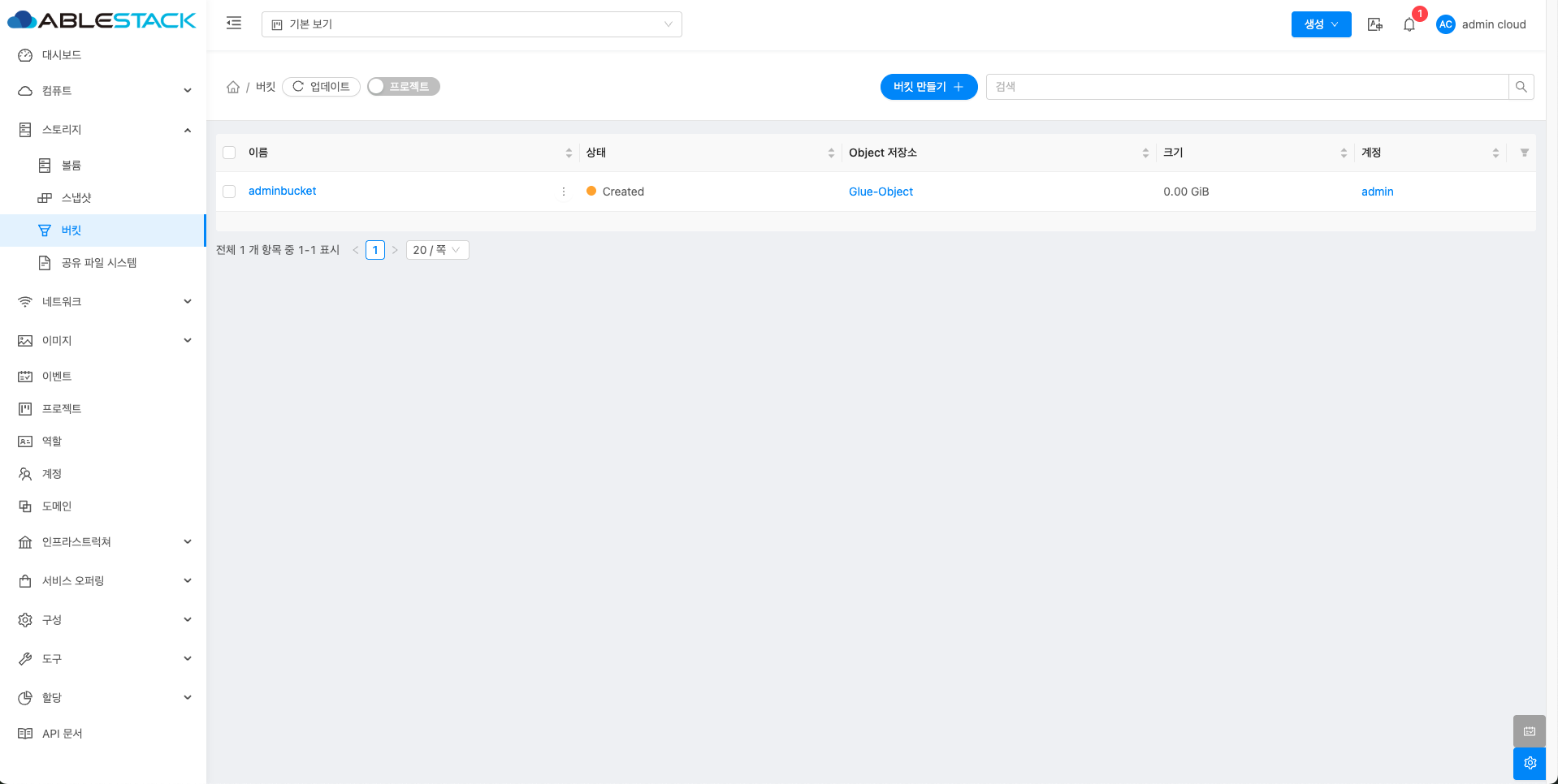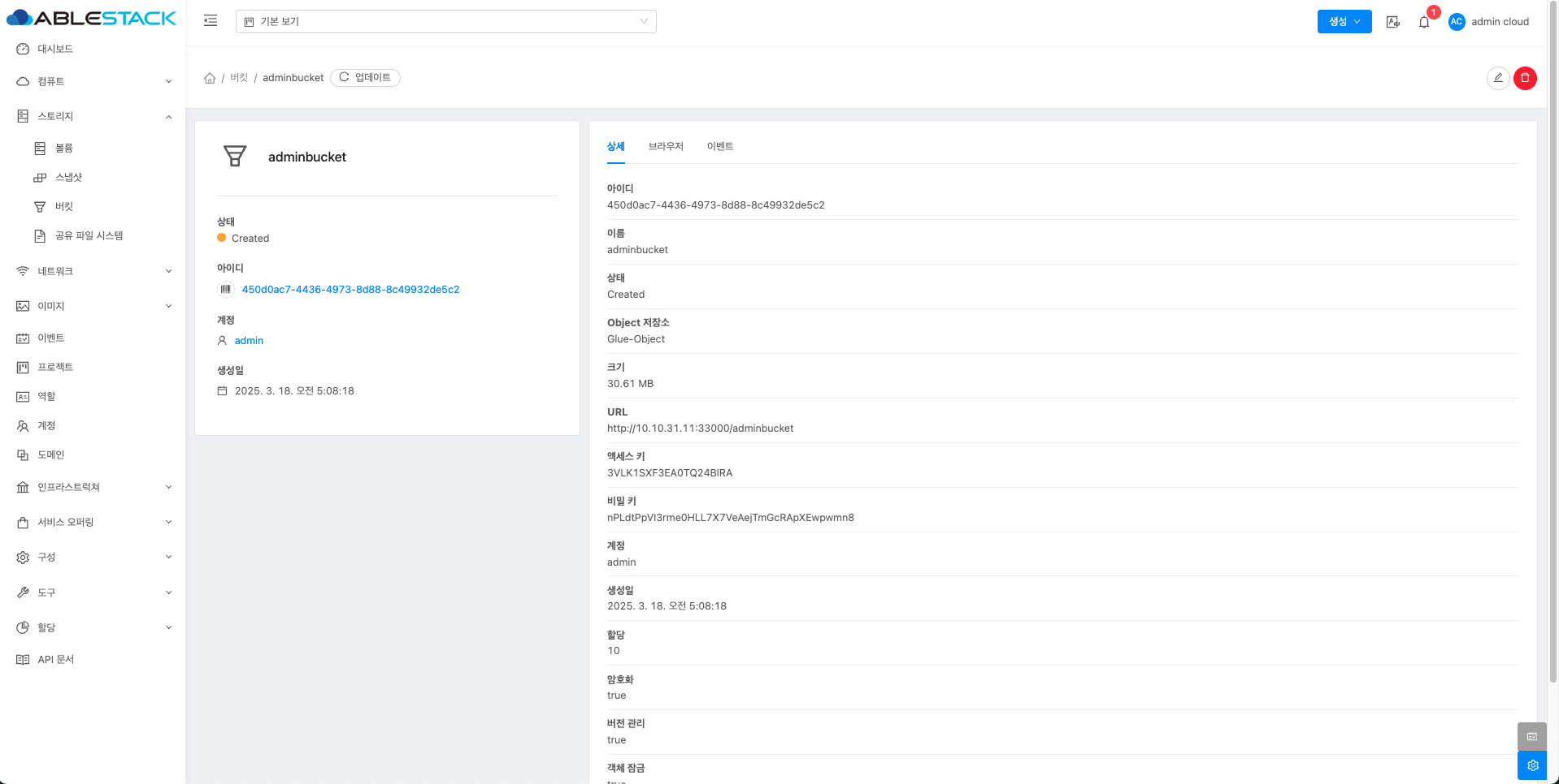 - 버킷 목록 조회에서 확인하고 싶은 버킷 목록을 조회합니다. 버킷에 대한 상세 정보를 확인하는 화면입니다. 해당 버킷에 대한 크기, UUID, 이름 등 상세 정보를 확인할 수 있습니다.