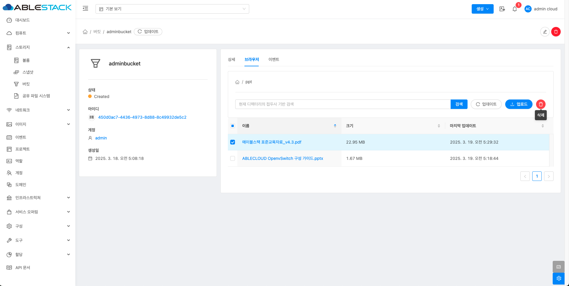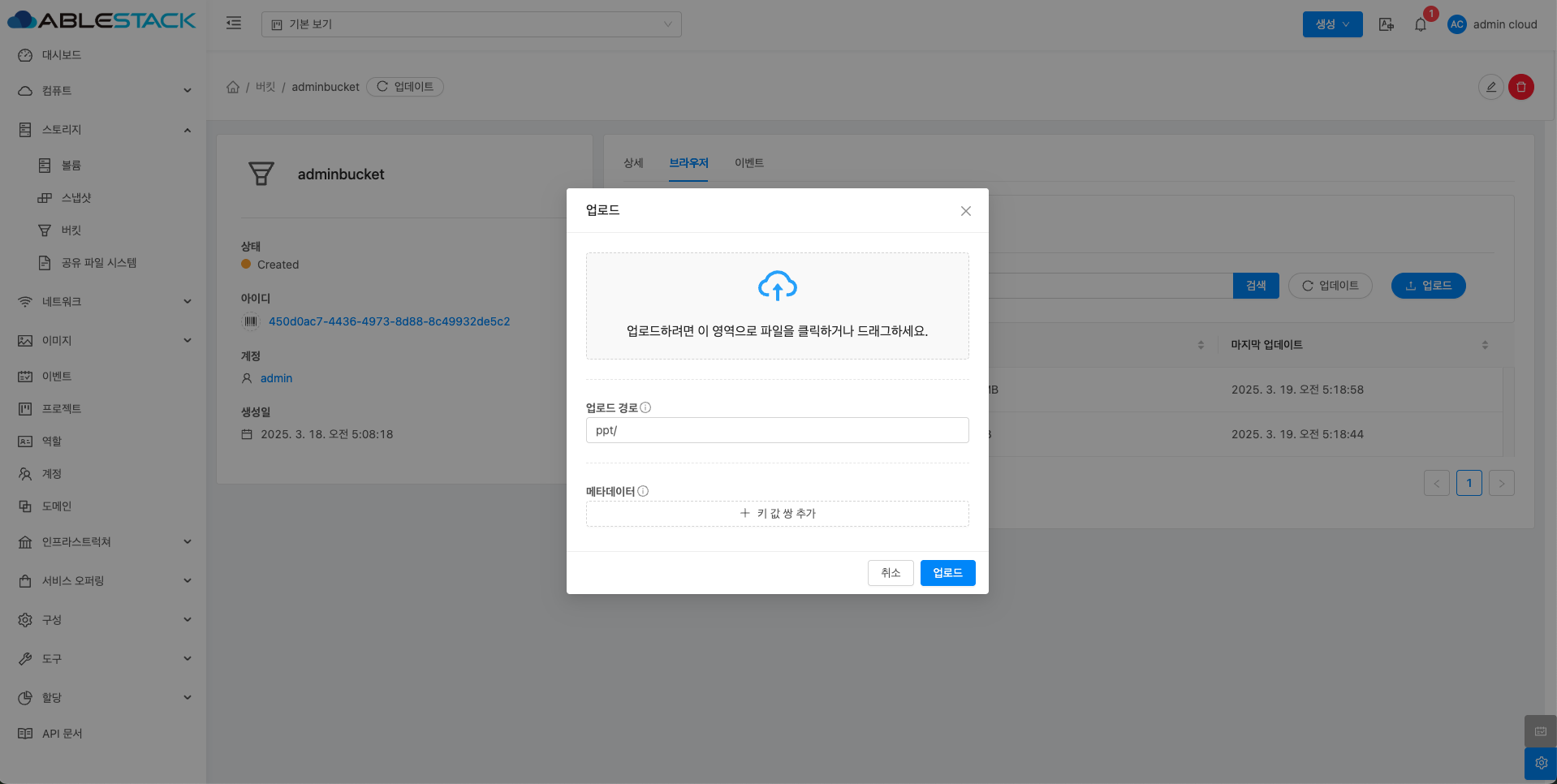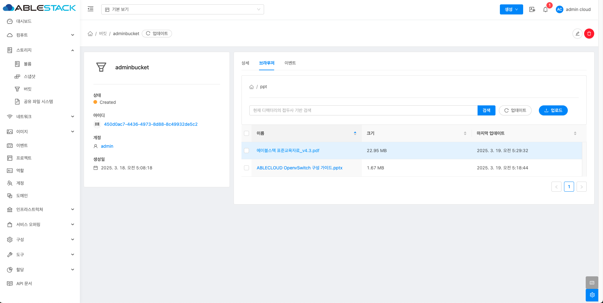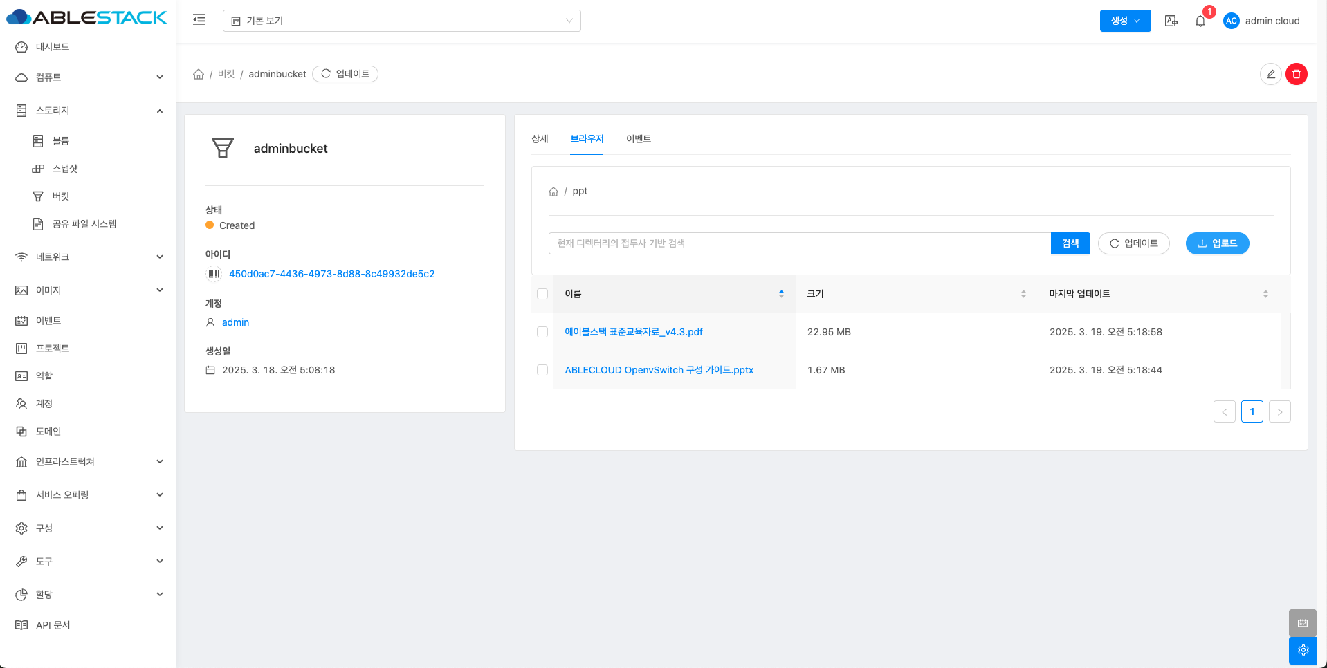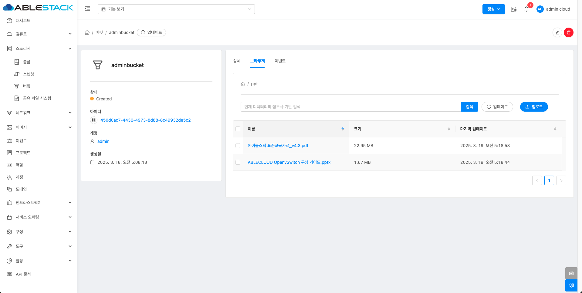 - 버킷 목록 조회에서 확인하고 싶은 버킷 목록을 조회합니다. 버킷에 대한 상세 정보를 확인하는 화면입니다. 해당 버킷에 대한 크기, UUID, 이름 등 상세 정보를 확인할 수 있습니다.
