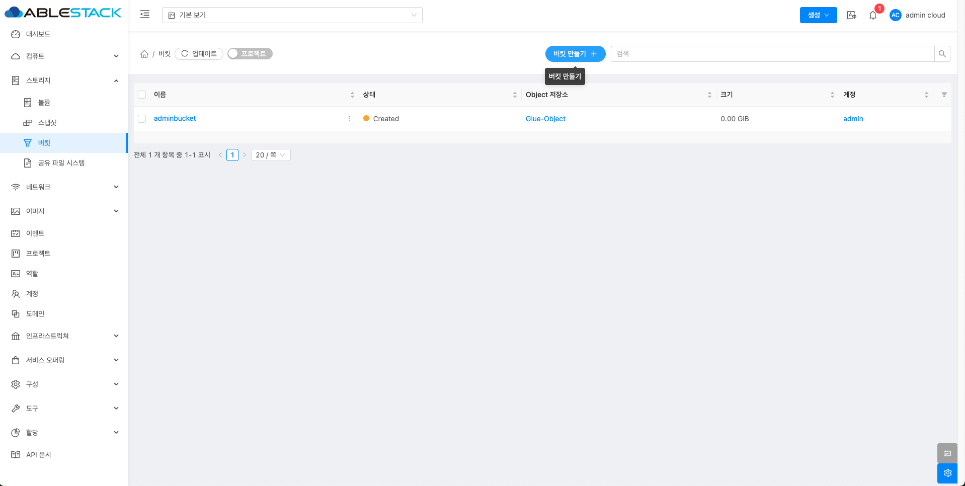 모든 버킷 목록을 확인하는 화면입니다. 생성된 버킷 목록을 확인하거나 정보를 확인할 수 있습니다.