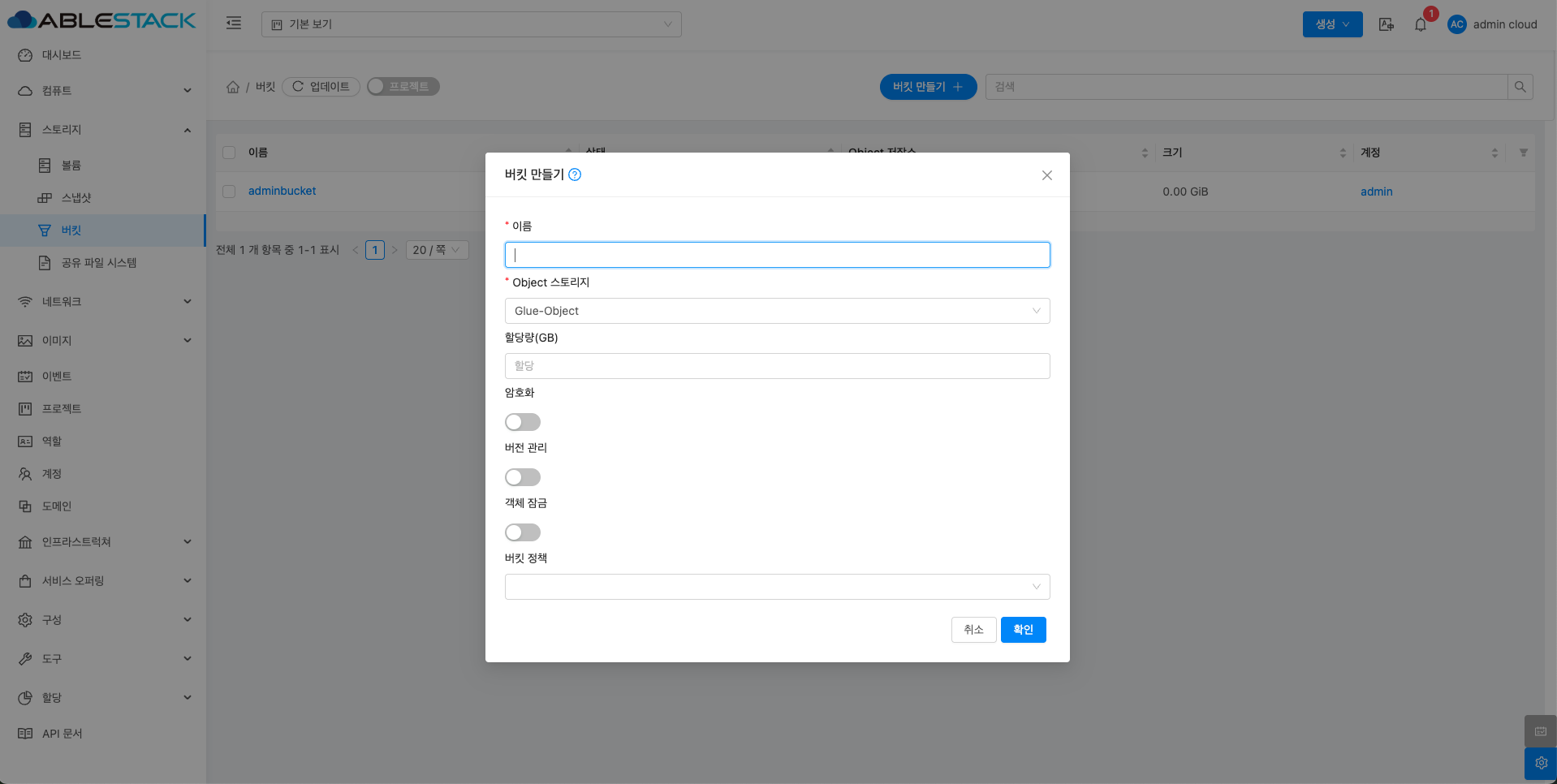 - 버킷 만들기 버튼을 클릭한 화면입니다.