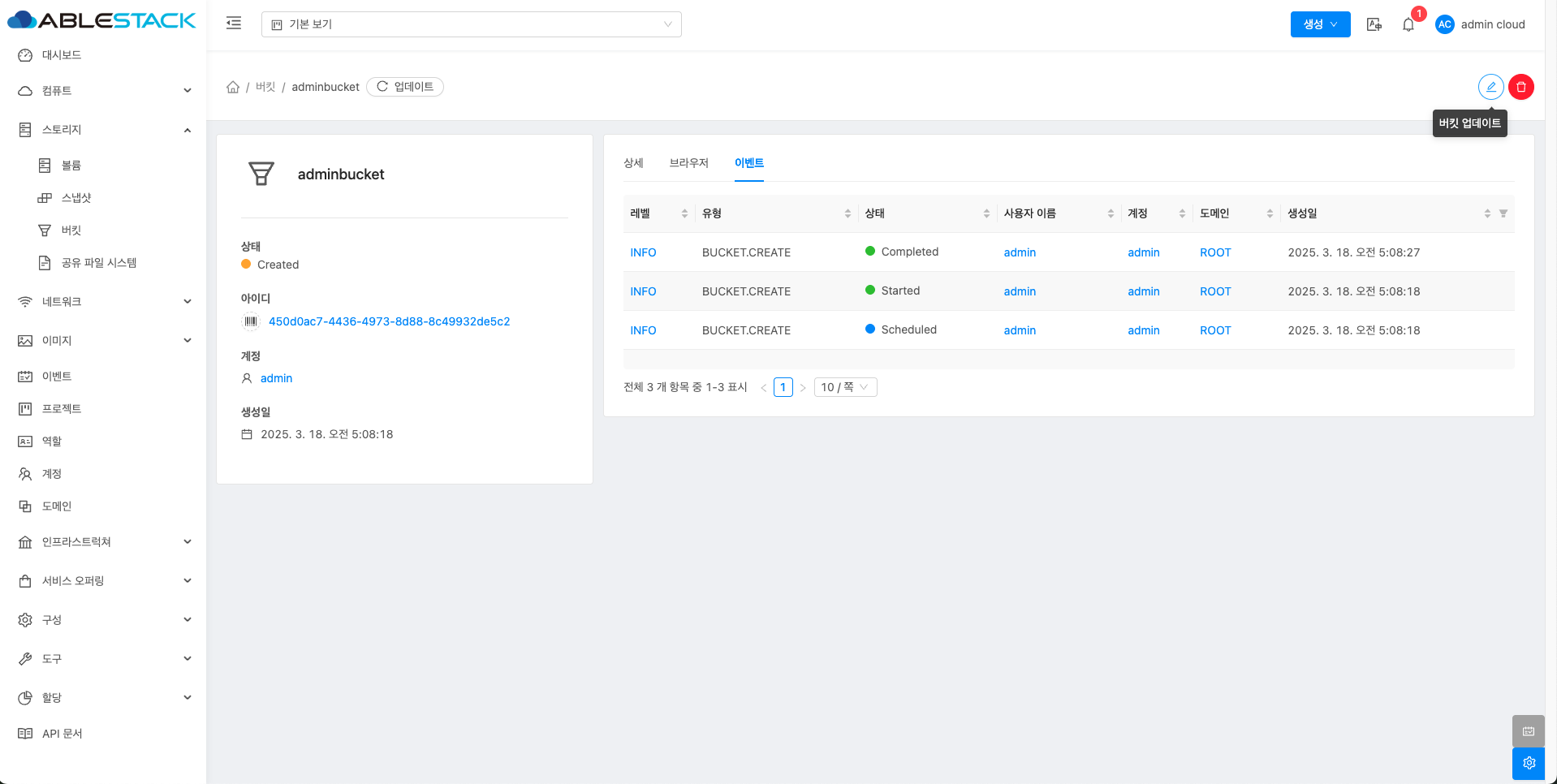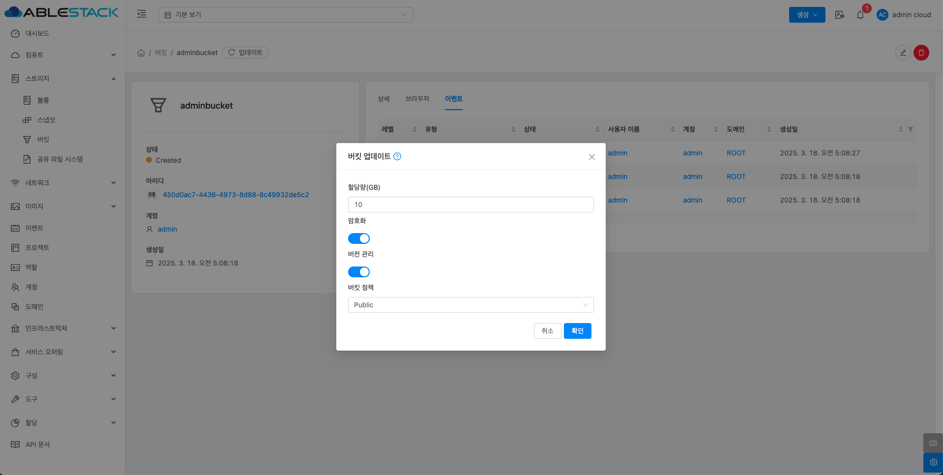- 버킷 업데이트 버튼을 클릭한 화면입니다.