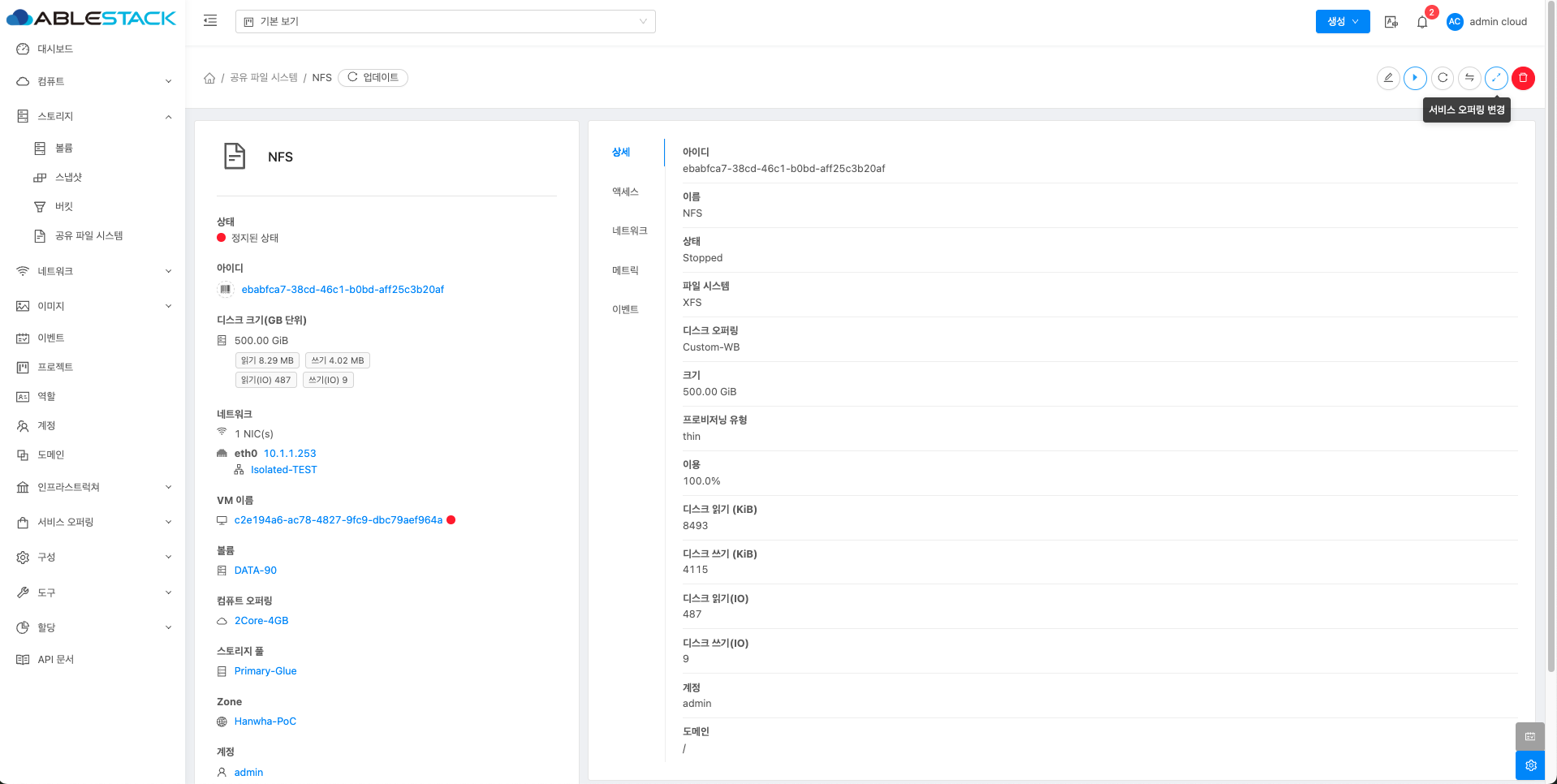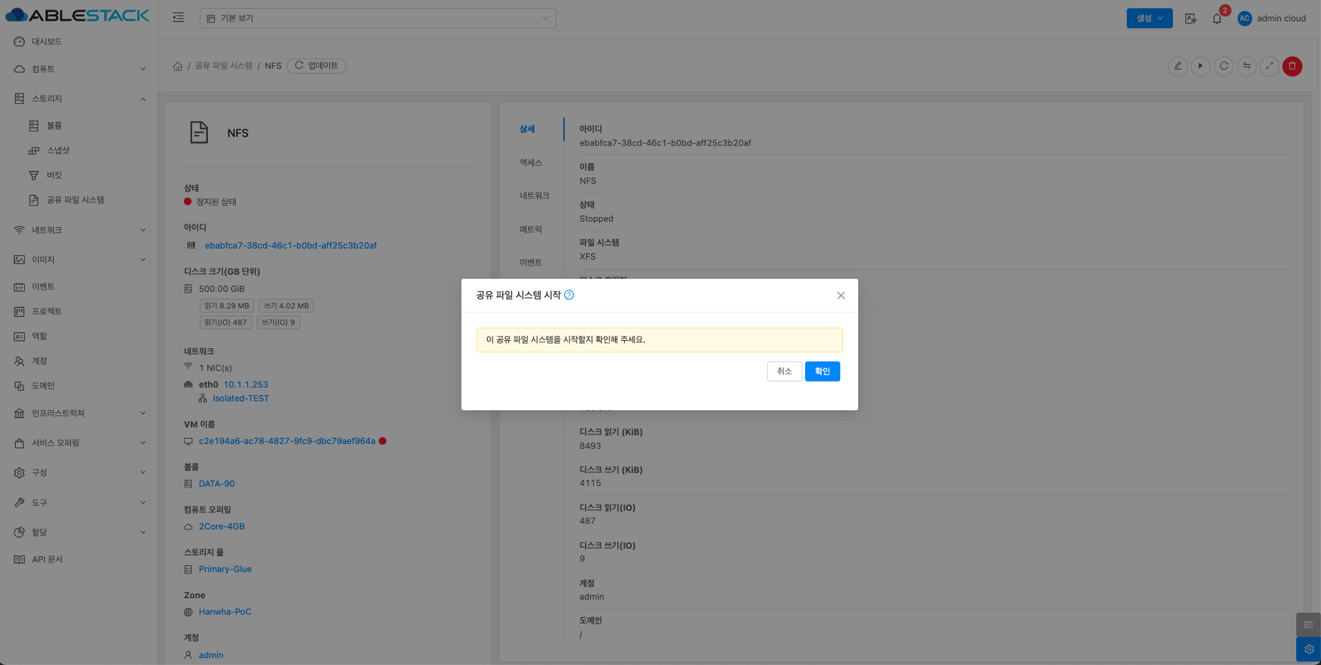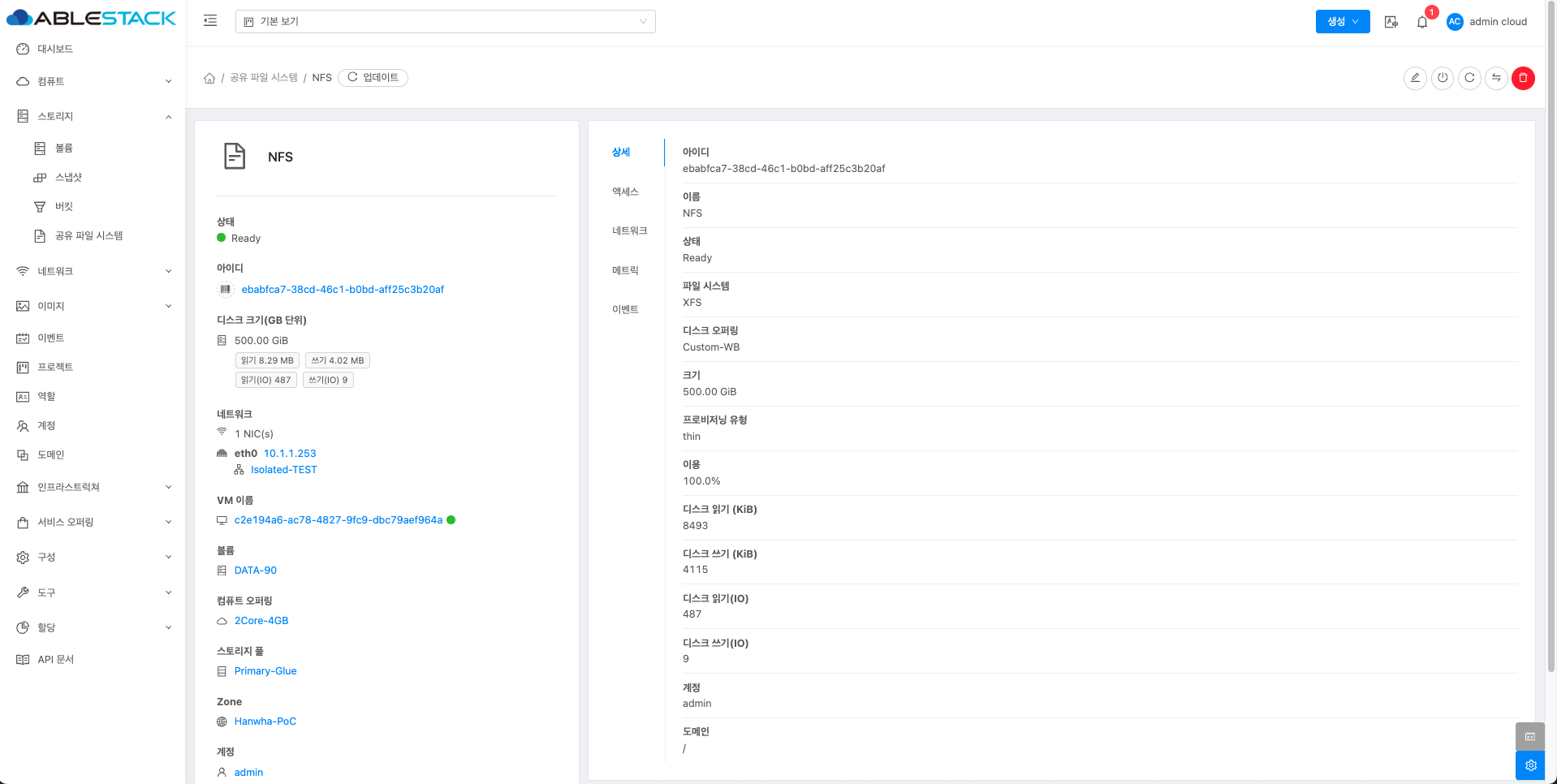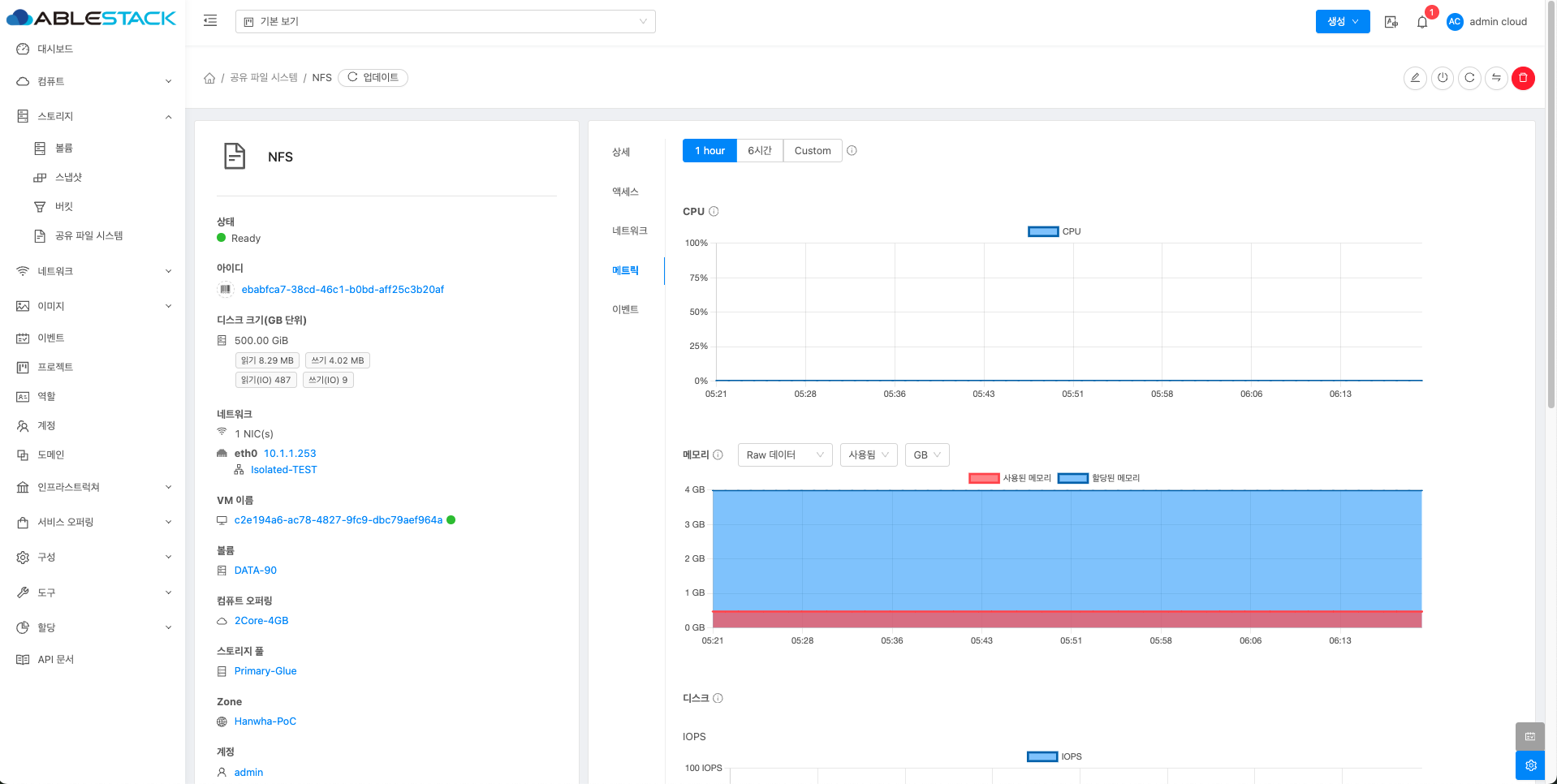 공유 파일 시스템에 대한 매트릭 정보를 확인하는 화면입니다. 해당 공유 파일 시스템에 대한 CPU, Memory, Network 등 할당량 및 사용량을 확인할 수 있습니다.