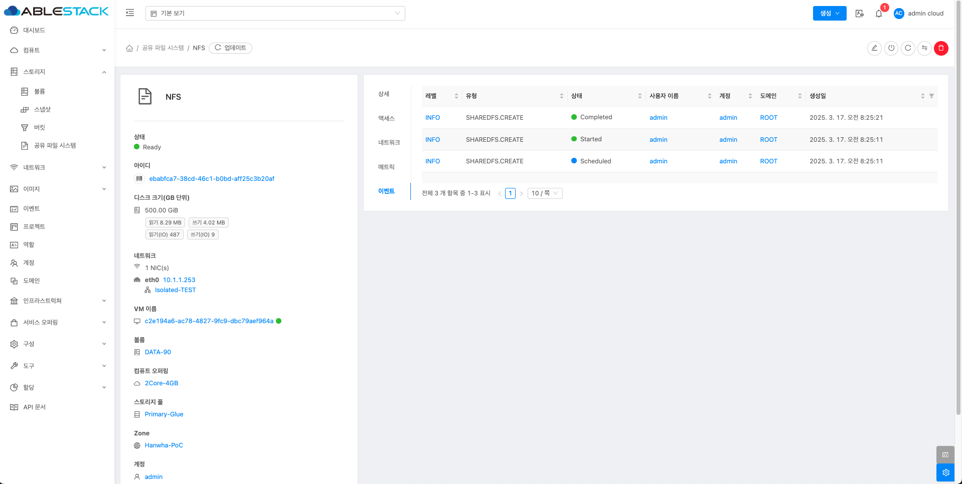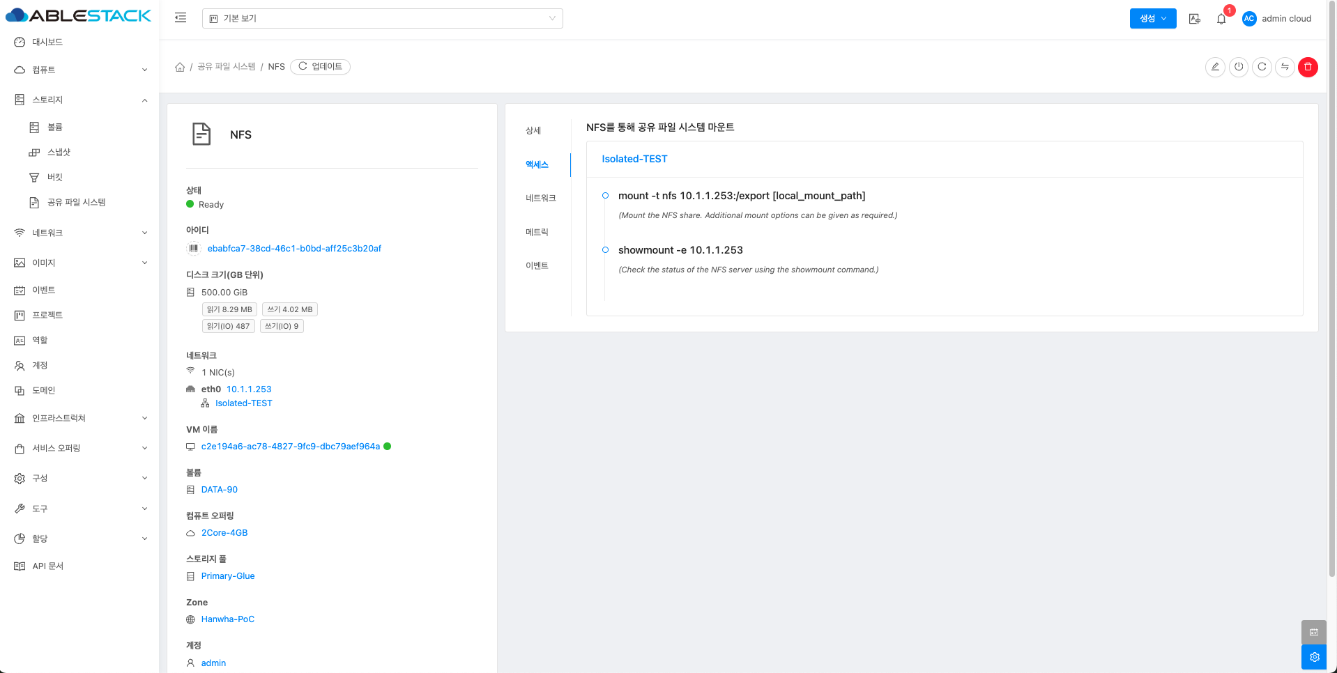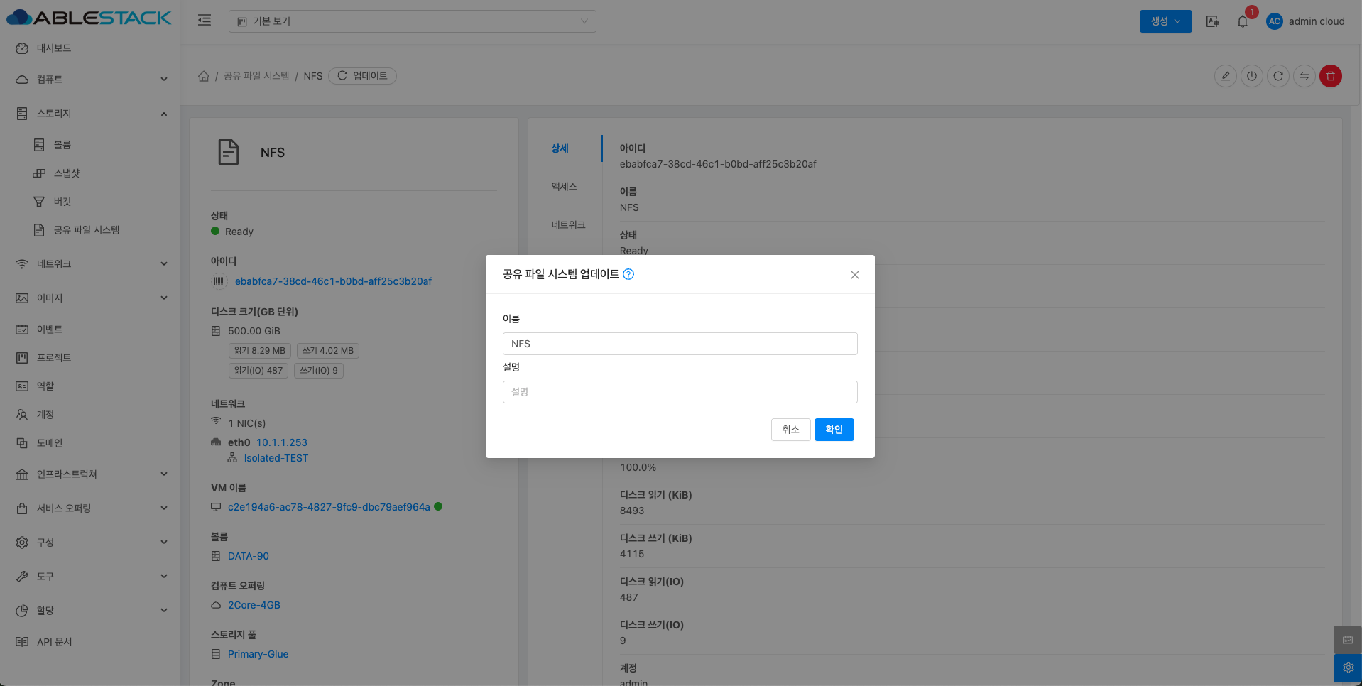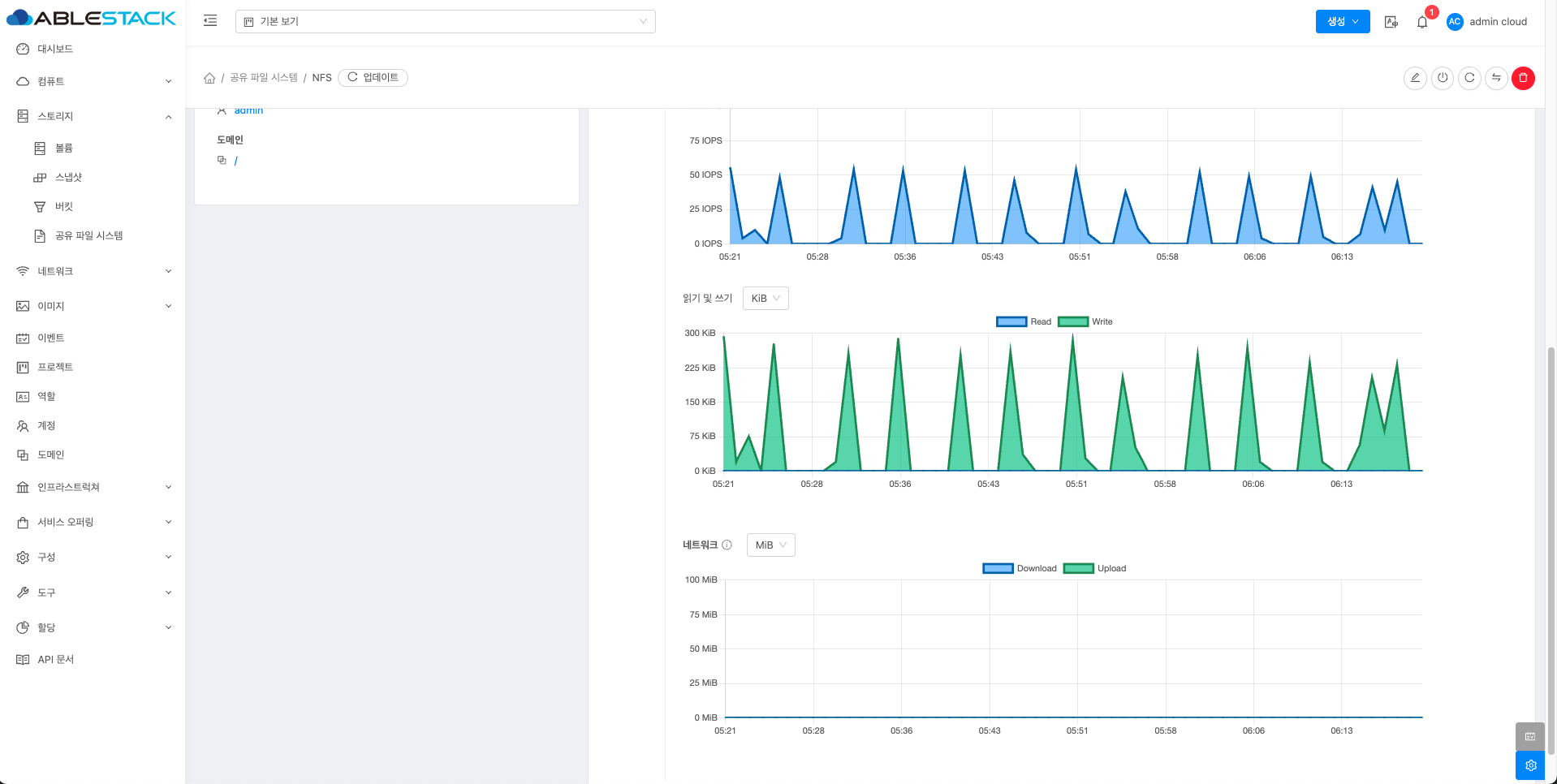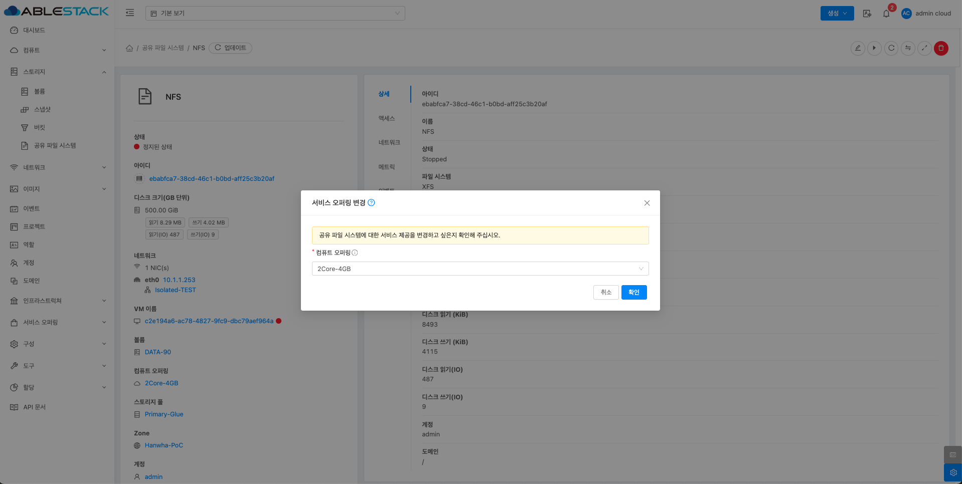 공유 파일 시스템에 대한 매트릭 정보를 확인하는 화면입니다. 해당 공유 파일 시스템에 대한 CPU, Memory, Network 등 할당량 및 사용량을 확인할 수 있습니다.