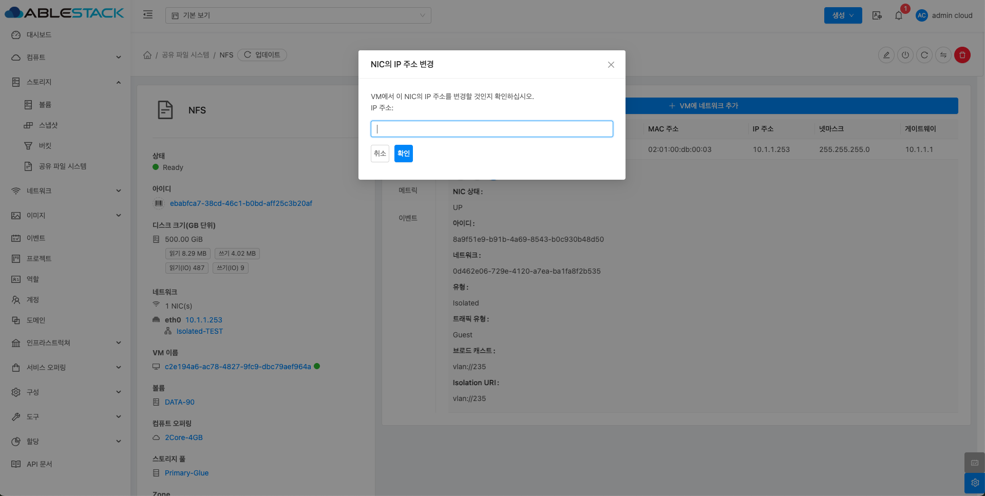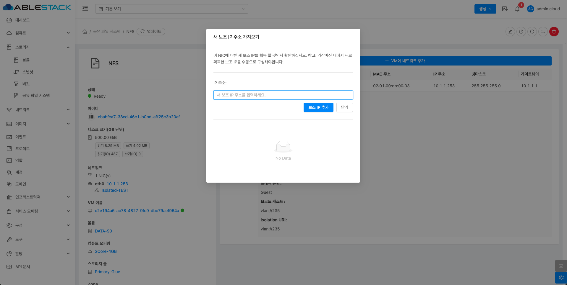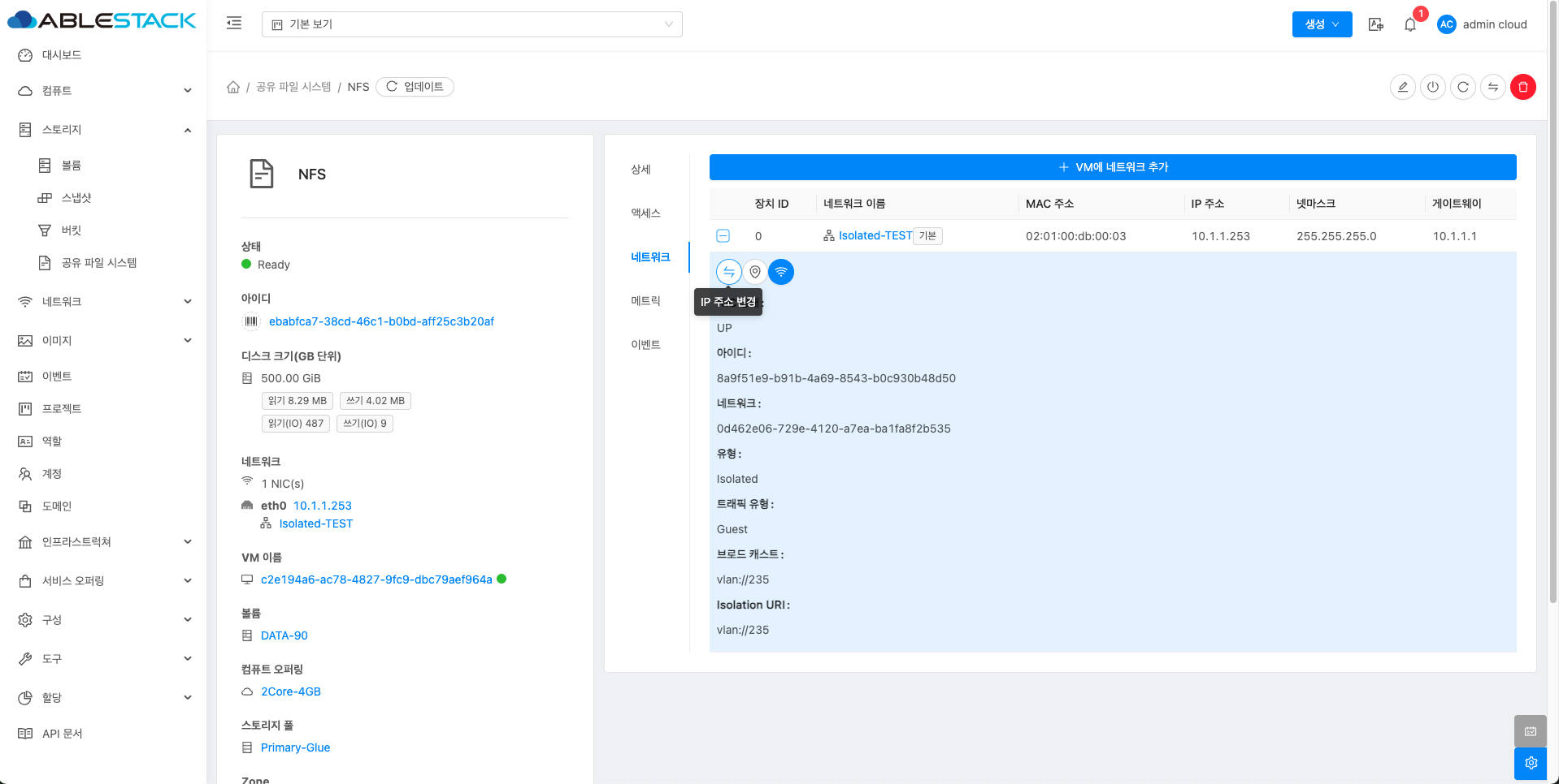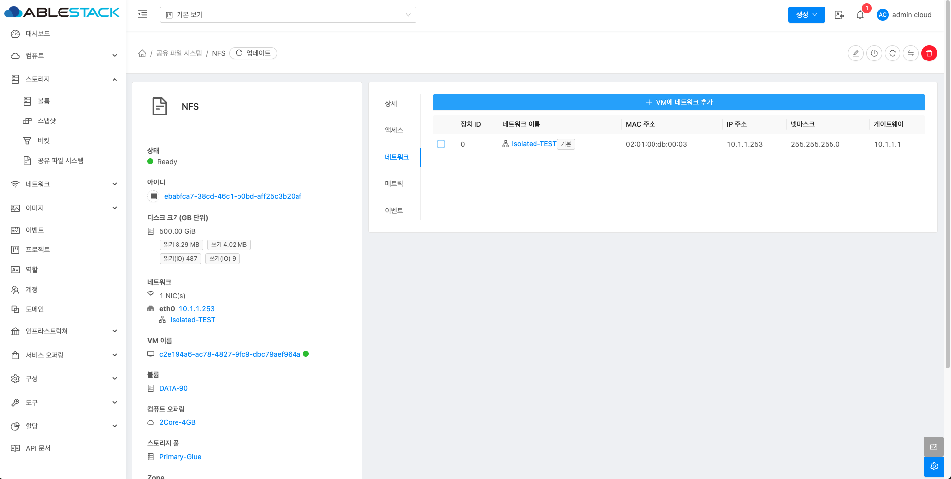 공유 파일 시스템에 대한 매트릭 정보를 확인하는 화면입니다. 해당 공유 파일 시스템에 대한 CPU, Memory, Network 등 할당량 및 사용량을 확인할 수 있습니다.