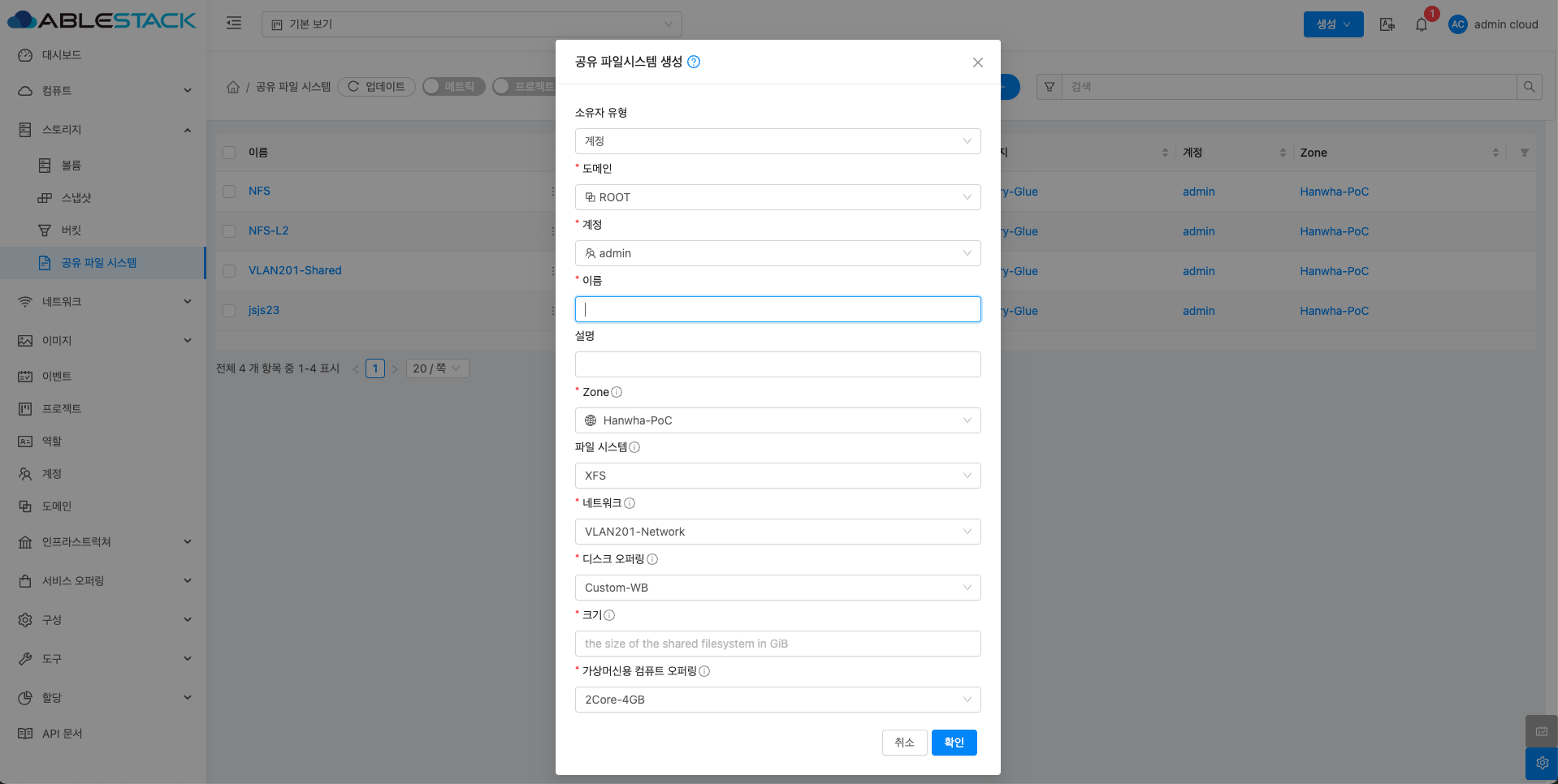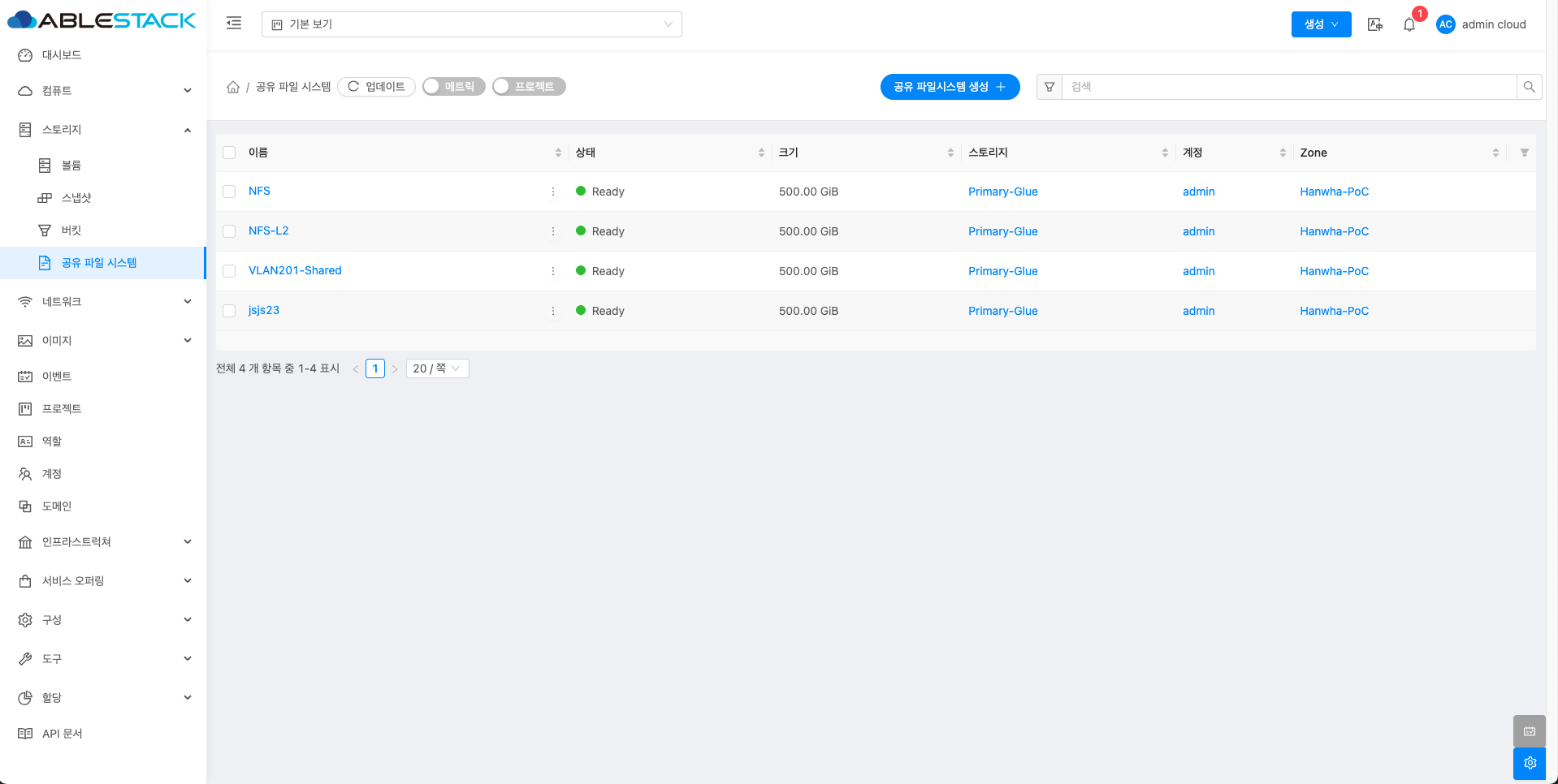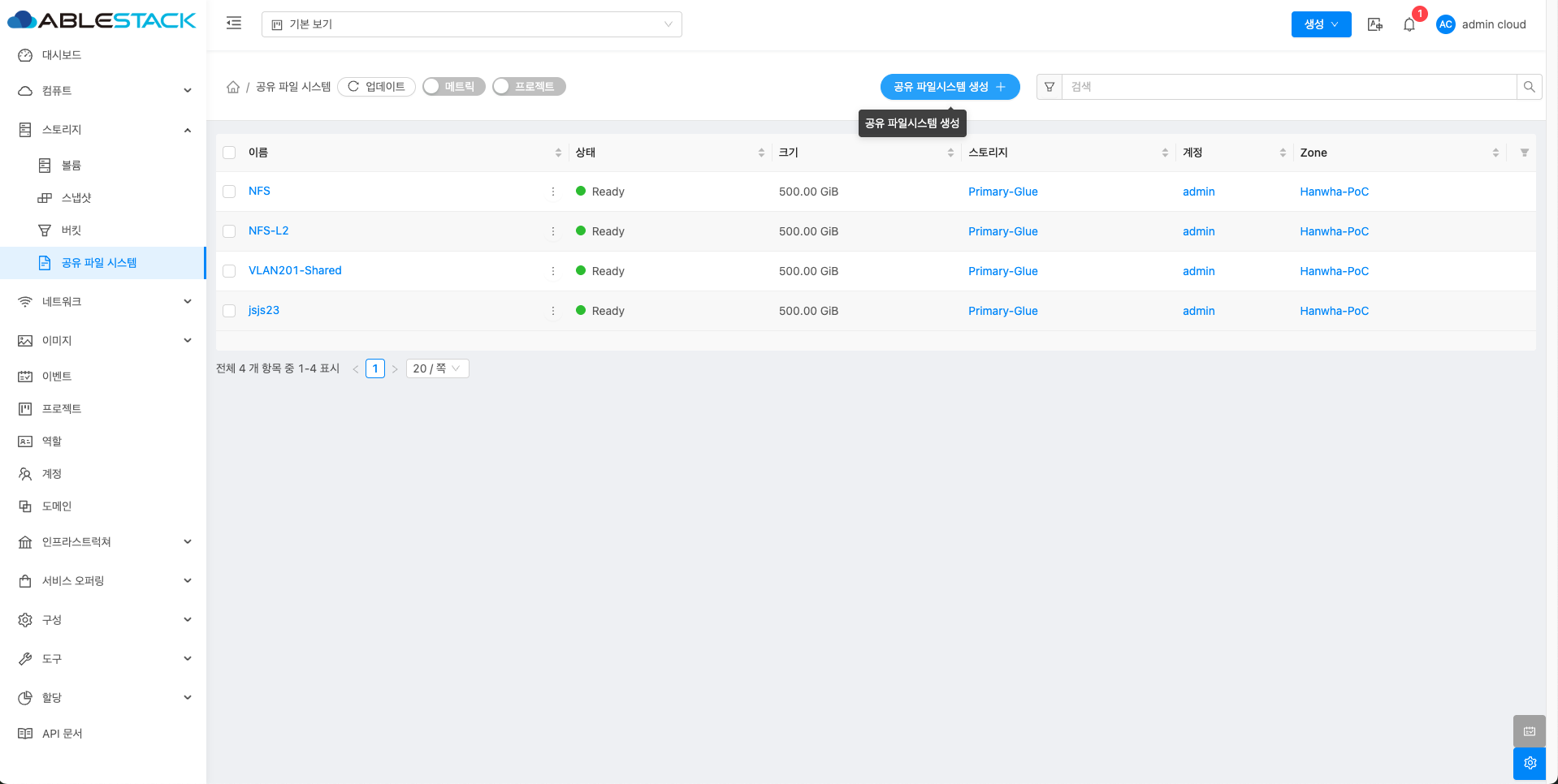 공유 파일 시스템 목록을 확인하는 화면입니다. 생성된 공유 파일 시스템 목록을 확인하거나 공유 파일 시스템 생성 버튼을 클릭하여 공유 파일 시스템을 생성하실 수 있습니다.