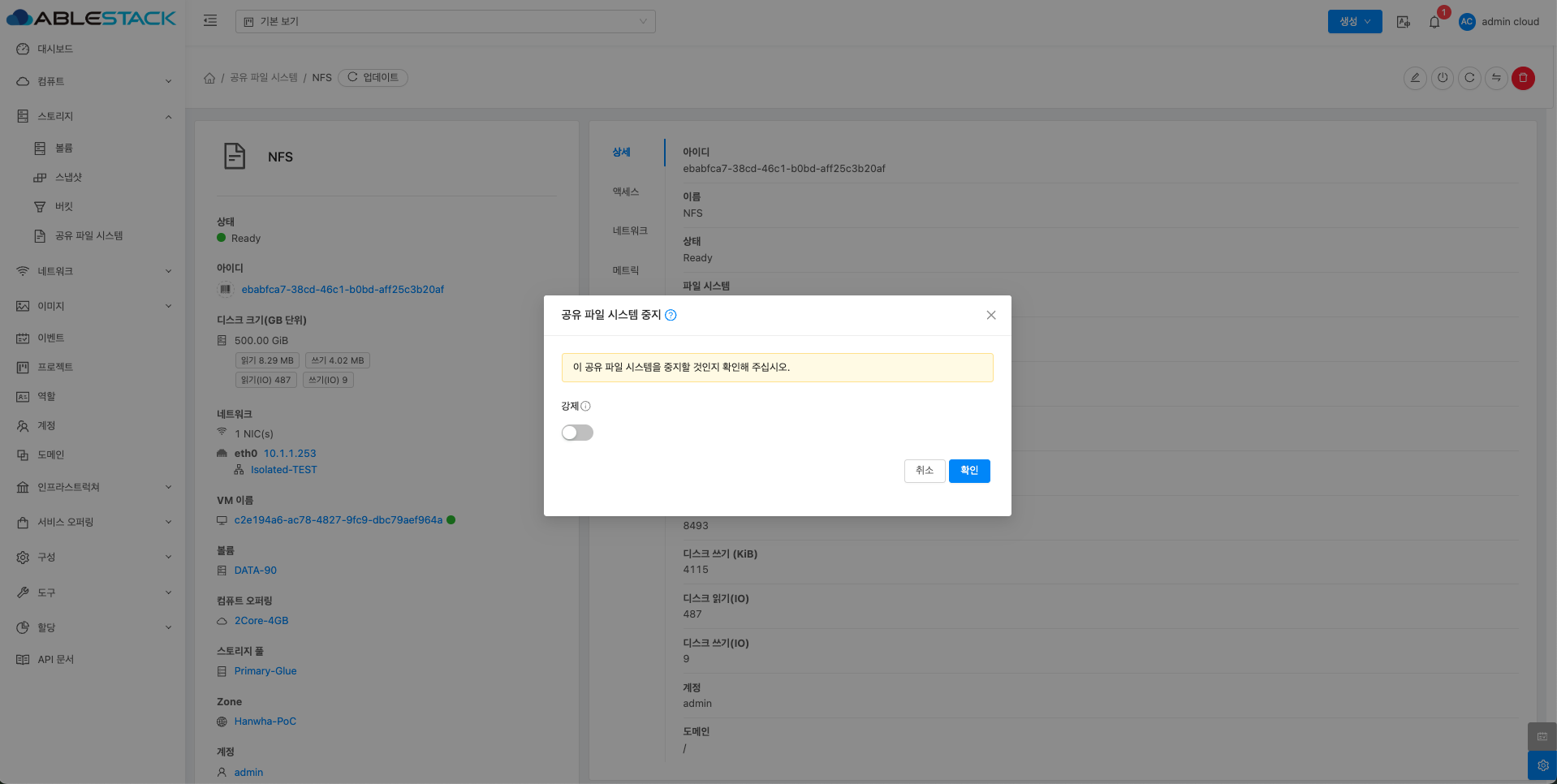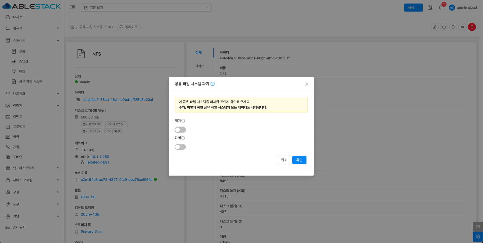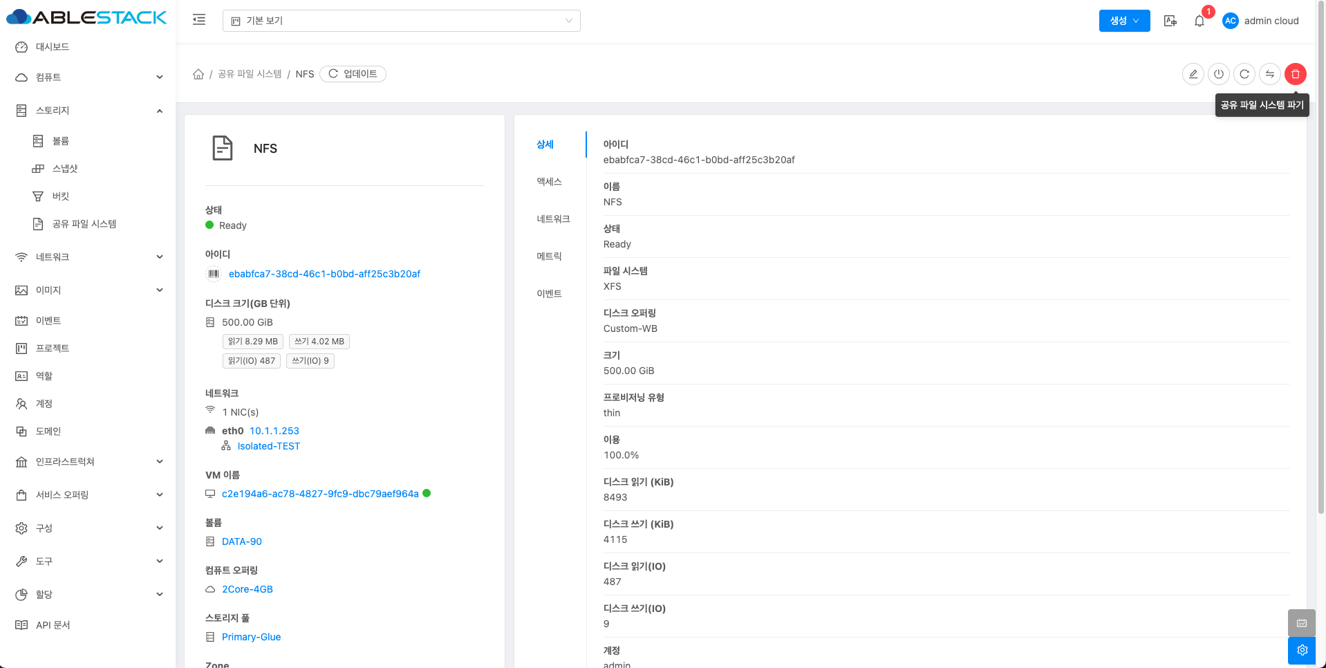 - 공유 파일 시스템 상세 오른쪽 상단의 공유 파일 시스템 파기 버튼을 클릭합니다.