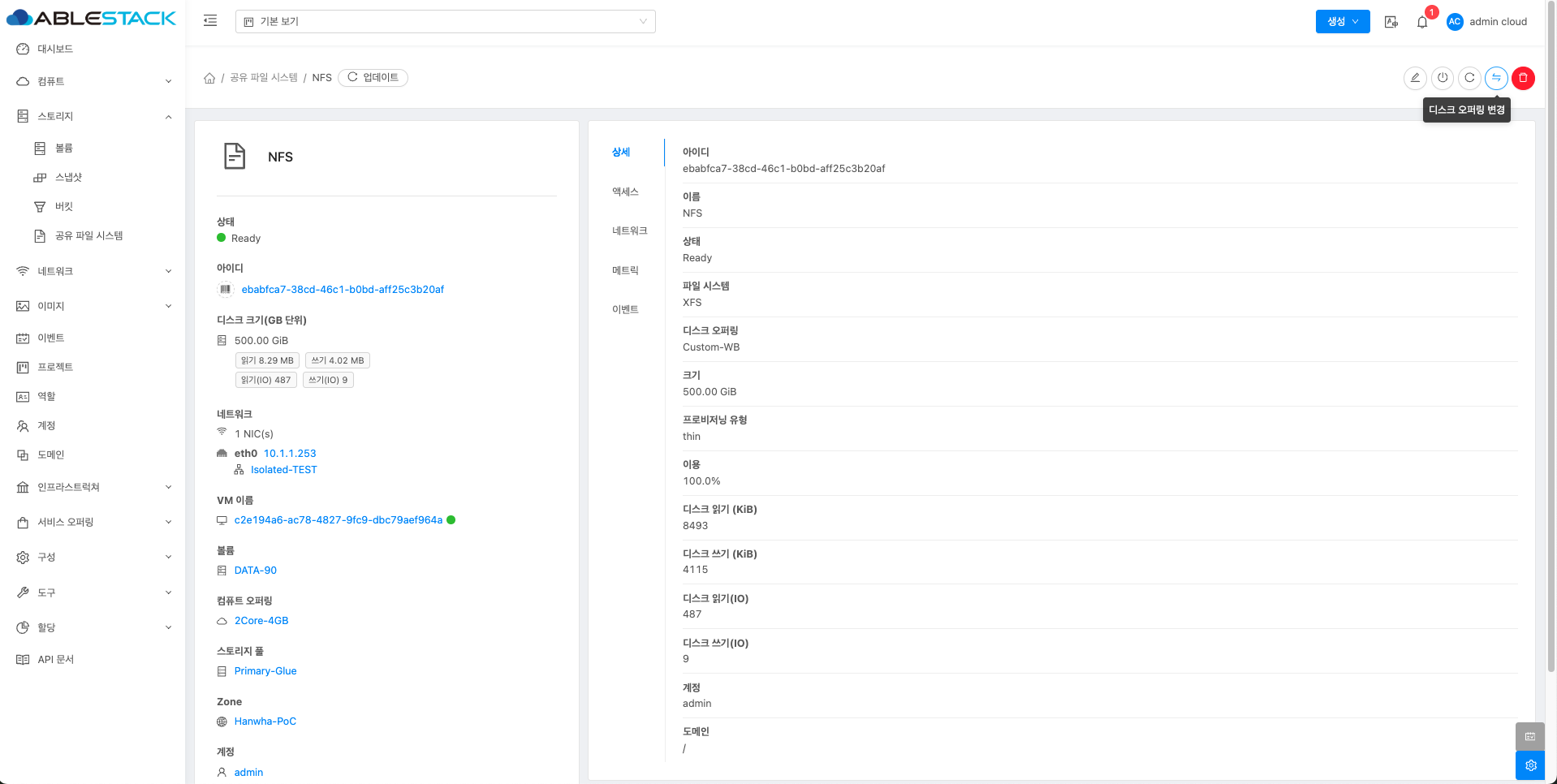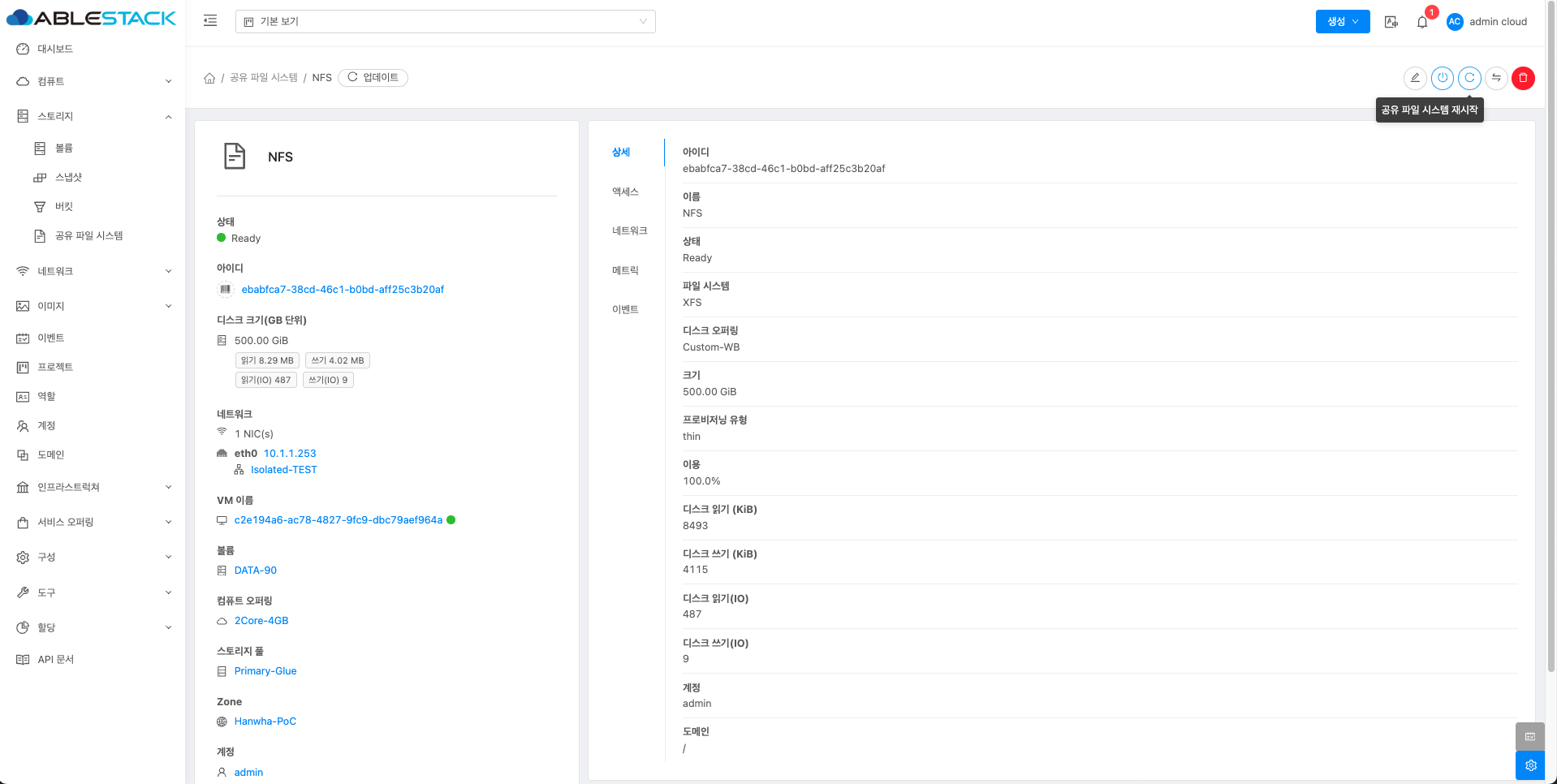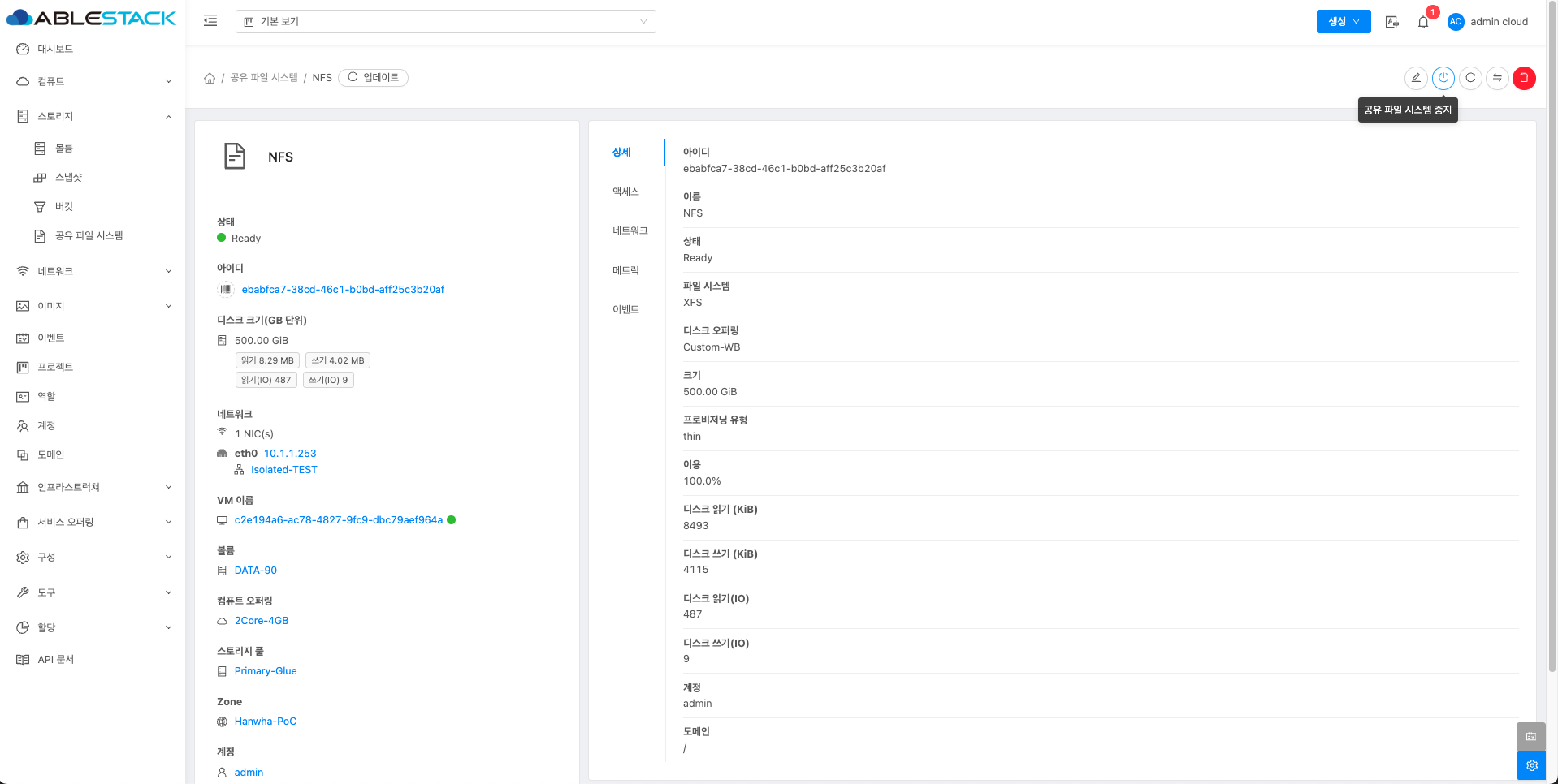 매트릭 버튼을 활성화할 때 해당 디스크에 대한 상세 정보를 공유 파일 시스템 목록에서 확인할 수 있습니다.