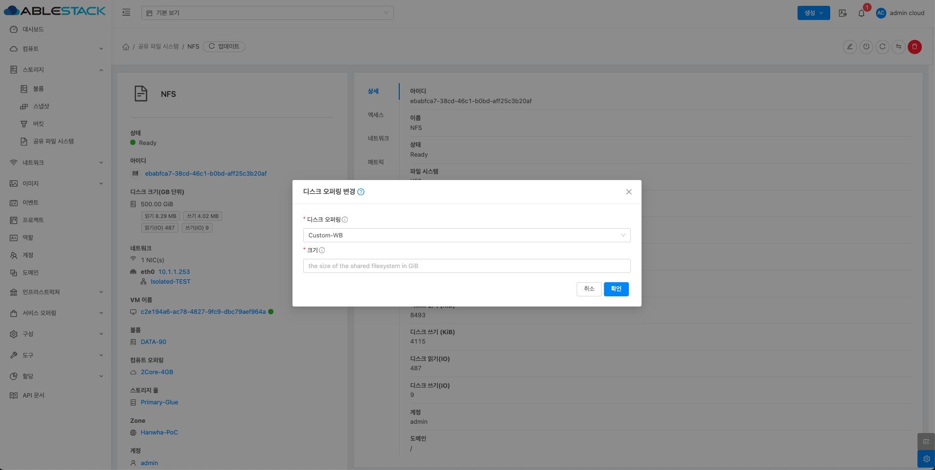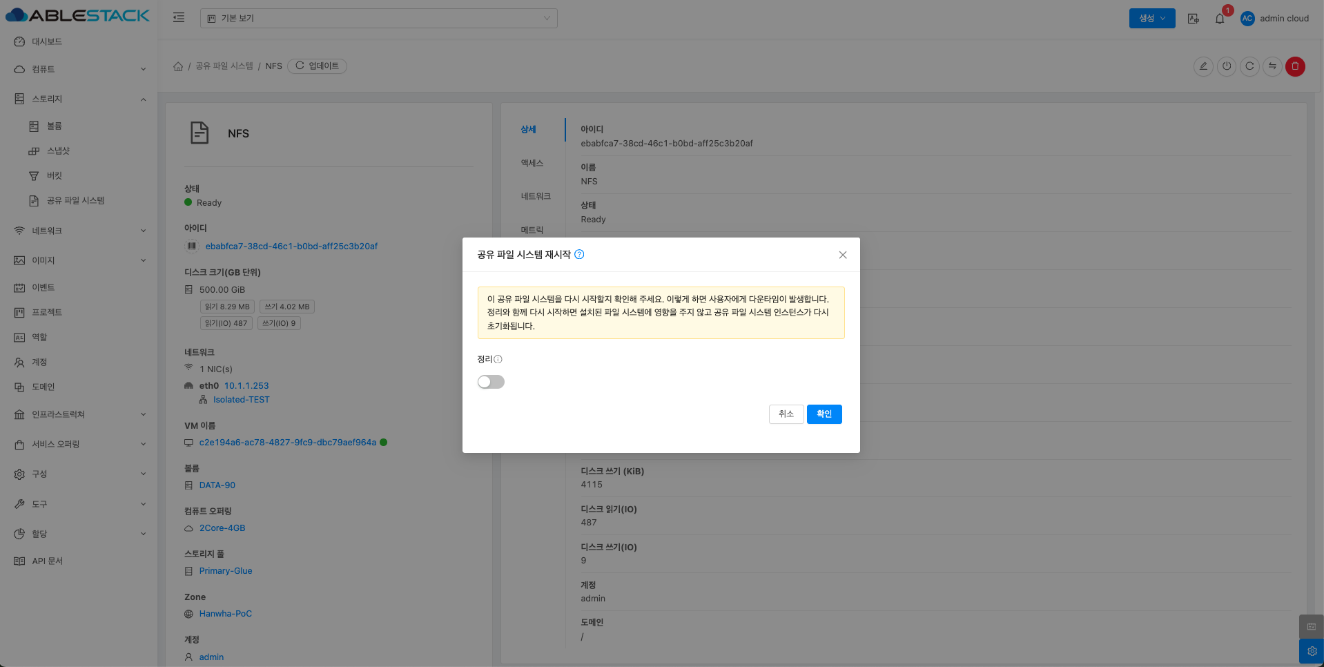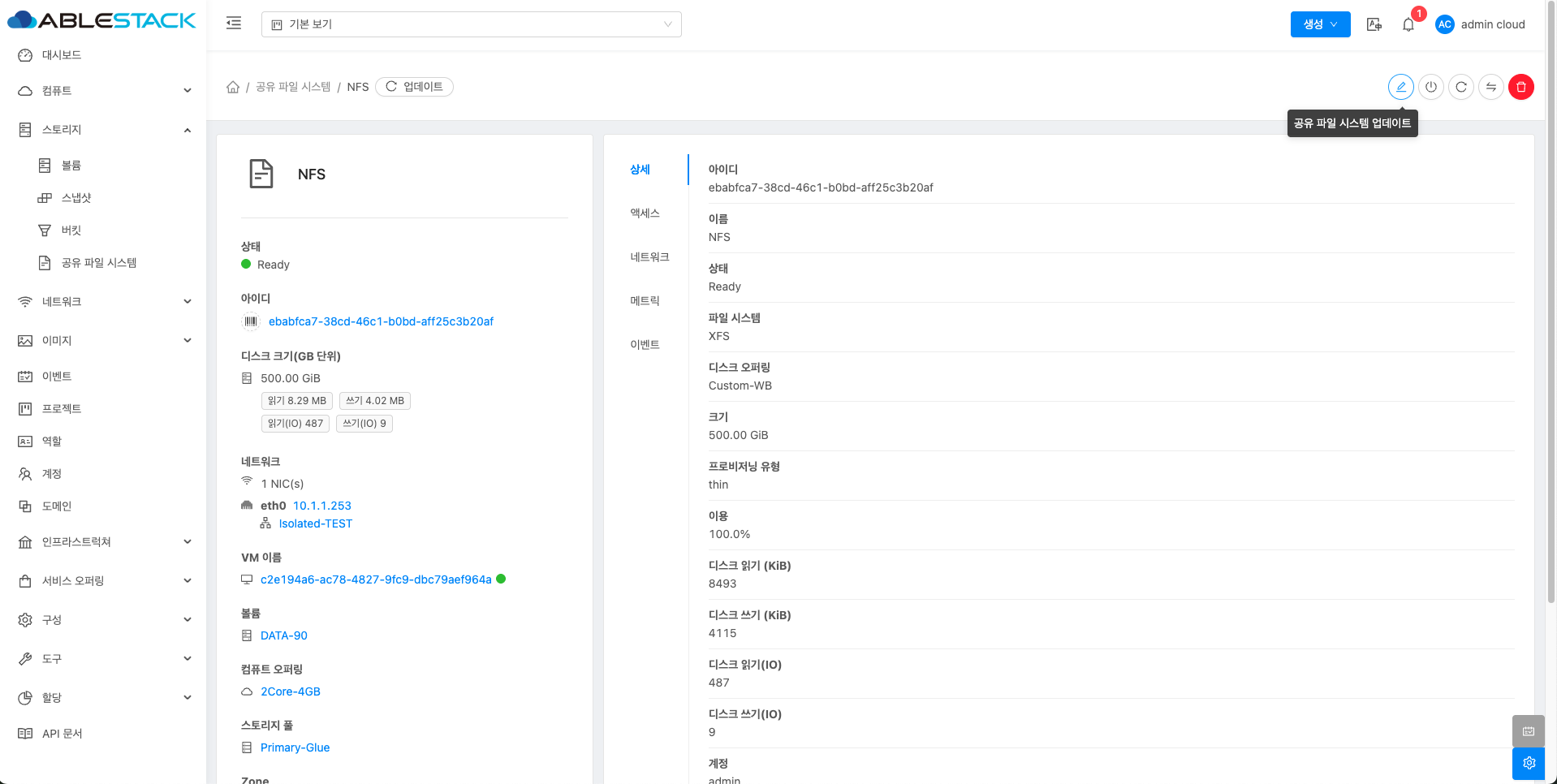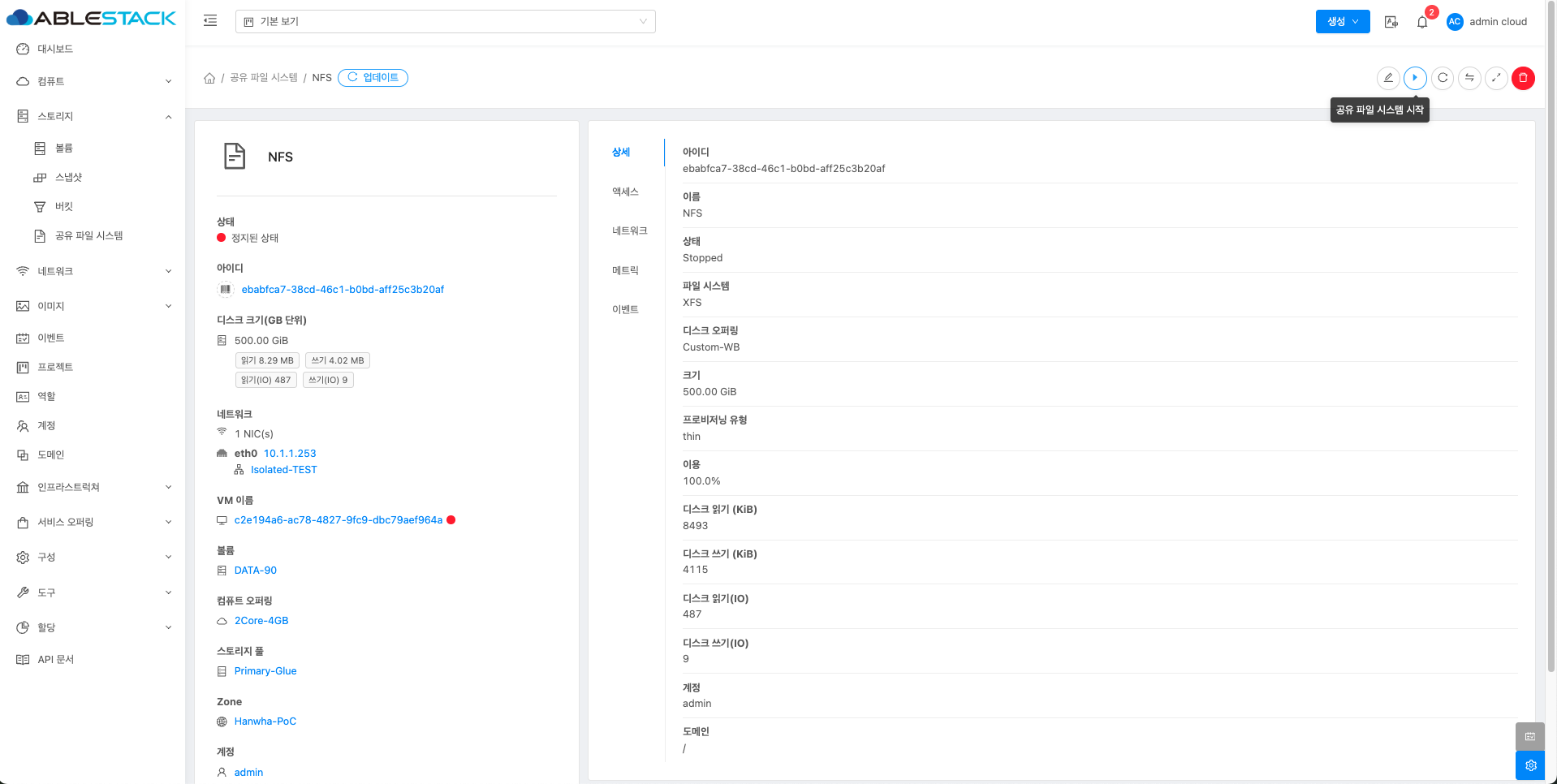 매트릭 버튼을 활성화할 때 해당 디스크에 대한 상세 정보를 공유 파일 시스템 목록에서 확인할 수 있습니다.