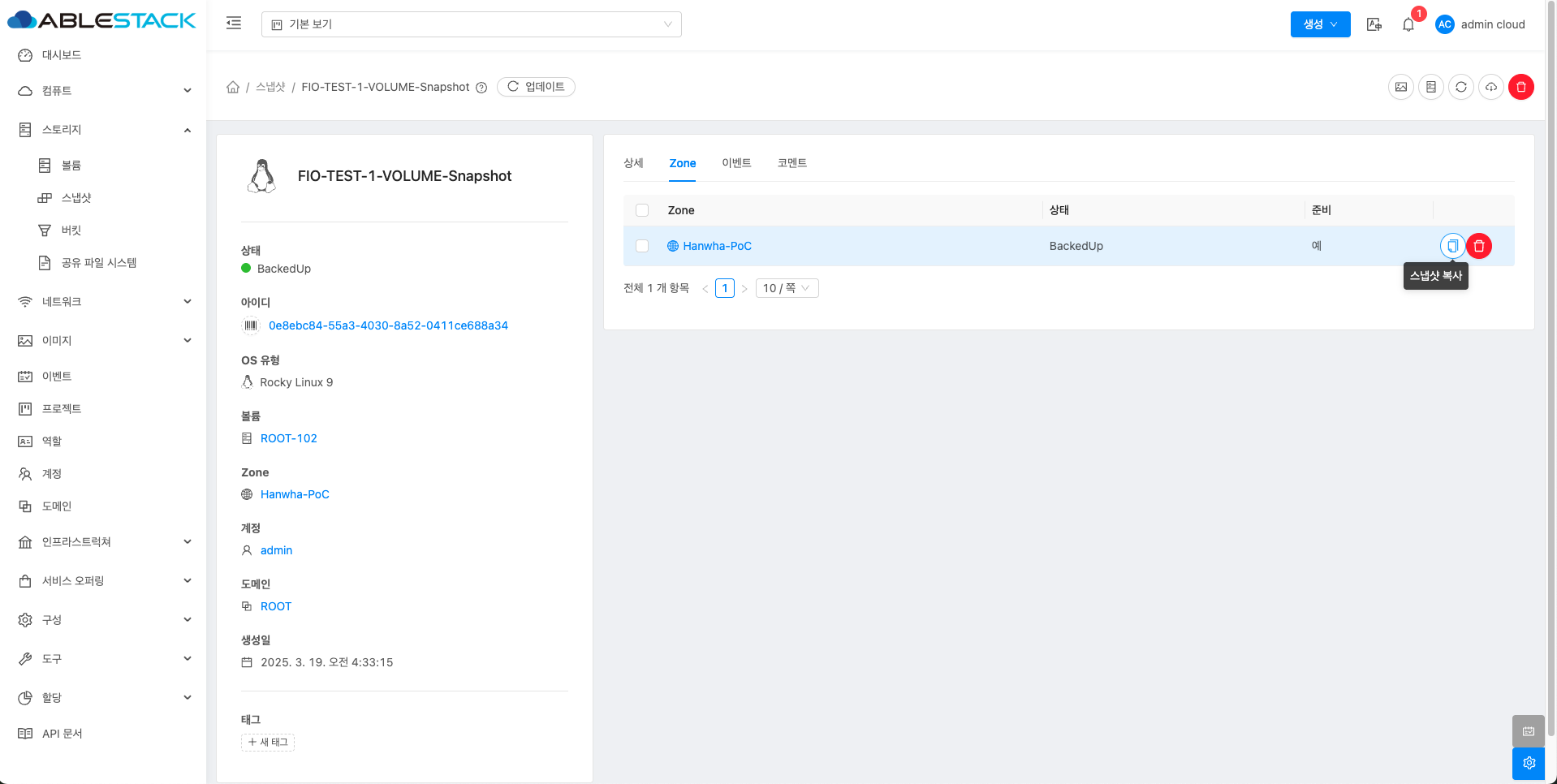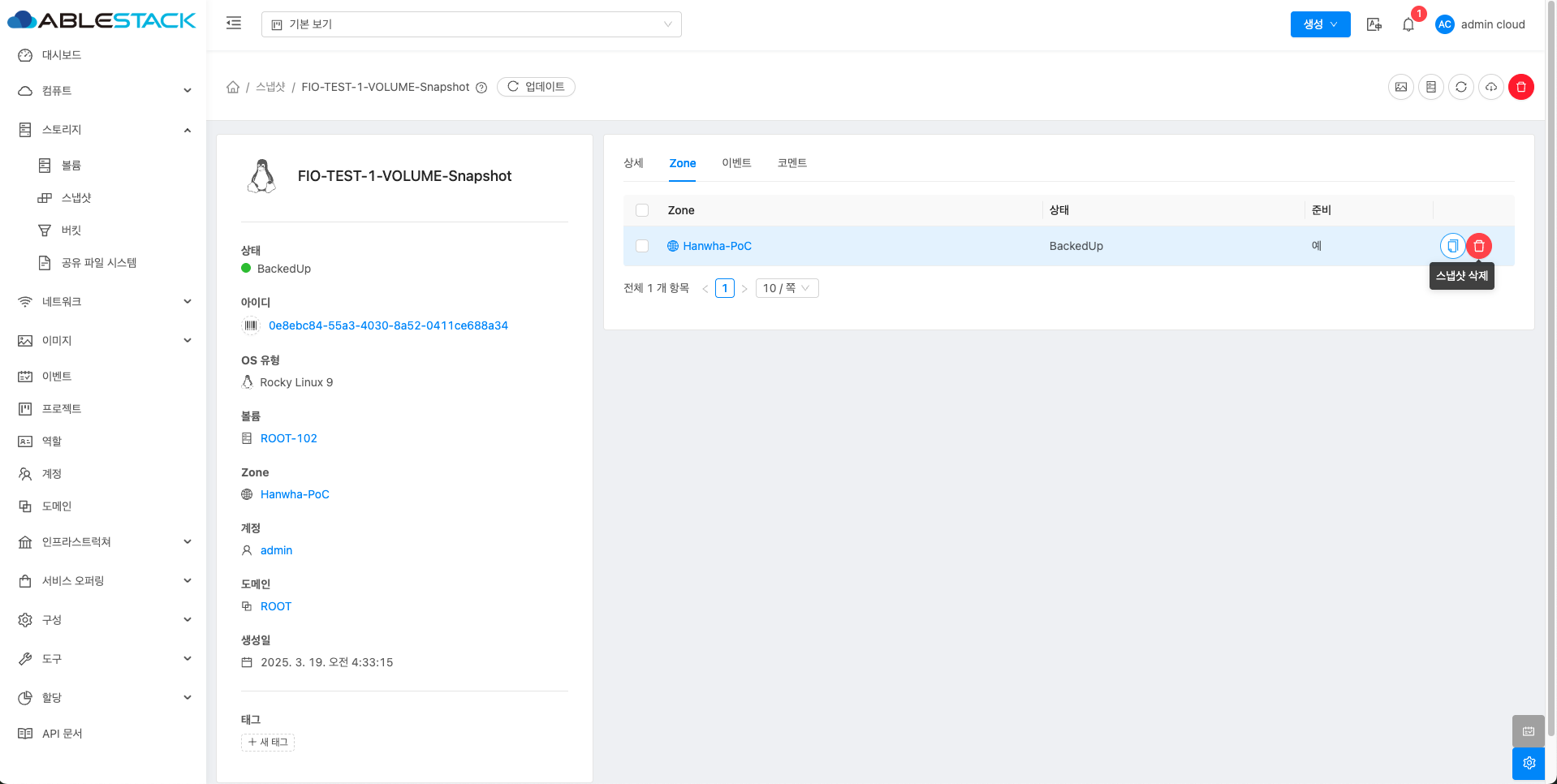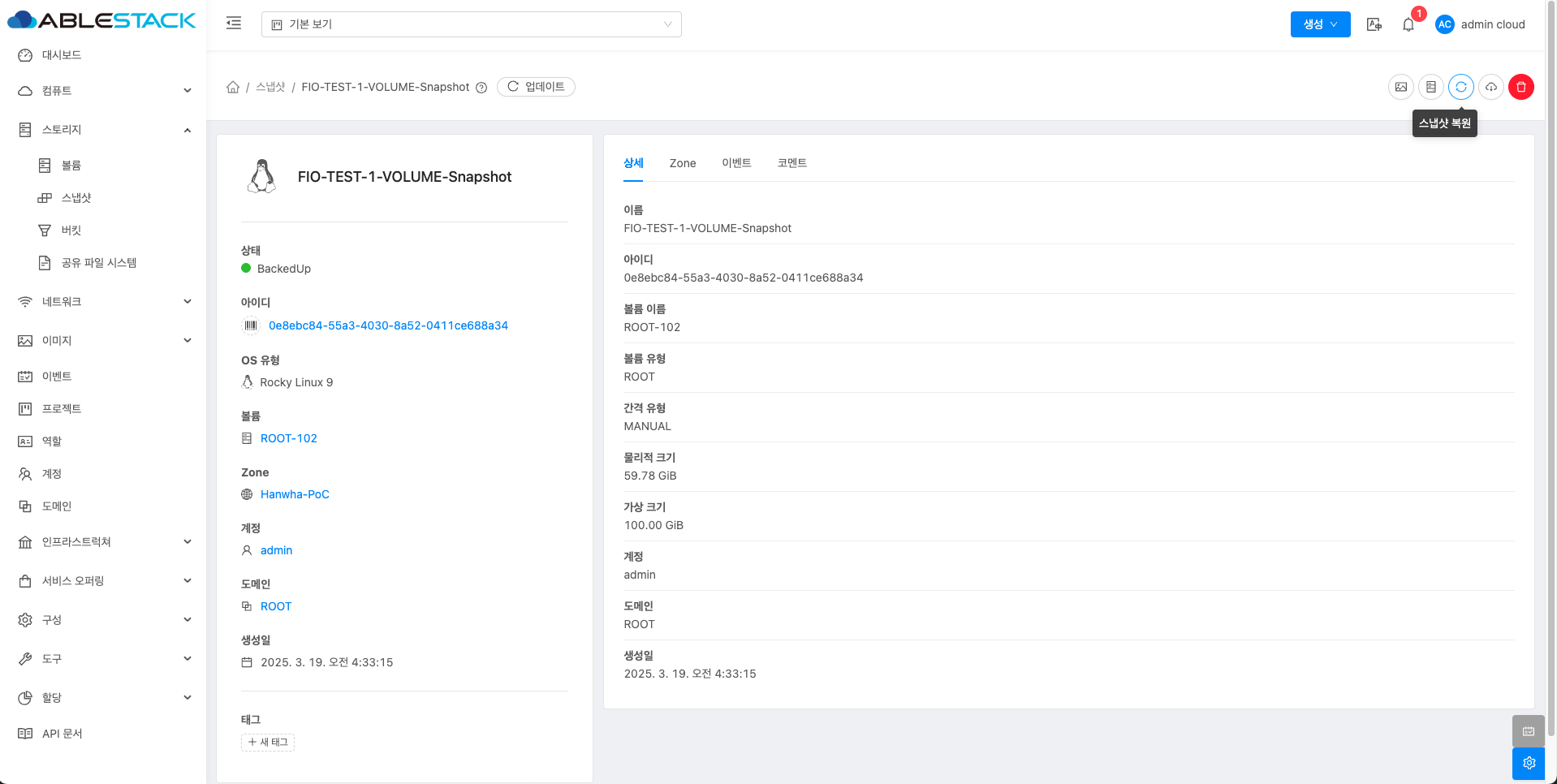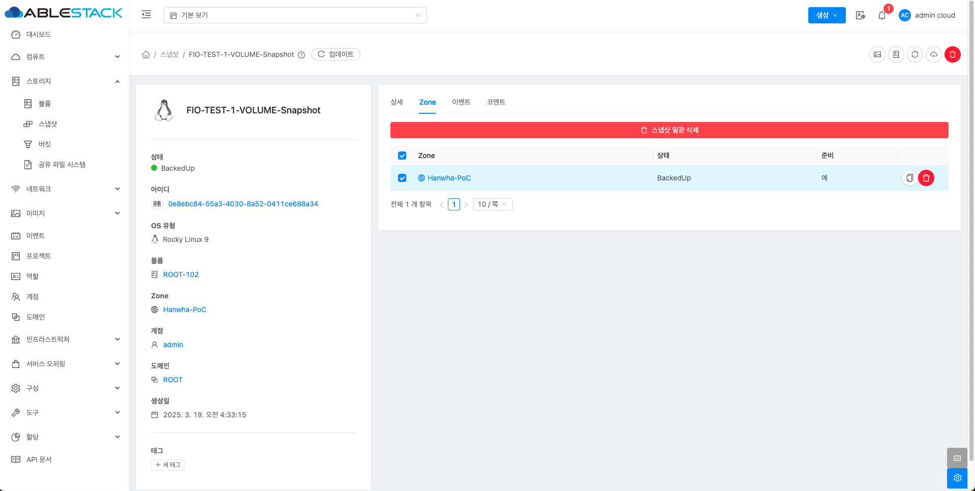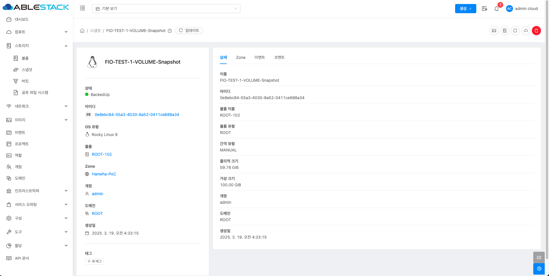 - 생성된 볼륨 스냅샷은 스토리지의 스냅샷 목록에서 확인하실 수 있습니다.